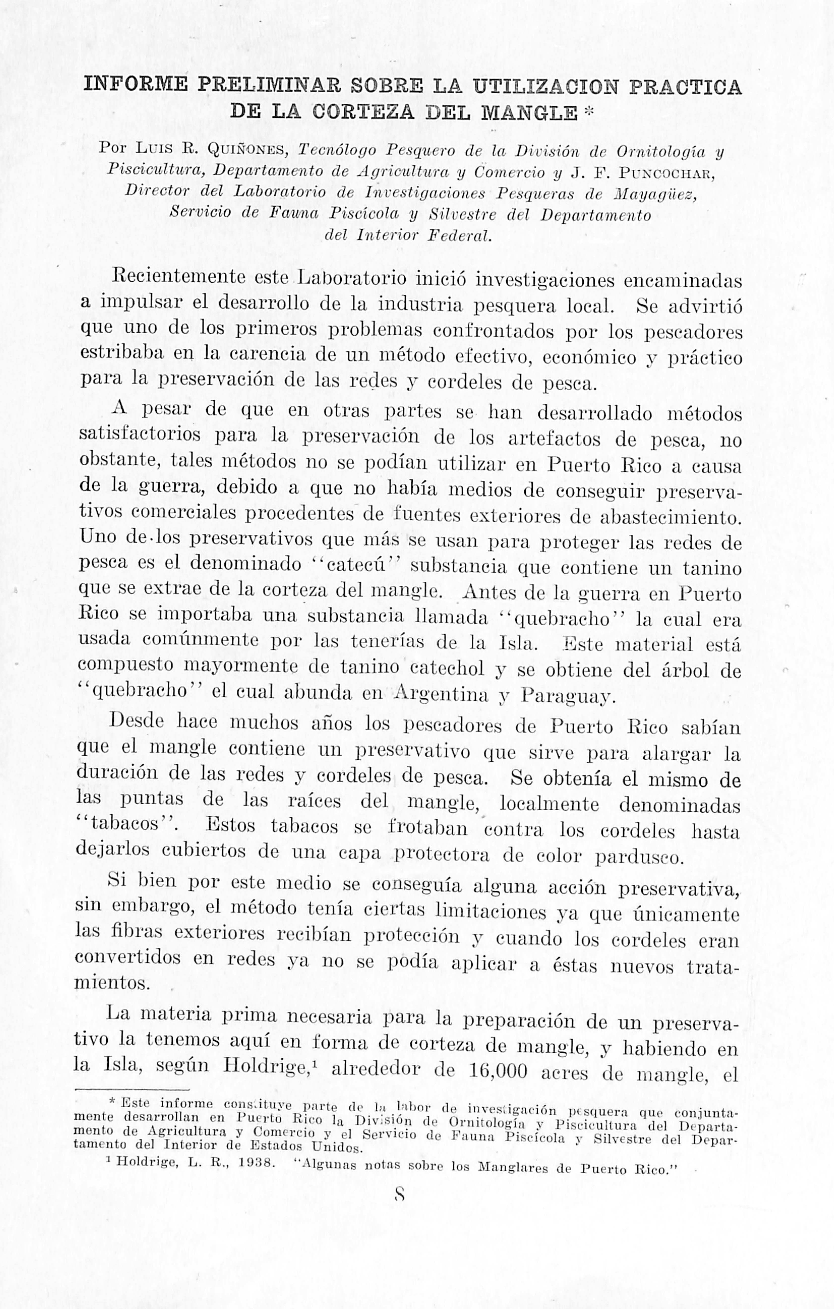 A pesar de que en otras partes se han desarrollado métodos satisfactorios para la preservación de los artefactos de pesca, no obstante, tales métodos no se podían utilizar en Puerto Rico a causa de la guerra, debido a que no había medios de conseguir preserva tivos comerciales procedentes de fuentes exteriores de abastecimiento. Uno dedos preservativos que más se usan para proteger las redes de pesca es el denominado "eatecú" substancia que contiene un tanino que se extrae de la corteza del mangle. Antes de la guerra en Puerto Rico se importaba una substancia llamada "quebracho" la cual era usada comúnmente jDor las tenerías de la Isla. Usté material está compuesto mayormente de tanino catechol y se obtiene del árbol de "quebracho" el cual abunda en Argentina y Paraguay.