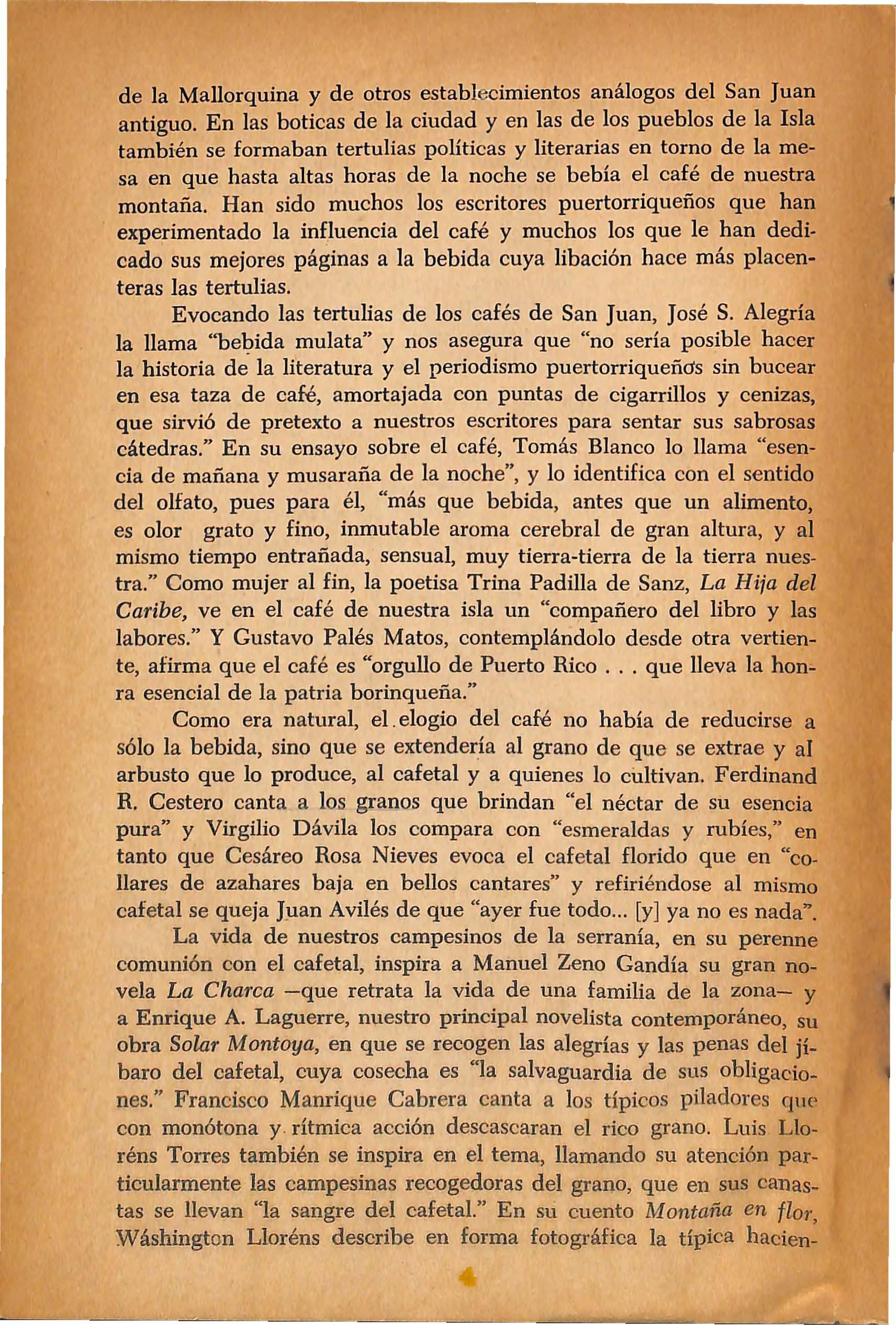 Evocando las tertulias de los cafés de San Juan, José S. Alegría la llama "bebida mulata" y nos asegura que "no sería posible hacer la historia de- la literatura y el periodismo puertorriqueñds sin bucear en esa taza de café, amortajada con puntas de cigarrillos y cenizas, que sirvió de pretexto a nuestros escritores para sentar sus sabrosas cátedras ." En su ensayo sobre el café, Tomás Blanco lo llam a "esencia de mañana y musaraña de la noch e'', y lo identifica con el se ntido del olfato, pues para él, "más que bebida , antes que un alimento, es olor grato y fino, inmutable aroma ce rebral de gran altur a, y al mismo tiempo entrañad a , sensual, muy tierra-tierra de la tierra nuestra. " Como mujer al fin, la poetisa Trina Padilla de Sanz, La Hija d e l Caribe, ve en el caf é de nuestra isla un "compañero del libro y la s labores." Y Gust a vo Palés Matos, cont e mplándolo desde otra vertiente, afirm a qu e el café es "orgullo de Puerto Rico ... que lleva la honra esencial de l a p a tri a borinqueña ."