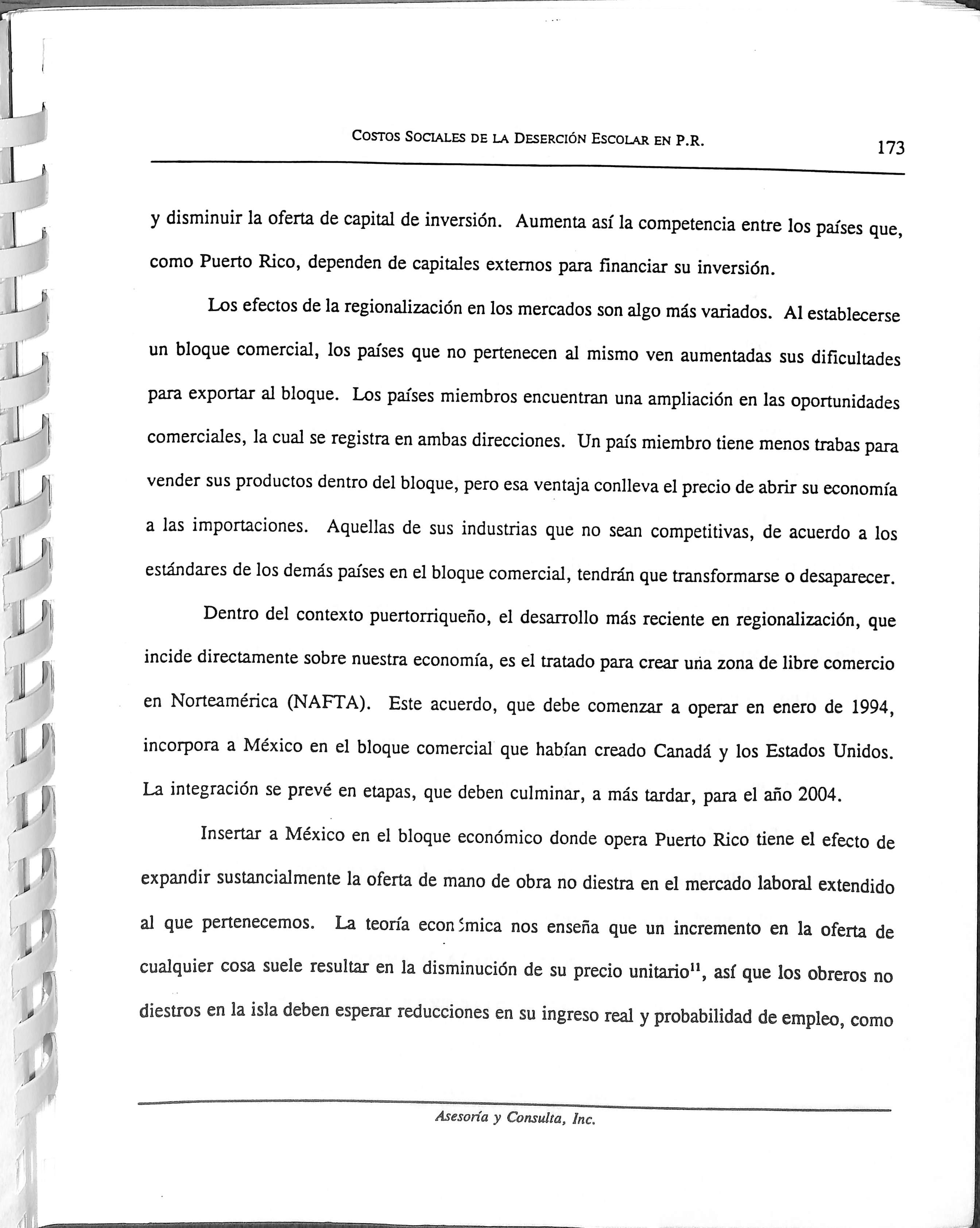 Sin embargo, el elemento más importante en este asunto quizás lo sea el efecto que tenga sobre la capacidad de Puerto Rico para competir bajo las nuevas condiciones económicas. Los desarrollos en la tecnología, la globalización en la industria y la regionalización de los mercados alteran las relaciones económicas. Ahora los países, para competir con éxito, requiren nuevas condicioens para la promoción industrial, incluyendo disponer de una fuerza obrera diestra y versátil". De ahí la importancia de promover la educación universitaria y postsecundaria, así como el efecto limitante de la deserción escolar en el desarrollo de la competitividad en nuestra economía.