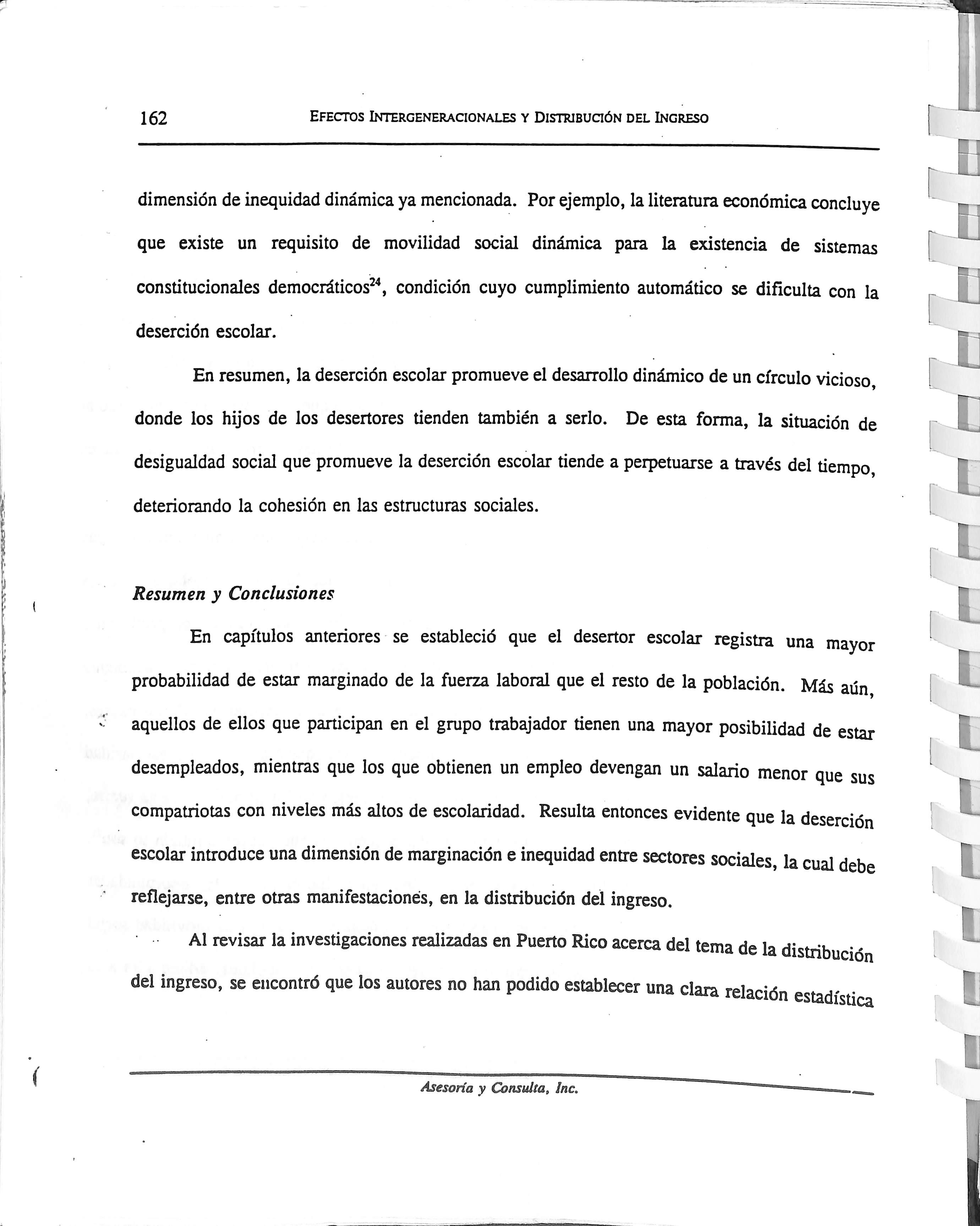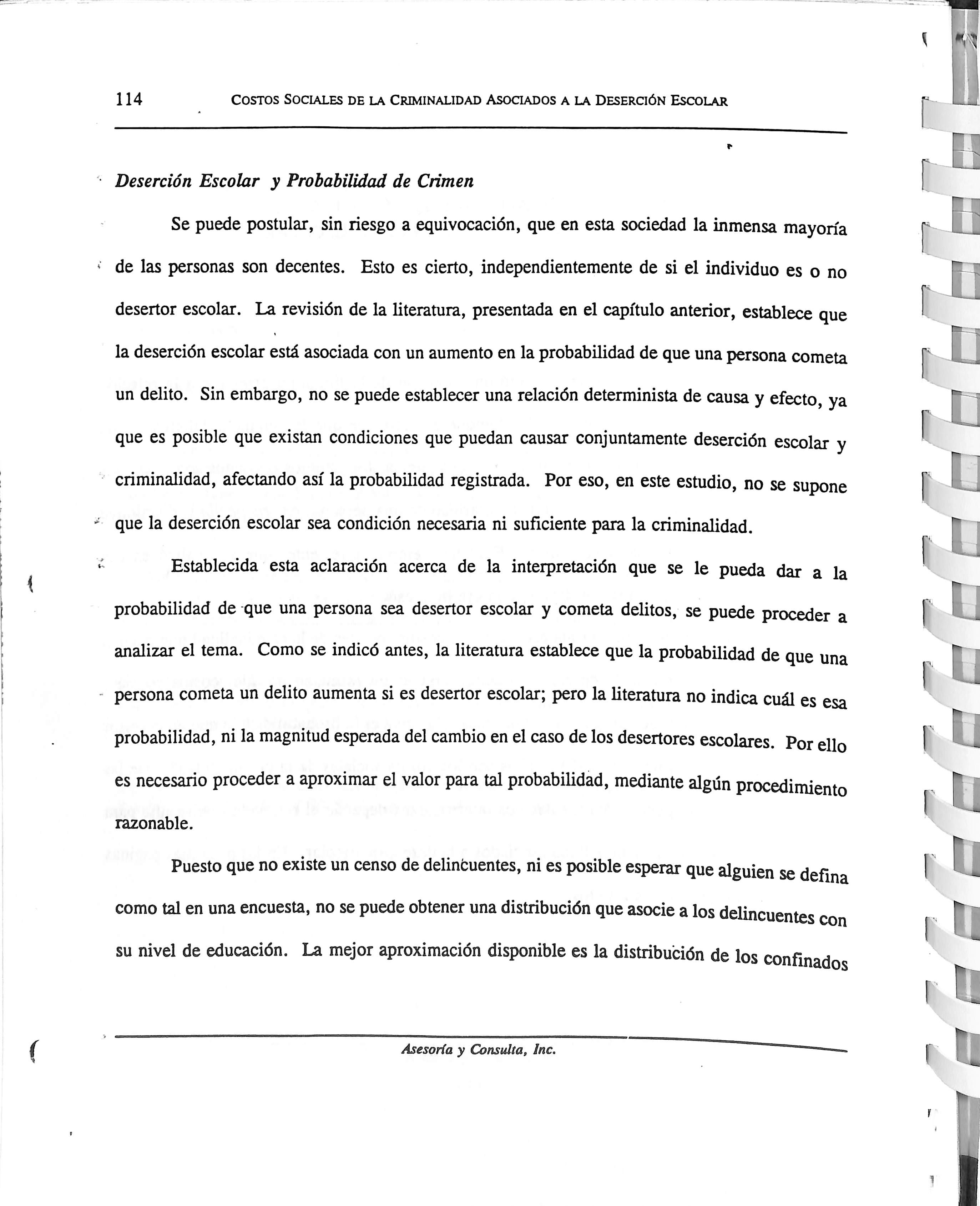 Otra forma de valorar los efectos de la pérdida de ingresos ocasionada por la deserción escolar, es calcular el valor presente de los ingresos que pierde un desertor escolar a través de su vida. Ese estimado ofrece un indicador de la pérdida capitalizada que sufre la sociedad po cada uno de los desertores escolares. Al calcular ese costo social en tal forma cp pno, » iiíia, ac encuentra que el valor presente de las pérdidas estimadas en el ingreso de un desertor escolar del sexo masculino es $87,333, mientras que para uno del sexo femenino es $54 I6i Eso al contrastan marcadamente con los recursos que se asigi.an para prevenir y remediar la deserc"' escolar en Puerto Rico, ya que se estima que el gasto anual promedio por participante para eso propósitos es $407.89.
