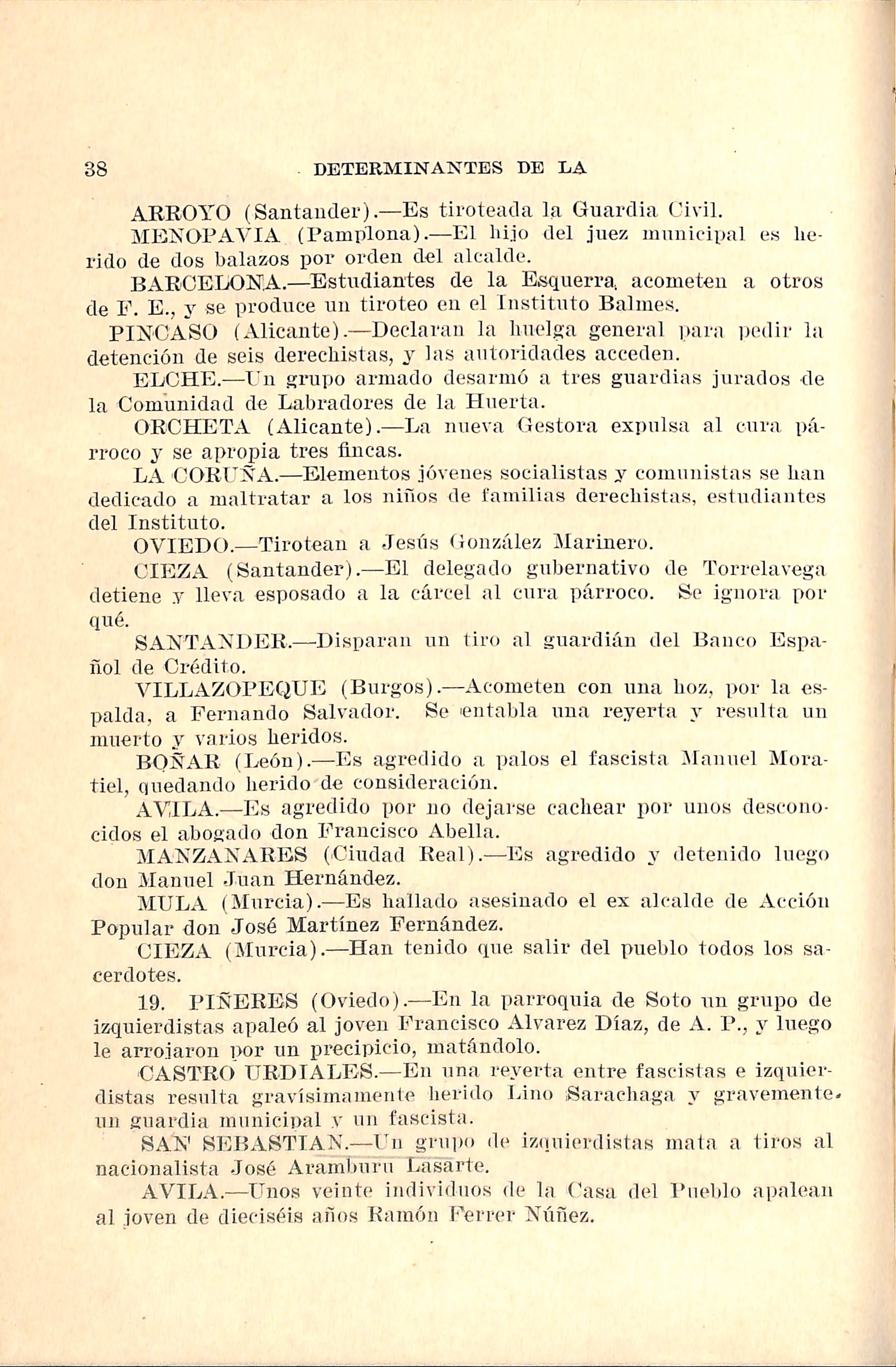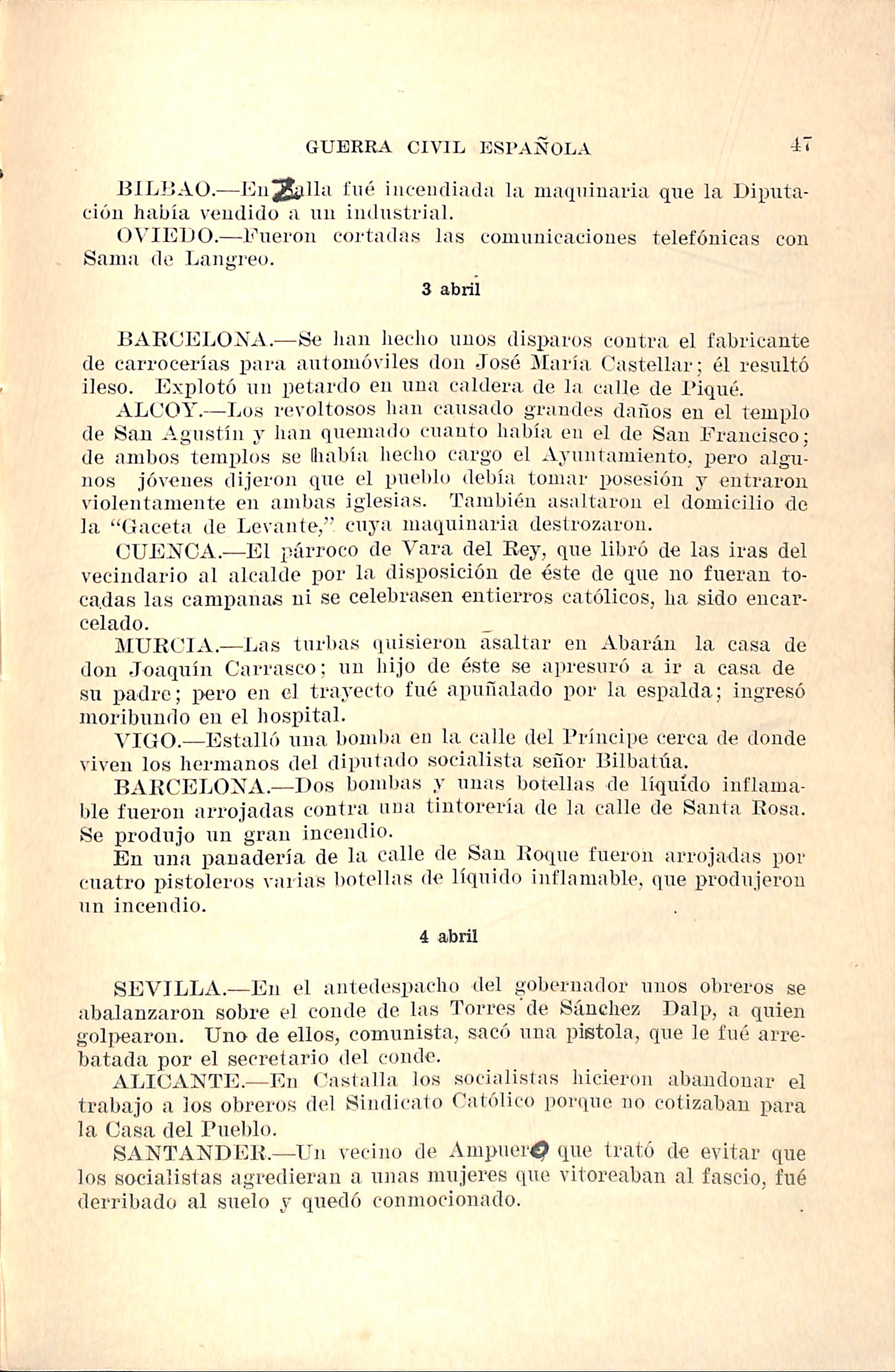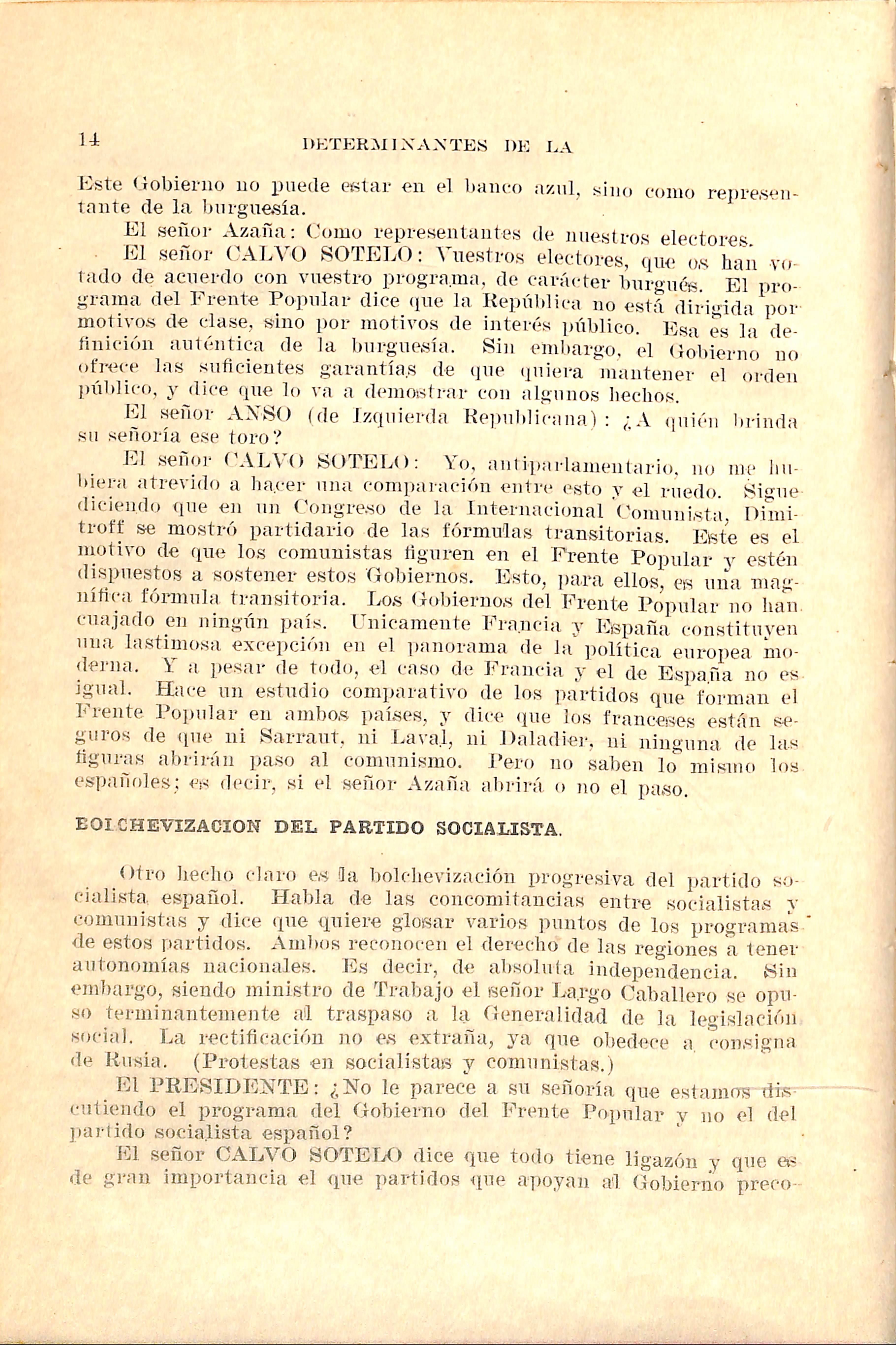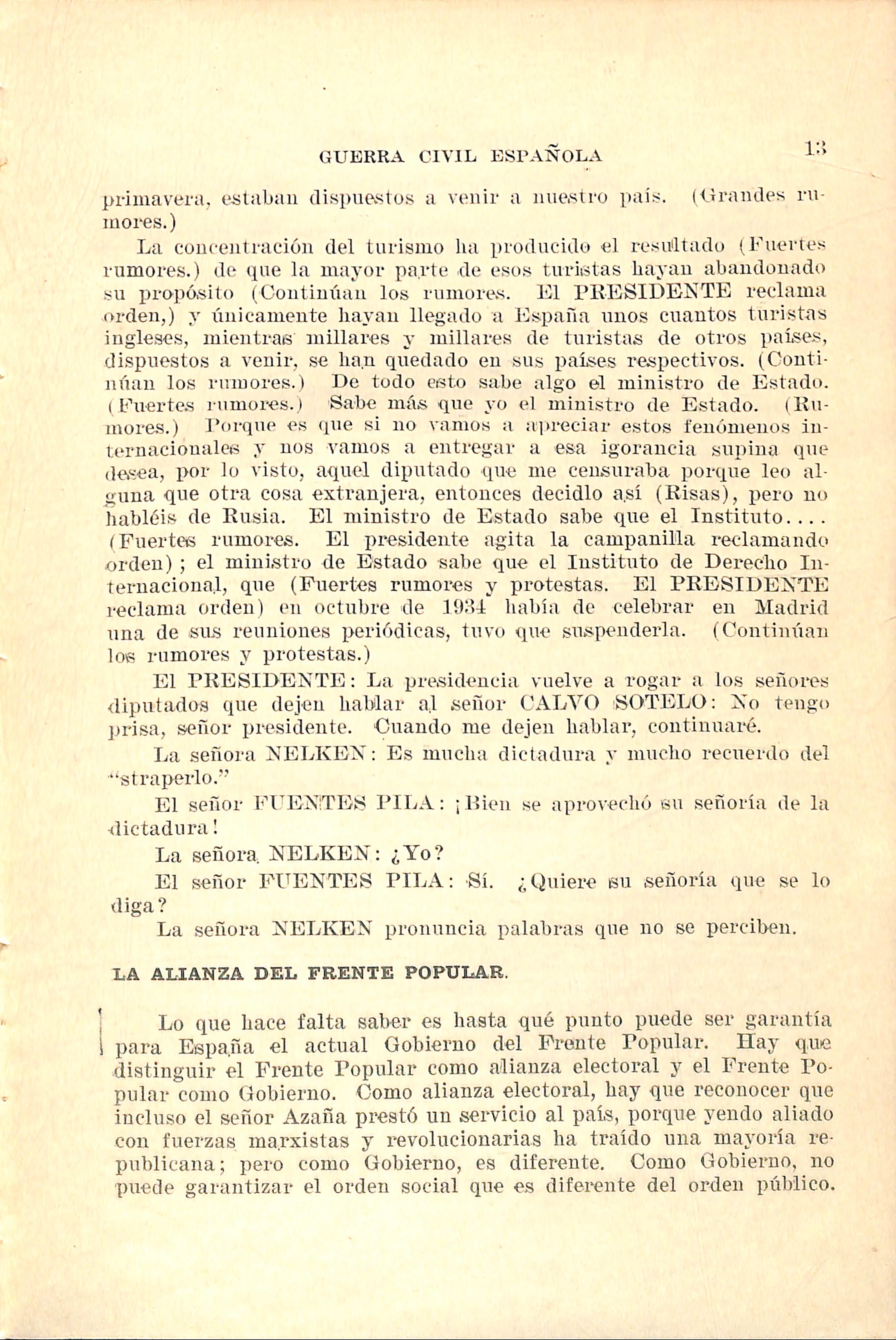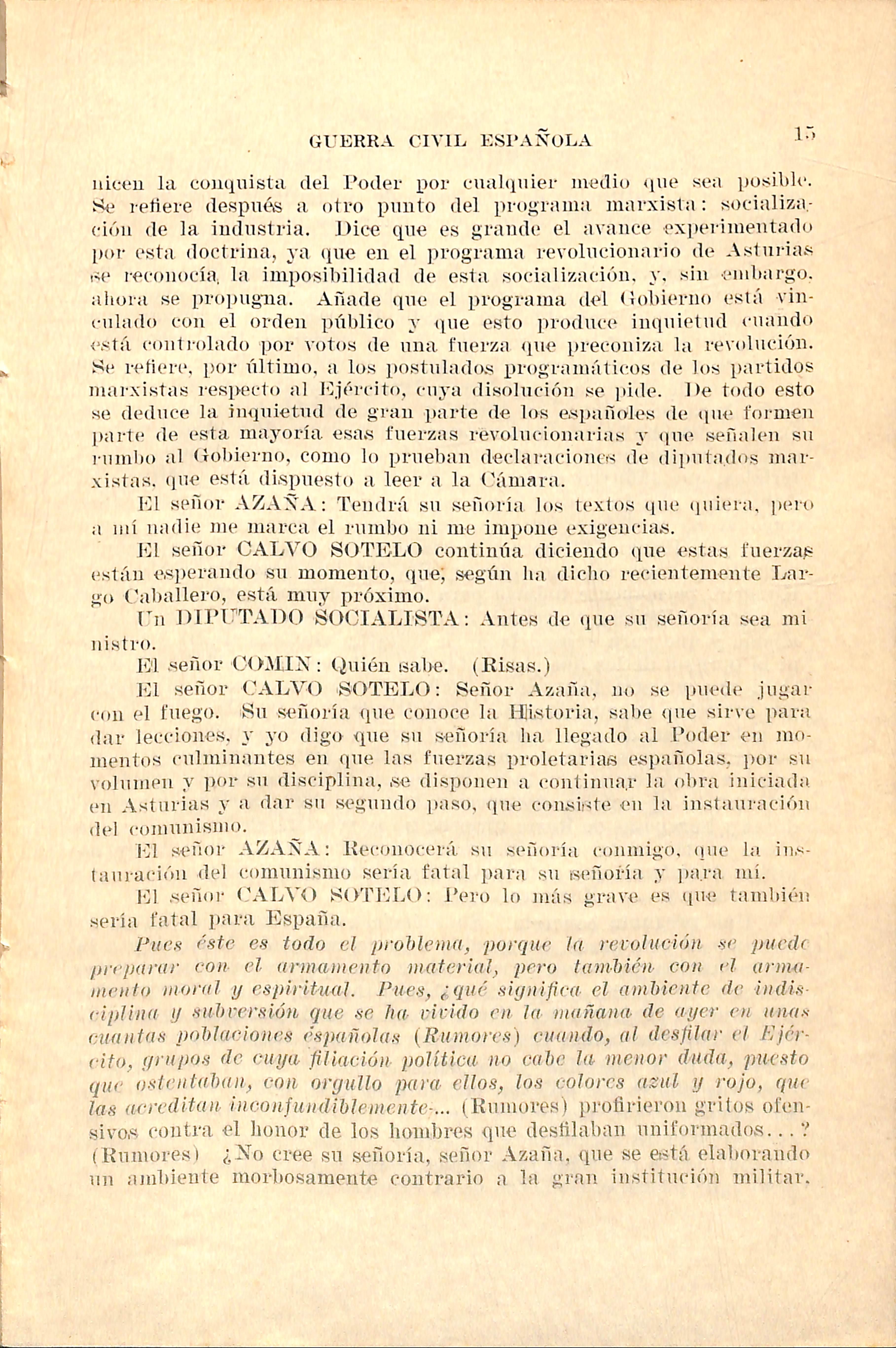 ]'j1 scuov Alvartíi^ del \ ayo, diputado socialista, dijo cu iiii iiiíliu eu llarceloua, liace (piiiicc días, <|uc los iucciidios iu'oducido.s, asi cu ■•La Xación" como cu las ifílesia.s de San Jpiiacio y de San Luíd. eran de])idos a que el pueldo de Madrid quería dar uua i)i'otesta ante el ritmo lento con que el (íohierno desarrollaba el in-oj-rania del Fren te l'o])n]ar. V con ])alabras más expresivas, lomadas intej-raniente del discurso del inndicalisla, o comunista, no conozco exaclamente su íiliación, seuor Asín, en el juílin ce'lel)rado en Cartagena el día 5 de este mes, se dice lo siguiente: "Ao debemos conlenlarnos con ijuemar una o mil iglesia-s, E>so es esj)ectáculo ((iie tiene algo de talisto, algo de exnbei-ante, más o menos magnílico, pei-o (pie no tiene base solida jaira garantizar nuestro bieneslar en el día de mainina, Lníca manera de liacer efectiva nuestra liberación ecoliómica es expropiando a la Banca privada, al Banco de Esjjaña, ex propiando a lodos los (pie exidotaii y expolian al pueblo español," (Aidansos, J'roteslas. El presidente tmdama insistentemente orden.)