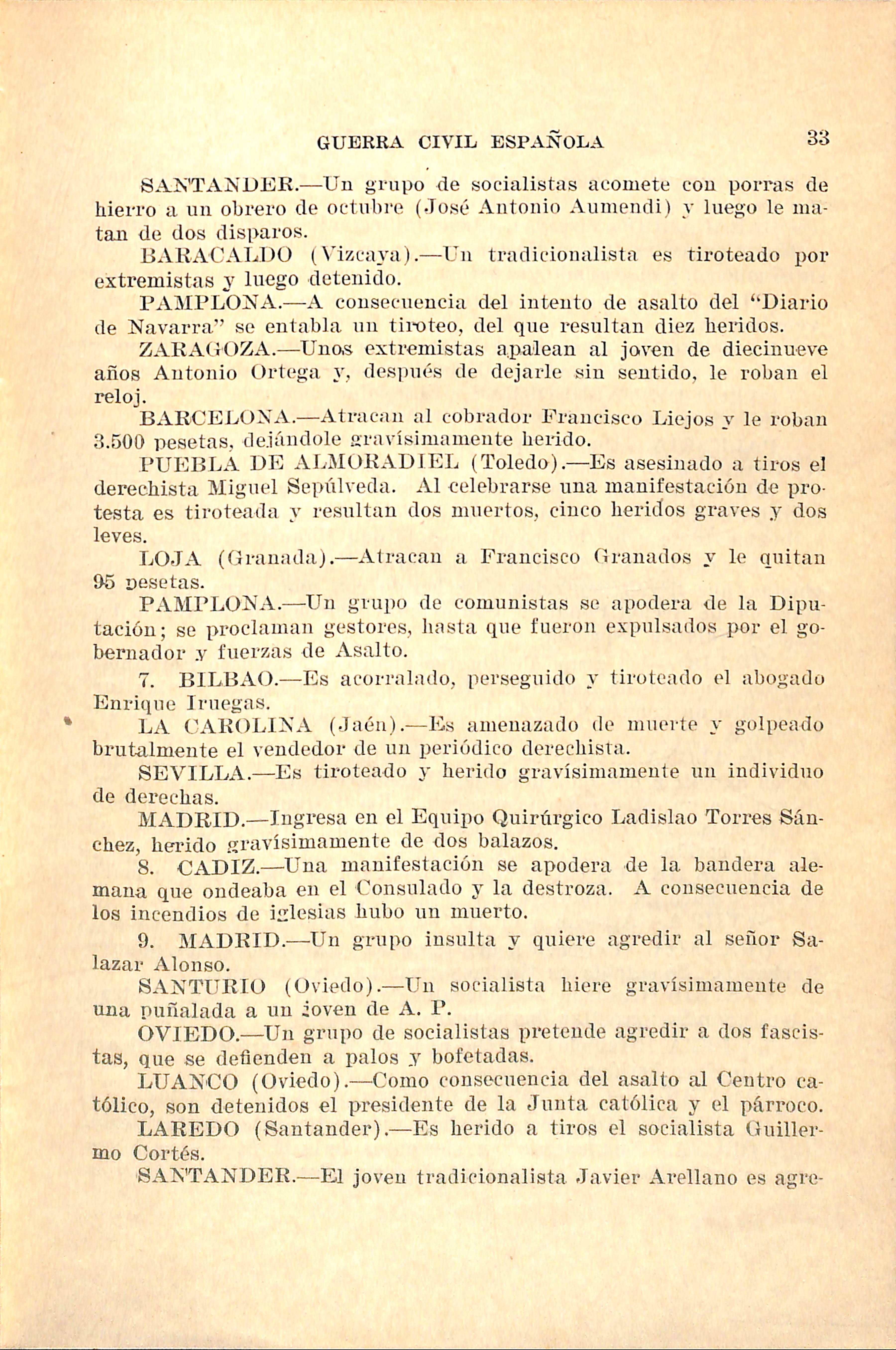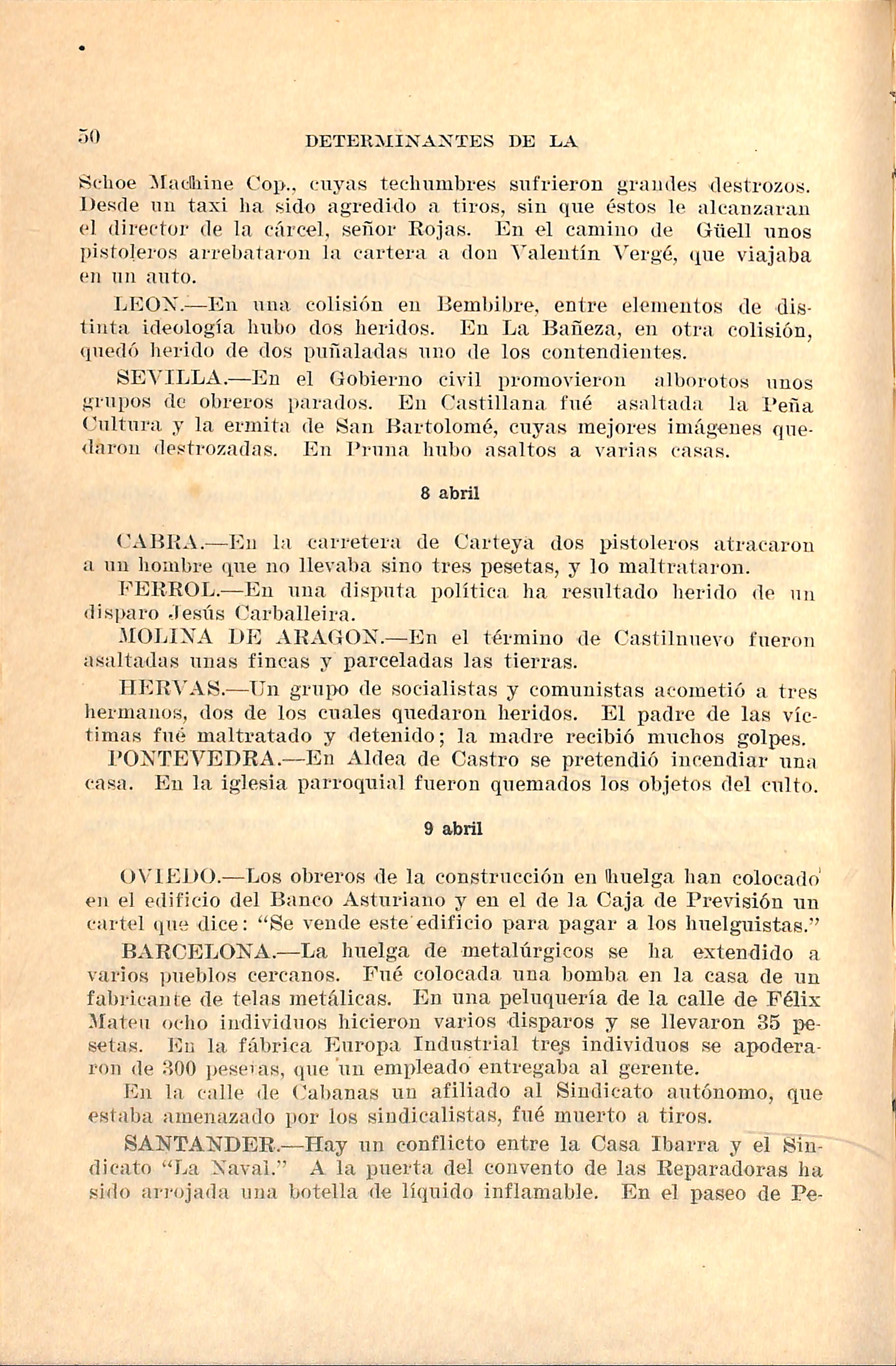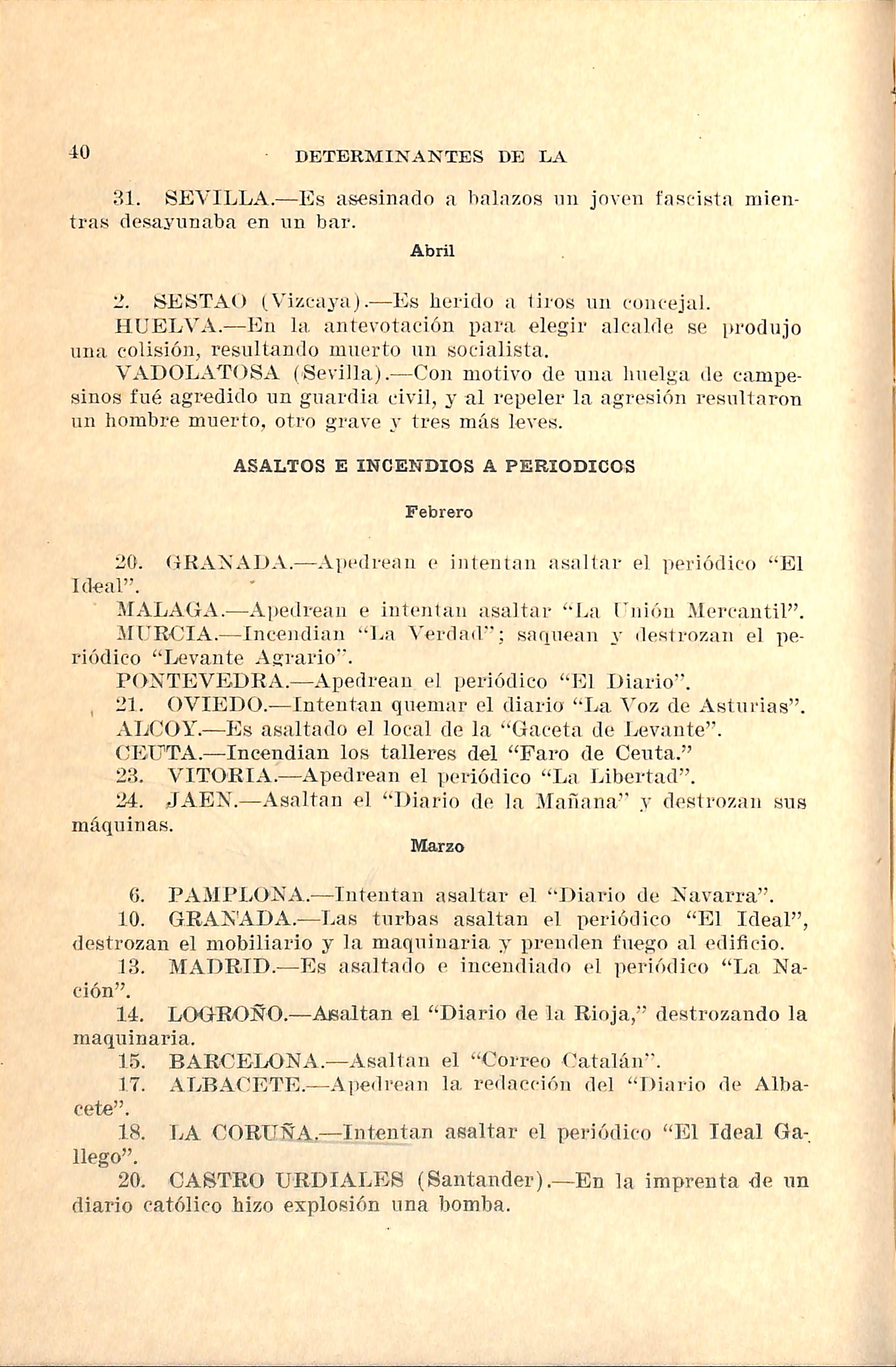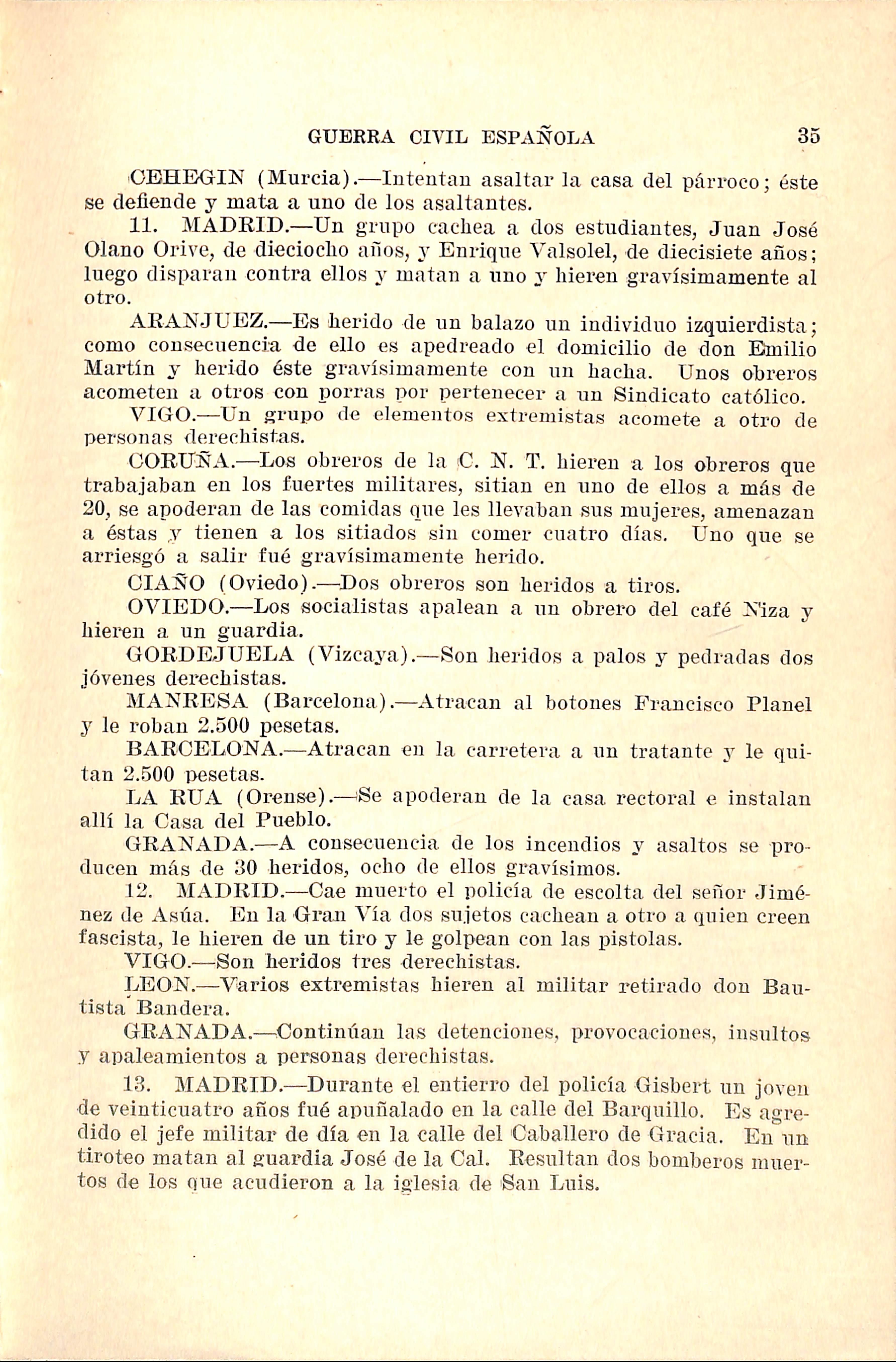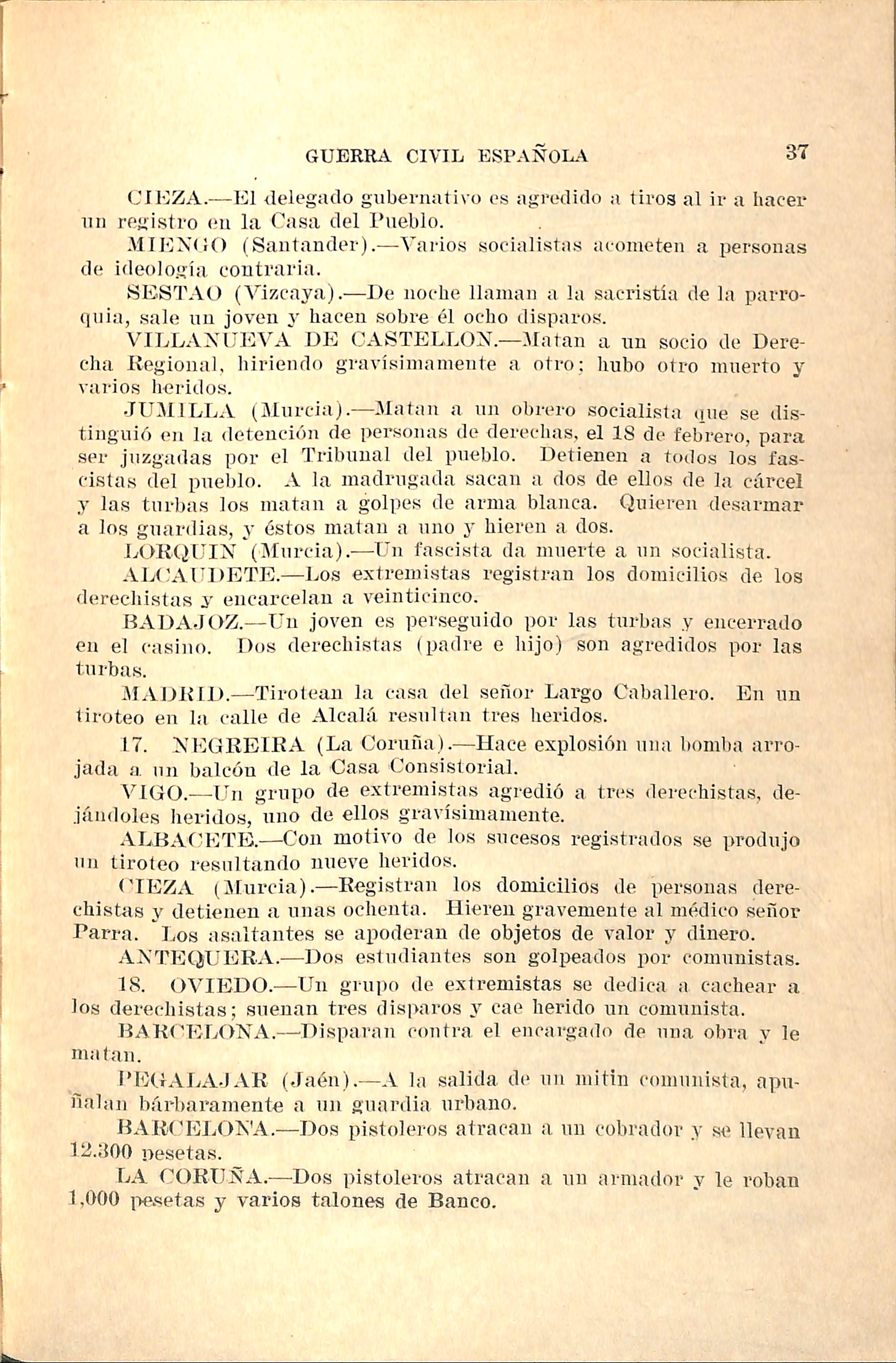 ]'j1 scuov Alvartíi^ del \ ayo, diputado socialista, dijo cu iiii iiiíliu eu llarceloua, liace (piiiicc días, <|uc los iucciidios iu'oducido.s, asi cu ■•La Xación" como cu las ifílesia.s de San Jpiiacio y de San Luíd. eran de])idos a que el pueldo de Madrid quería dar uua i)i'otesta ante el ritmo lento con que el (íohierno desarrollaba el in-oj-rania del Fren te l'o])n]ar. V con ])alabras más expresivas, lomadas intej-raniente del discurso del inndicalisla, o comunista, no conozco exaclamente su íiliación, seuor Asín, en el juílin ce'lel)rado en Cartagena el día 5 de este mes, se dice lo siguiente: "Ao debemos conlenlarnos con ijuemar una o mil iglesia-s, E>so es esj)ectáculo ((iie tiene algo de talisto, algo de exnbei-ante, más o menos magnílico, pei-o (pie no tiene base solida jaira garantizar nuestro bieneslar en el día de mainina, Lníca manera de liacer efectiva nuestra liberación ecoliómica es expropiando a la Banca privada, al Banco de Esjjaña, ex propiando a lodos los (pie exidotaii y expolian al pueblo español," (Aidansos, J'roteslas. El presidente tmdama insistentemente orden.)