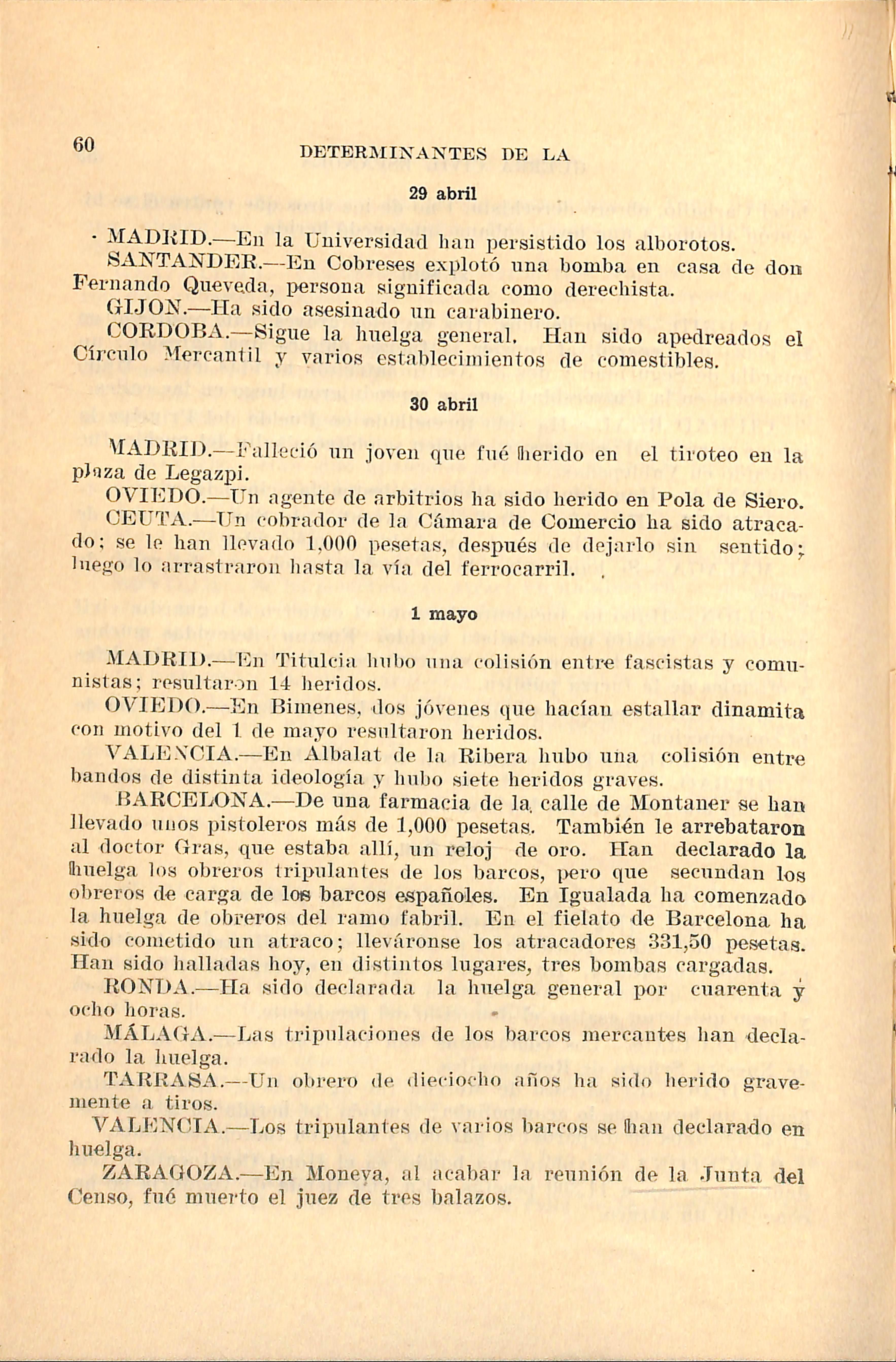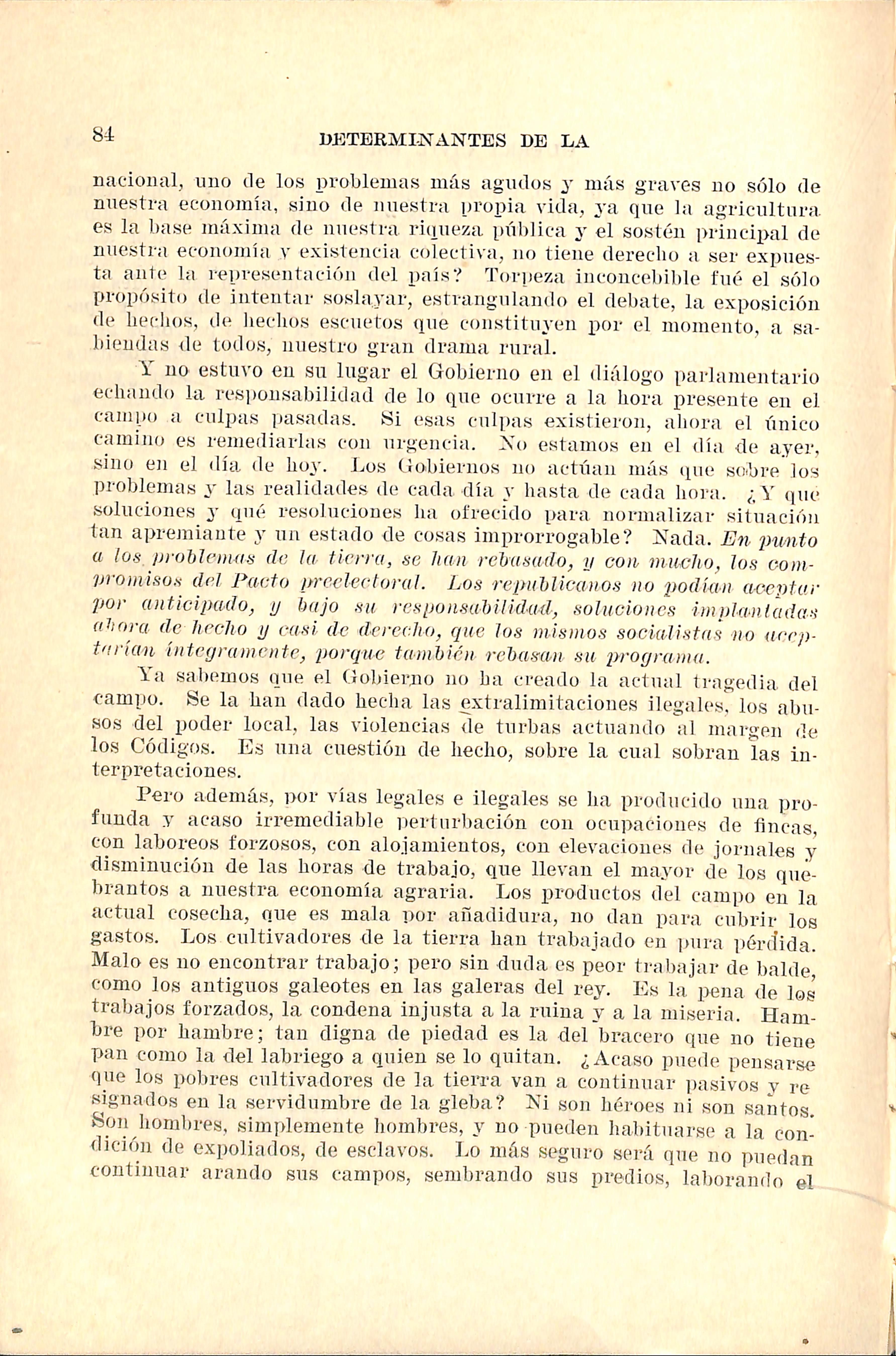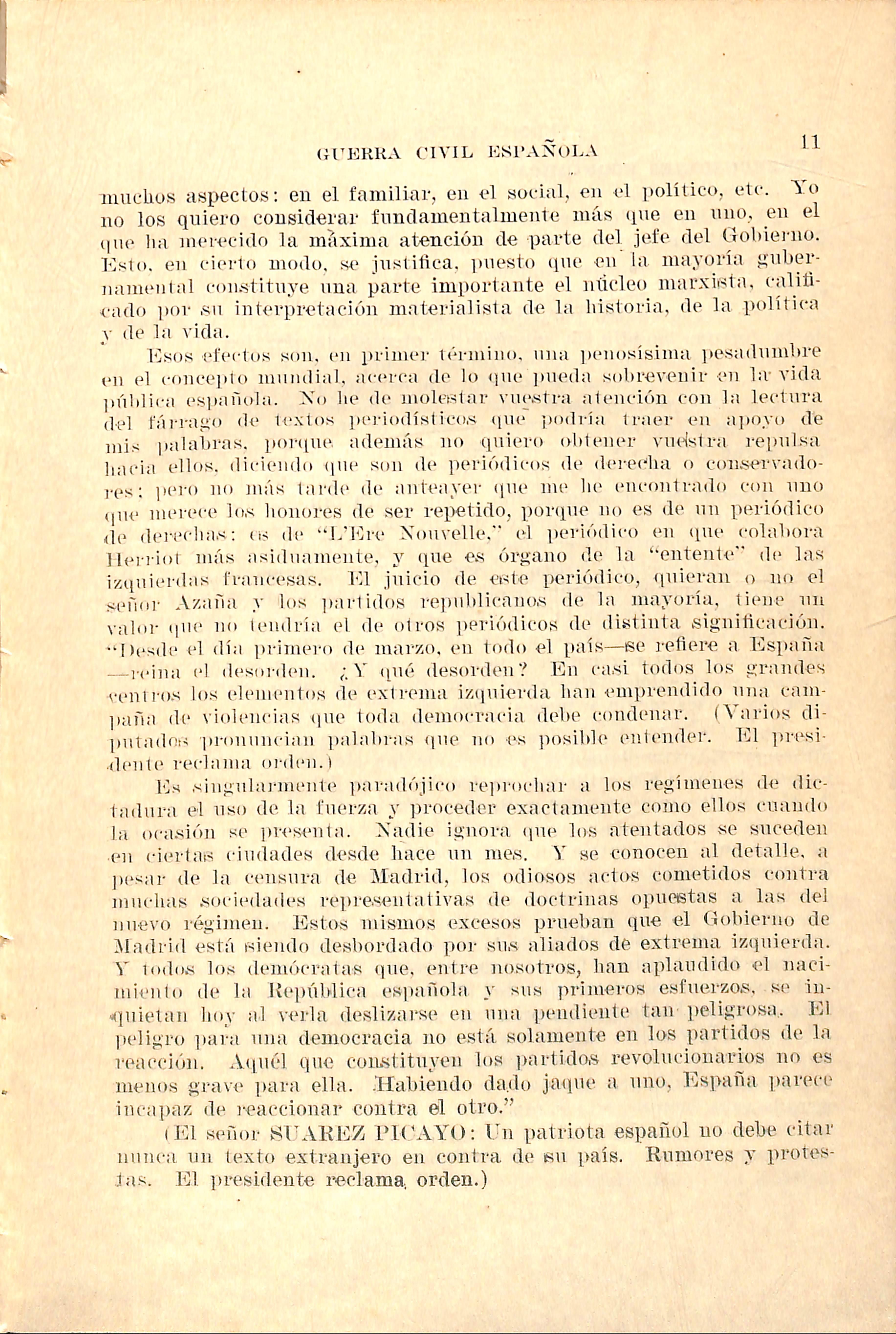 Pisos efectos son, cu primer U'riniiio, una iieuosisima jiesadumbre cu (d (•ouceiiio miimlial, acerca do lo (pie ])ue(la sobrevenir en br vida ])iiblica esiiauola. No lie de molcistar vuestra atención con la lectura del fárraeo de textos jieriodístico.s (pie ¡lodría traer en ajioyo de mis ¡lalaliras, imripie además no quiero (diteiier viulstra repulsa bada ellos, diciendo (pie son de periódicos de dei-edia o cou.servadores: pero no más larde de anteayer ipie me be encontrado con uno (pie merece lo.s bonoi-es de ser reitetido, poripie no es de un periódico de derecba.s: (i> de "L'lOre Noiivelle," el iieriódico en ipie colabora llerriot más asiduamente, y ipie es órgano de la "entente" de las izquierdas írauce.sas. lil juicio de ei^te periódico, ([uierau o no el señor Azaña y los ])artidos rejniblicanos de la mayoría, tiene un valor (pie no tendría el de otros iierii'xlicos de distinta significación. "Desde el día ])rímero de marzo, en todo el país—ise refiere a Pisiiana —reina el desorden. V ([ué desorden? lín ca.si todos los grandes veniros los elementos (le extrema íz(piierda lian emprendido una camjiaña de violencias (pie toda democracia debe condenar. (A arios di]iuta(los pronuncian ]ialabras (pie no es ]msible entender, bll jiresi■dente reclama orden. I