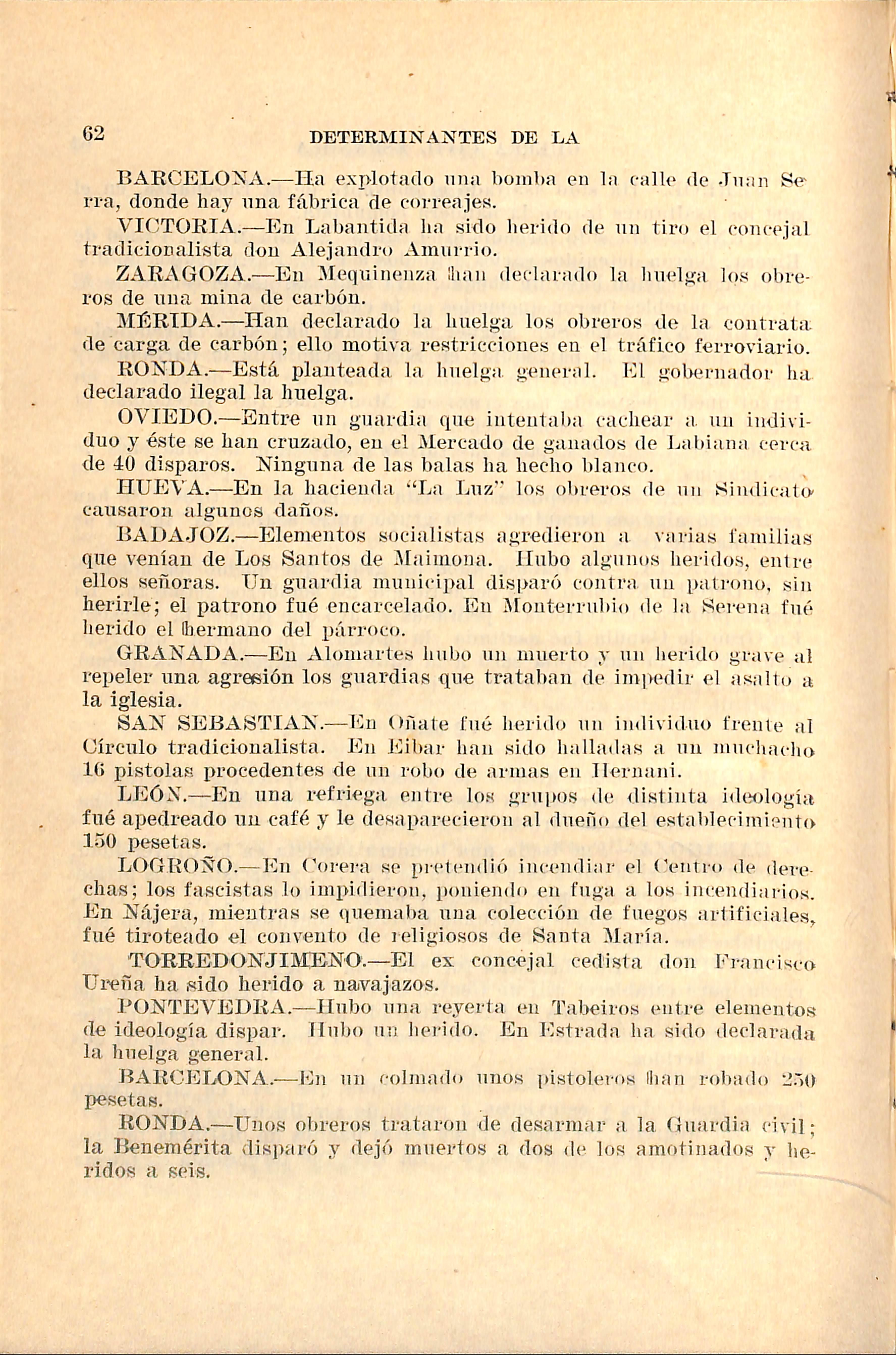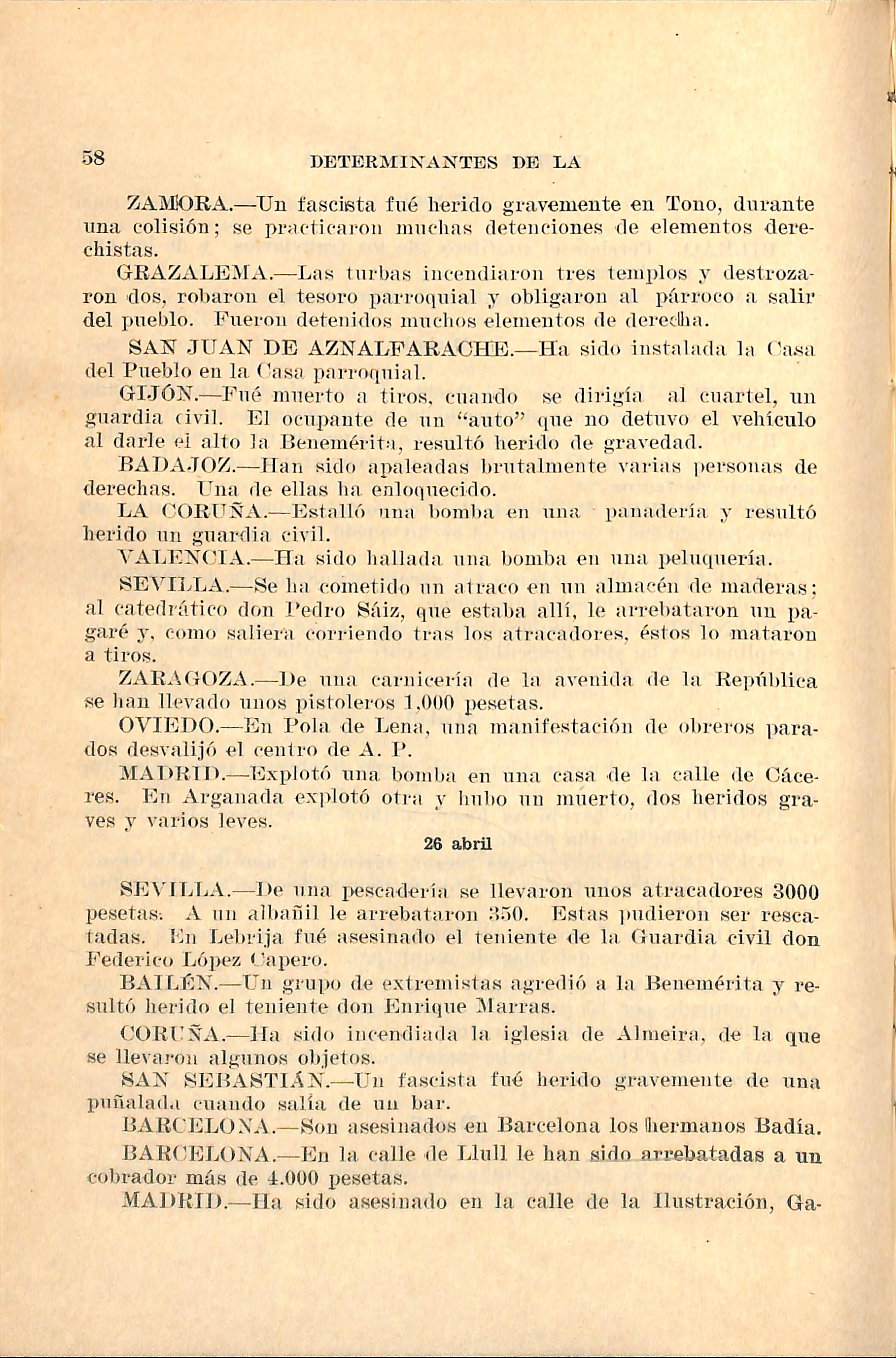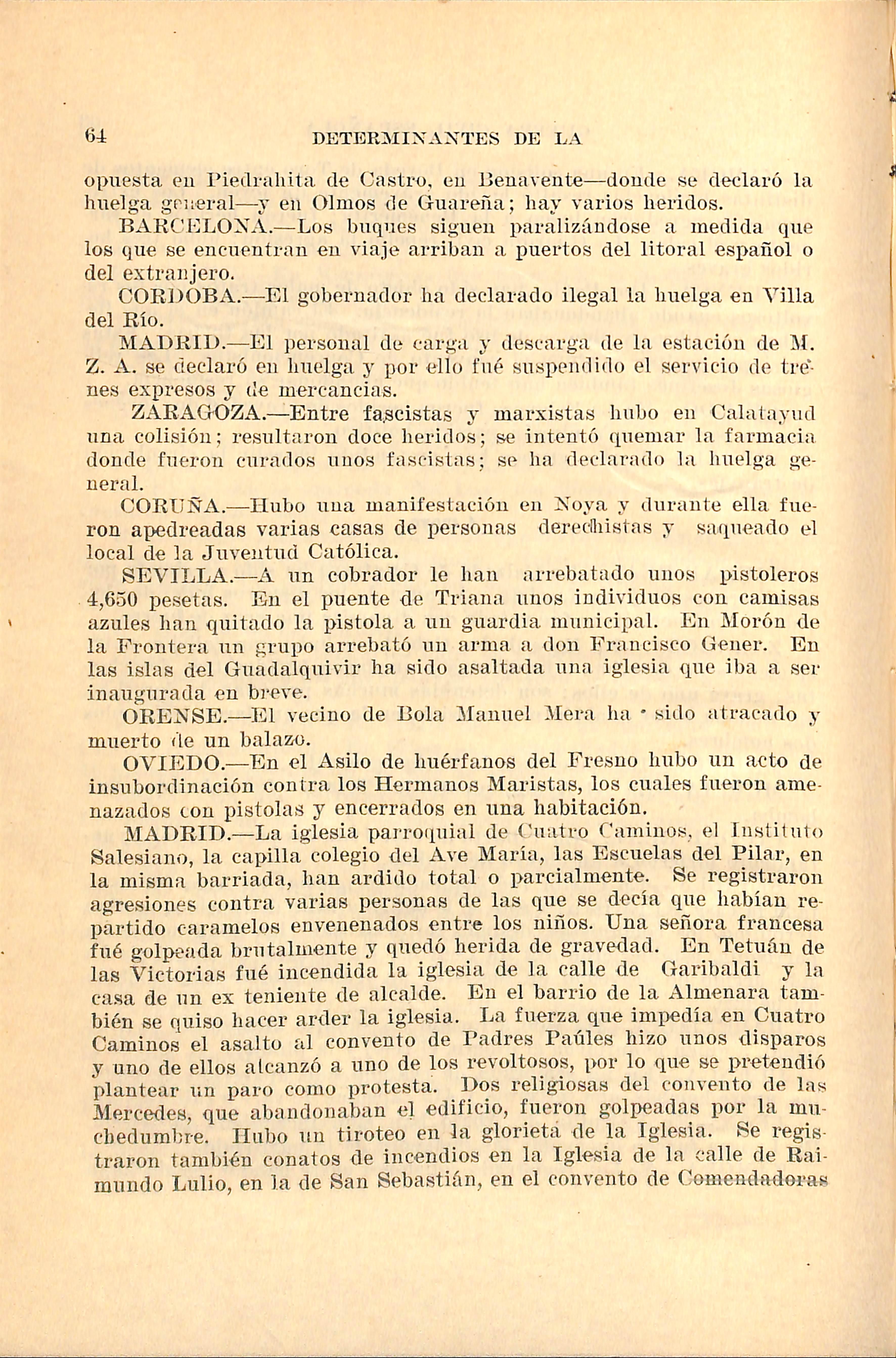 Pisos efectos son, cu primer U'riniiio, una iieuosisima jiesadumbre cu (d (•ouceiiio miimlial, acerca do lo (pie ])ue(la sobrevenir en br vida ])iiblica esiiauola. No lie de molcistar vuestra atención con la lectura del fárraeo de textos jieriodístico.s (pie ¡lodría traer en ajioyo de mis ¡lalaliras, imripie además no quiero (diteiier viulstra repulsa bada ellos, diciendo (pie son de periódicos de dei-edia o cou.servadores: pero no más larde de anteayer ipie me be encontrado con uno (pie merece lo.s bonoi-es de ser reitetido, poripie no es de un periódico de derecba.s: (i> de "L'lOre Noiivelle," el iieriódico en ipie colabora llerriot más asiduamente, y ipie es órgano de la "entente" de las izquierdas írauce.sas. lil juicio de ei^te periódico, ([uierau o no el señor Azaña y los ])artidos rejniblicanos de la mayoría, tiene un valor (pie no tendría el de otros iierii'xlicos de distinta significación. "Desde el día ])rímero de marzo, en todo el país—ise refiere a Pisiiana —reina el desorden. V ([ué desorden? lín ca.si todos los grandes veniros los elementos (le extrema íz(piierda lian emprendido una camjiaña de violencias (pie toda democracia debe condenar. (A arios di]iuta(los pronuncian ]ialabras (pie no es ]msible entender, bll jiresi■dente reclama orden. I