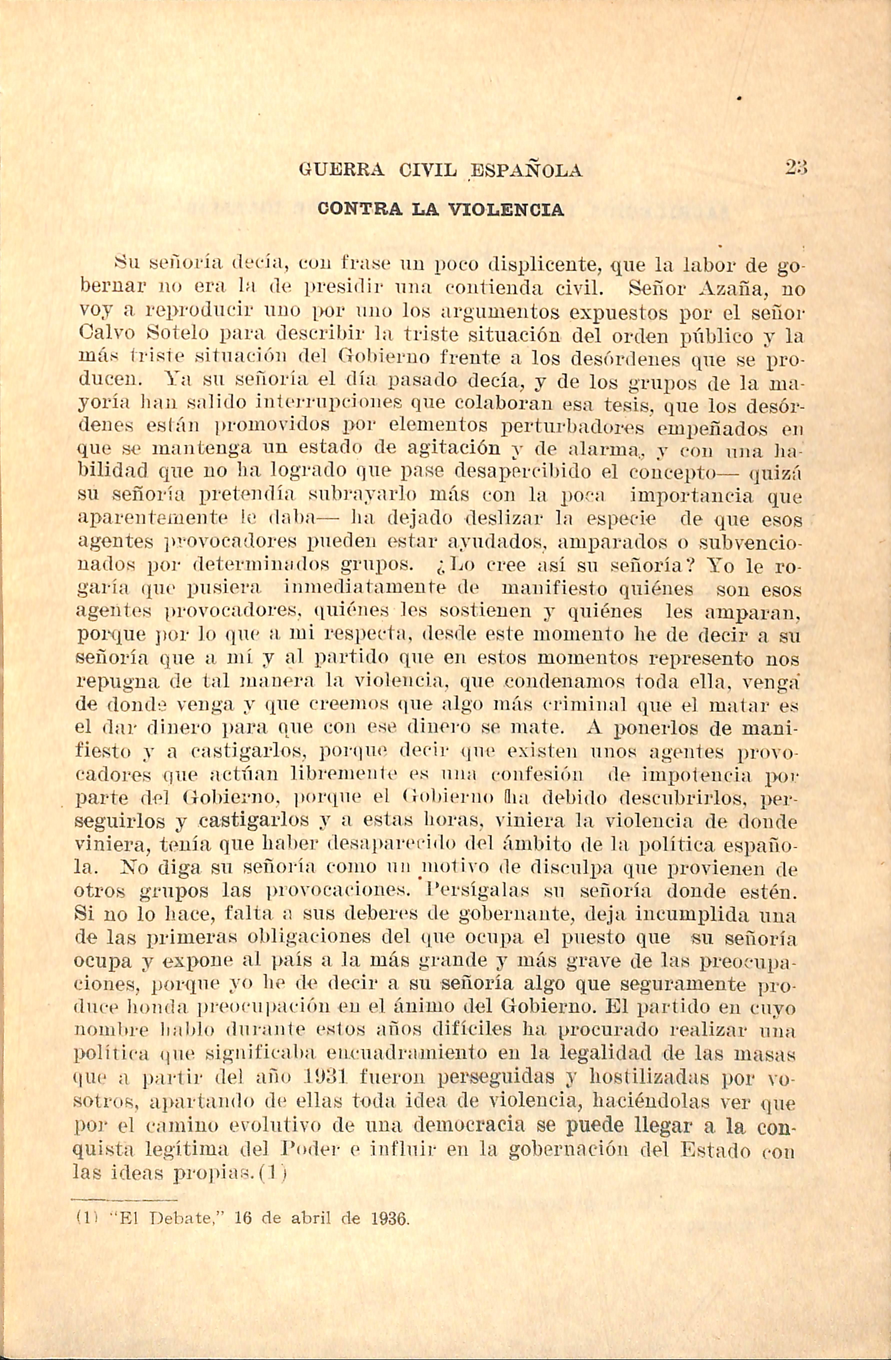 Señoj'cs diputados: En este ambiente de pasión que ha producido la vigorosa intervención del señor Calvo Sotelo, voy a procurar pro nunciar uiias breves palabras serenas. Es obligado, por el momento parlamentario en que nos encontramos, examinar el programa que, con una brevedad sintética ha enunciado el señor presidente del Con.sejo de ministros. La tarea es, en cierto modo, .sencilla; no ha hecho otra cosa el señor Azaña que glosar el contenido del programa del Erente Píqmlar, destacando en un orden, que él decía que era lógico (1) "El Debate"—diario madrileño—16 de abril de 1936.