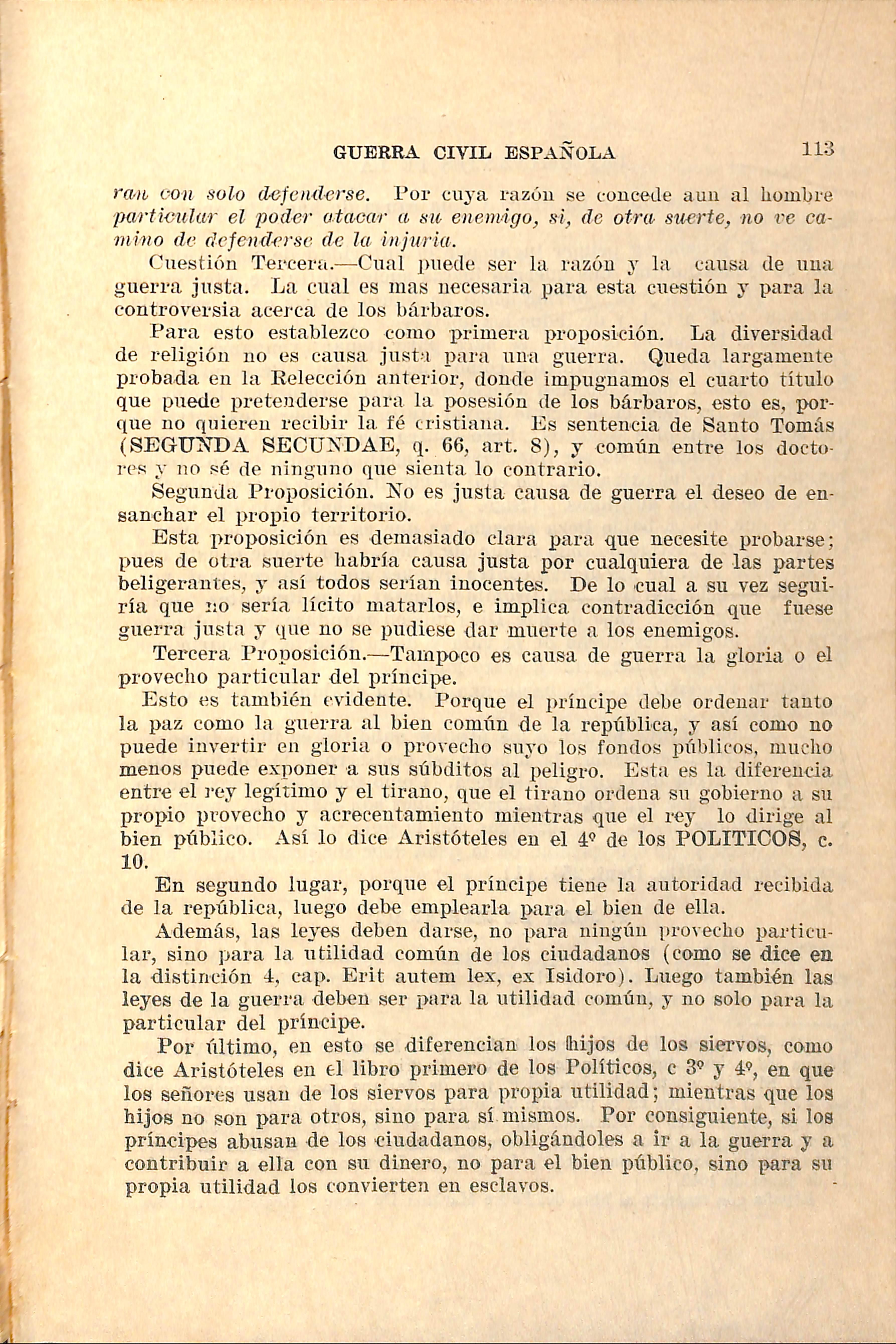 l'ai-ii probarla hay que notar que, en cuanto a esto, existe diferencia entre una persona privada y la repiiblica. Una persona privada tiene derecho a defenderse a sí y a sus cosas, como queda dicho., pero no la tiene para vengar la injuria y aun ni para reclamar lo robado, desl)ues de cierto tiempo; sino que la defen.sa debe de hacerse mientras el peligro, que es lo que los juristas denominan incontinenti. Por lo tanto, pasada la necesidad de la defensa, cesa la permisión de la guerra. Creo sin embargo, que el agredido injustamente puede usar de la ftterza en aquel momento, aun cuando el agresor no debiera de pasar adelante. Y para evitar la deshonra y la ignominia, podría el que ha recibido un bofetón (por ejcmido) herir a su agresor en el mismo momento con la esjtada, no itara lomar venganza, sino itaiai evitiir la ignominia y la infamia. Pero la república tiene autoridad, no solo ])ara defenderse, siito tandtién para vengar a sí y a los suyos, y para exigir reparación de las injurias. Lo ctial se ])rueba, porque, como Aristóteles dice en el libro tercero de los Políticos, la rein'iblila debe de bastarse ,a sí misma, y tío podría conservar suticientenumie el bien público y su propio estado si no (tudiese vengar las injtirias e infundir resiteto a sus enemigos; ya. que, sin esto, se harían los malos más pronto y audaces para inferir injuria, si viesen que jiodían ha cerlo impunemente. Por esto es necesario, ])ara la conveniente ad ministración de los negocios humanos, qne conceda esla autoridad a la repiiblica.