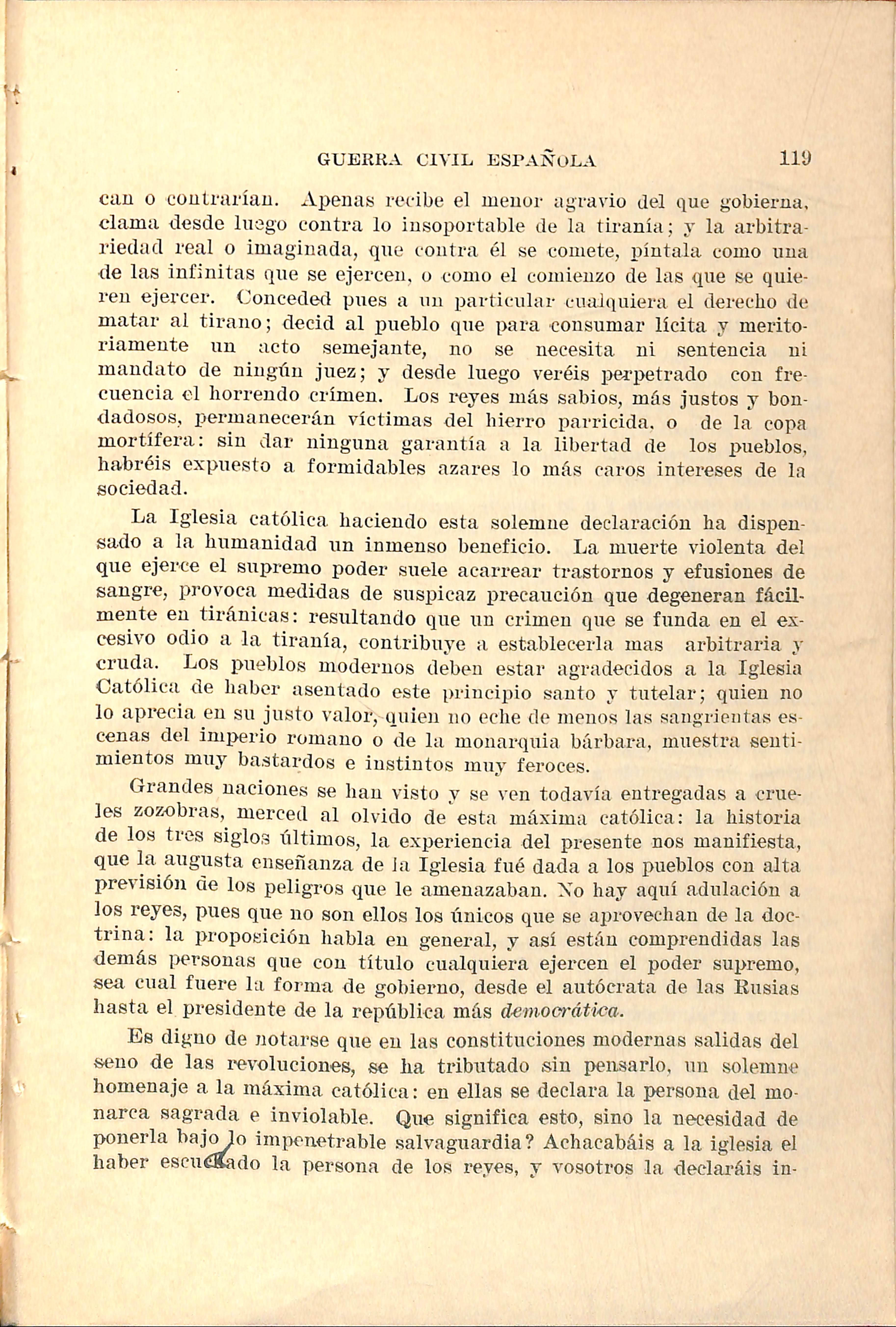 La Iglesia católica haciendo esta solemne declaración ha dispen sado a la humanidad un inmenso beneficio. La muerte violenta del que ejerce el supremo poder suele acarrear trastornos y efusiones de sangre, ]U'ovoea medidas de suspicaz precaución que degeneran fácil mente en tiránicas: resultando que un crimen que se funda en el ex cesivo odio a la tiranía, contribuye a establecerla mas arbitraria y cruda. Los imeblos modernos deben estar agradecidos a la Iglesia Católica de haber asentado este principio santo y tutelar; quien no lo aprecia en su justo valor, quien no eche de menos las sangrientas es cenas del imperio romano o de la monarquía bárbara, muestra senti mientos muy bastardos e instintos muy feroces.
