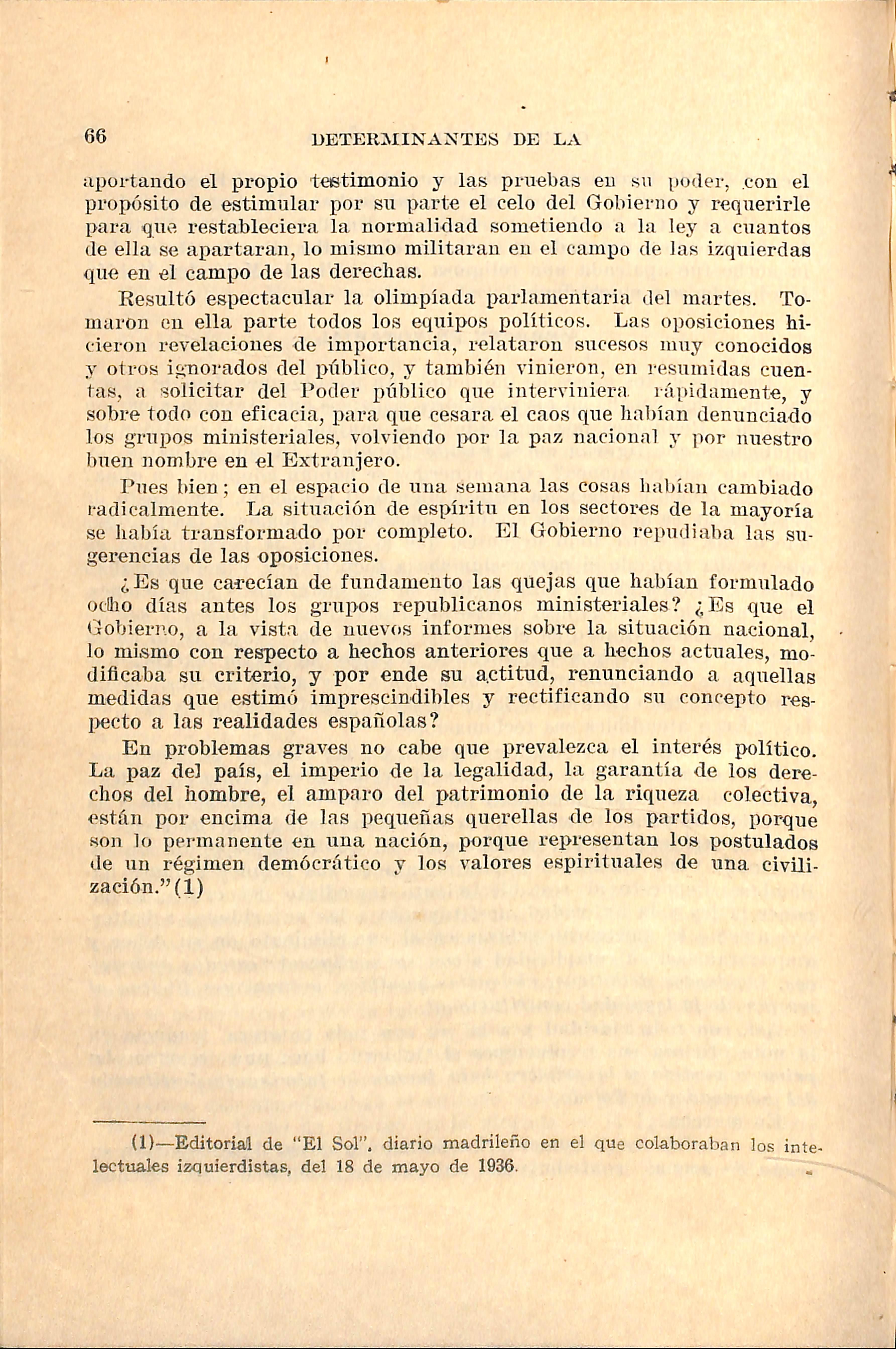 Lo que hace falta saber es hasta qué punto puede ser garantía para Espa.ña el actual Gobierno del Fronte Popular. Hay que distinguir el Frente Popular como alianza electoral y el Frente Po pular como Gobierno. Como alianza electoral, hay que reconocer que incluso el señor Azaña prestó un servicio al país, porque yendo aliado con fuerzas marxistas y revolucionarias ha traído una mayoría re publicana; pero como Gobierno, es diferente. Como Gobierno, no puede garantizar el orden social que es diferente del orden público.