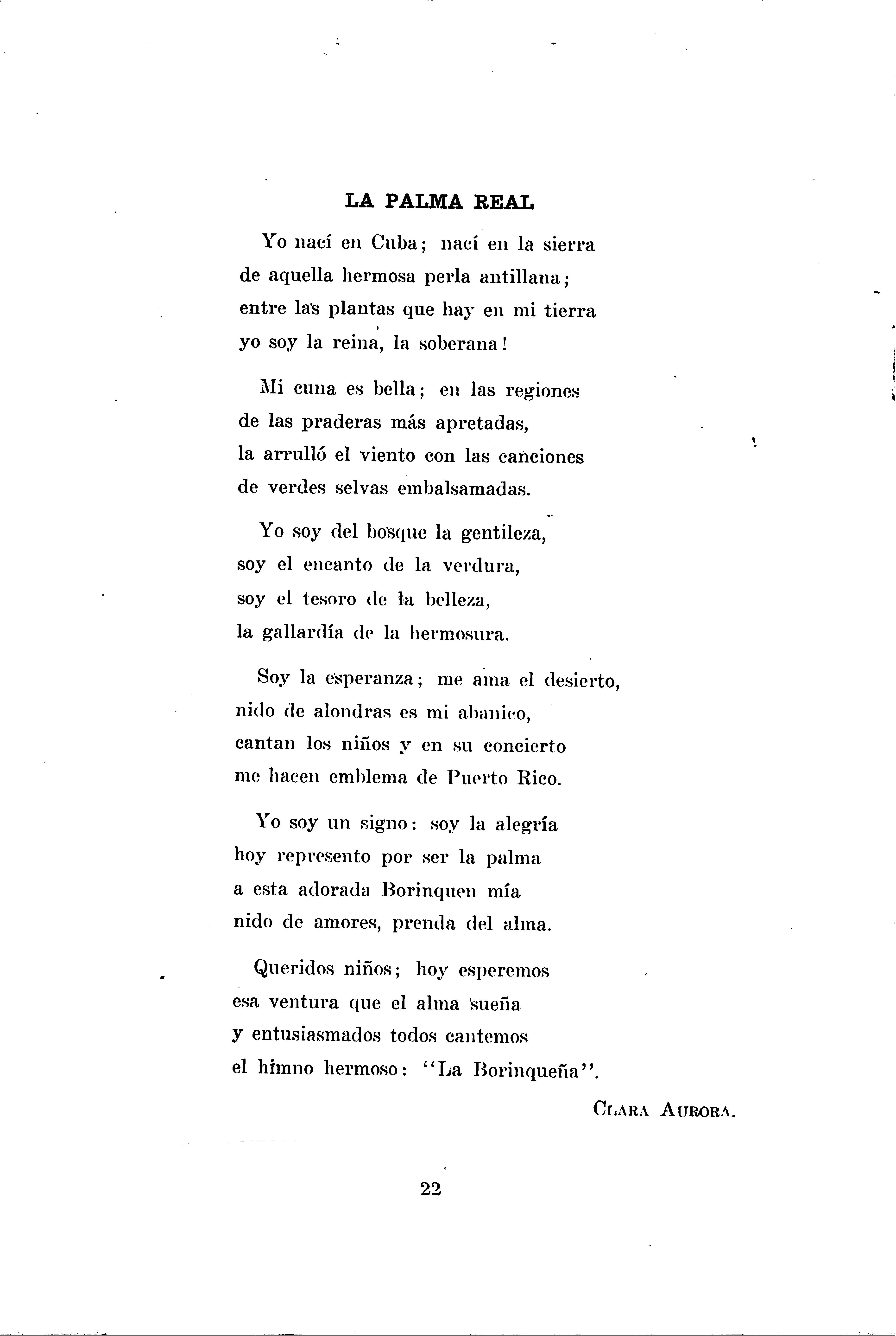 Yo soy un signo: soy la alegría hoy represento por ser la palma a esta adorada Borinqul'n mía nido de amores, prenda del alma.