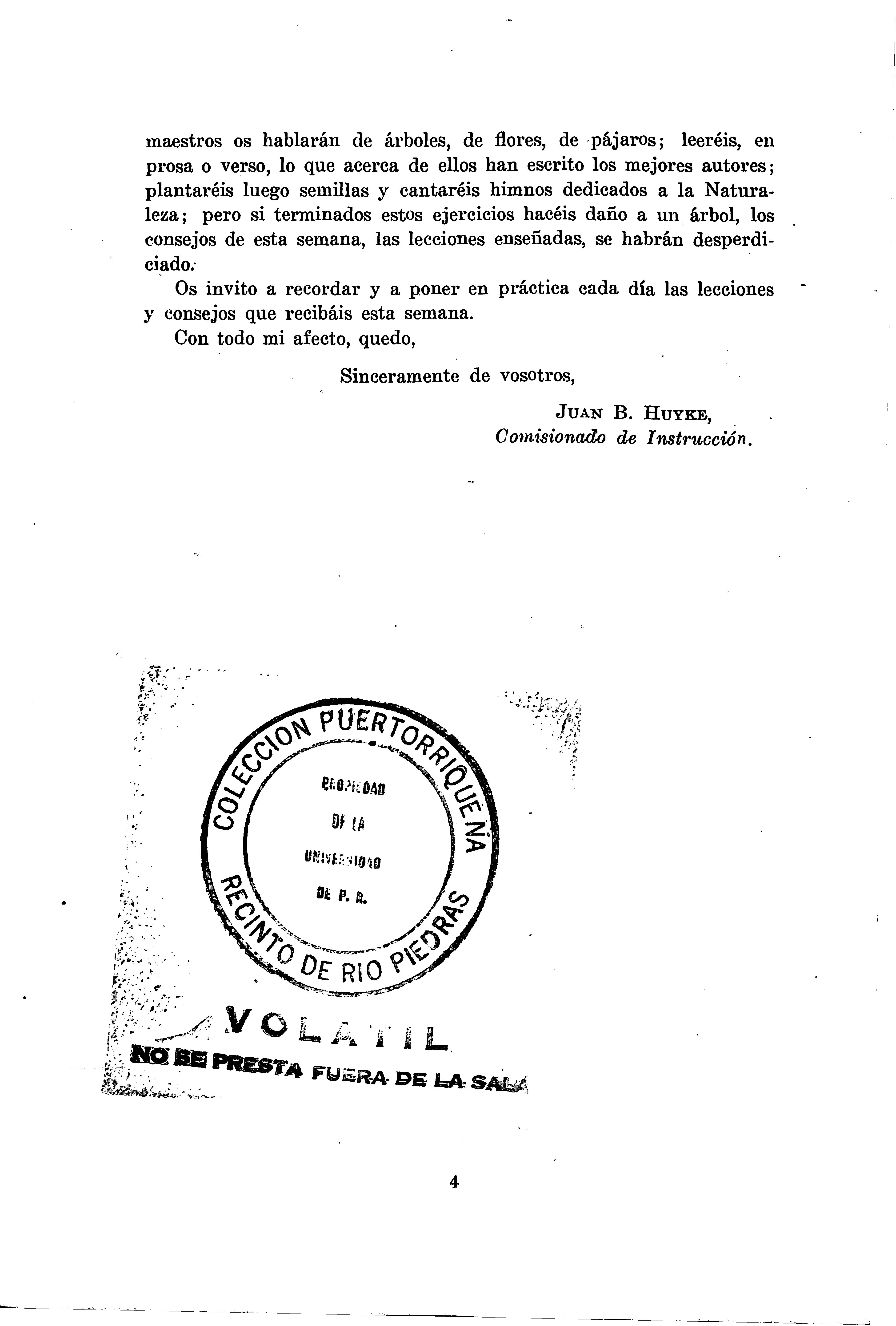 He tenido el gusto de designar, de acuerdo con la ley, el día 26 de este mes para que lo dediquemos a los árboles, a las flores, a los pájaros; a todas esas cosas bellas y buenas de que Dios nos ha rodeado. Por muchos años hemos venido celebrando este día en Puerto Rico con el nomhre ele "DíA DEL ,\&BOL". l\Iiles de árboles y plantas <1c todas elases han sido sembrados por las manos de niños pue1•to1·riqucños y mtll'hos período¡.; cseolares han si<lo dedieados a estimular en vosotros el amor hacia estos amigos de la humanidad, pero sin emhargo, t!s prel'iso plantar muchos miles más. de semillas pal·a devolver a mwstra querida islita toda la hermosura que le han arre1,atado las numos clt:spiacladas que, año tras año, Ja han ido despojando de sns bosq1ws. Si cada 11110 de Jos 213,641 niños que ahora asisten a nuestras escuelas plantara un árbol en este día y se dedicara ll cuidarlo x a protegerlo, si esto se hich,ra todos los años, pronto dt"\'olveríamcs a nuestra tierra una gran parte de su riqueza forestal -:.· dejaríanins uno de los más grandes deberes de los pueblos c•ultos. Los itrholcs son grandeH defensores del hombre; le propor«iouan su madera, sus frutos, sus resinas, y la rica esel'!cia de sus flores; modifican la evaporación aumentando la lluvia; enriquecen d sudo <'onsi>rvan en él la humedad; y ofrecen a las aves abrigo favoreciendo su multiplicación. Os recomiendo especialmente que llevéis por todas partes la idea de plantar árlioles a las orillas de las fincas y de los caminos y de que no se corte un solo árbol de los que se encuentran en las riberas de los ríos y arroyos.