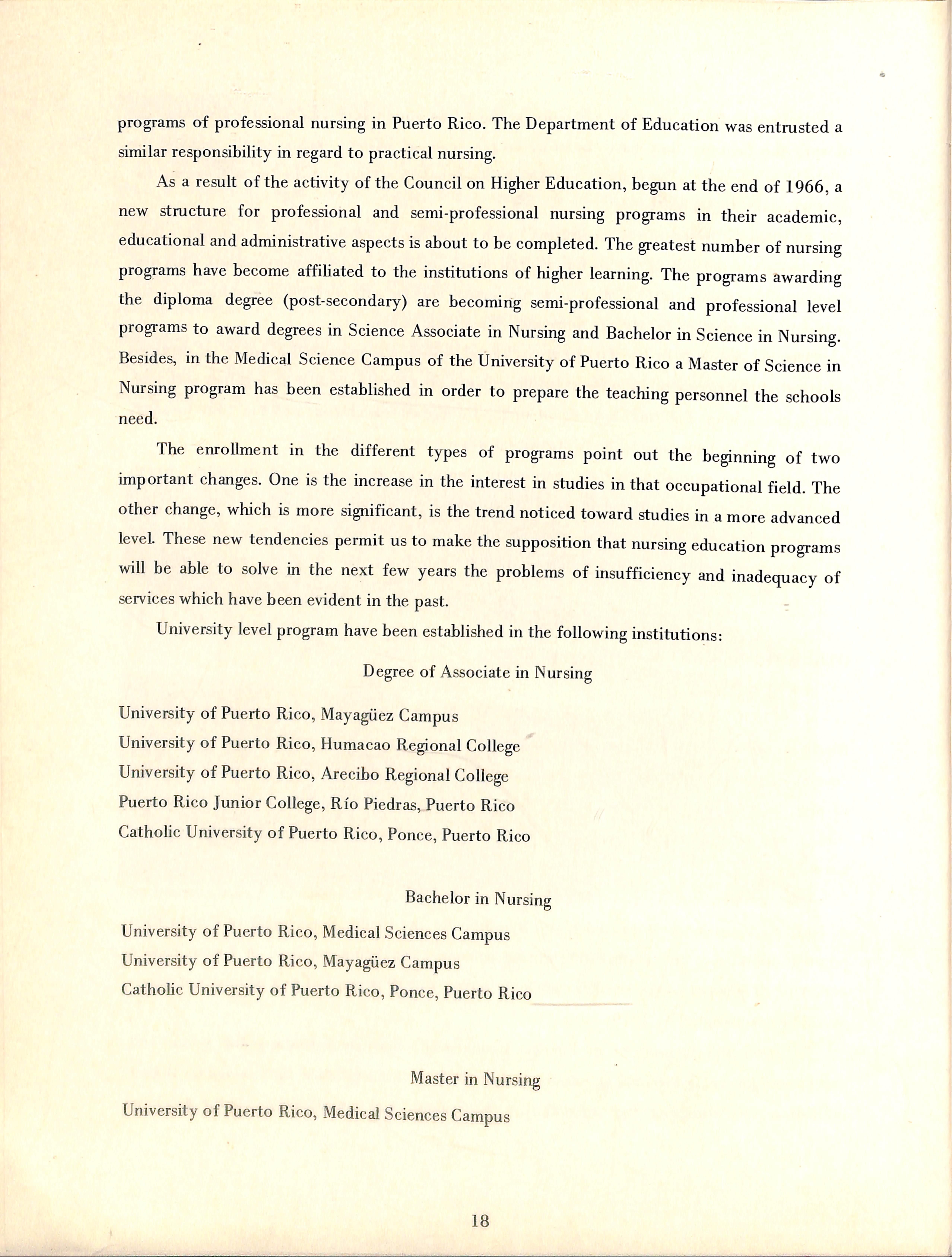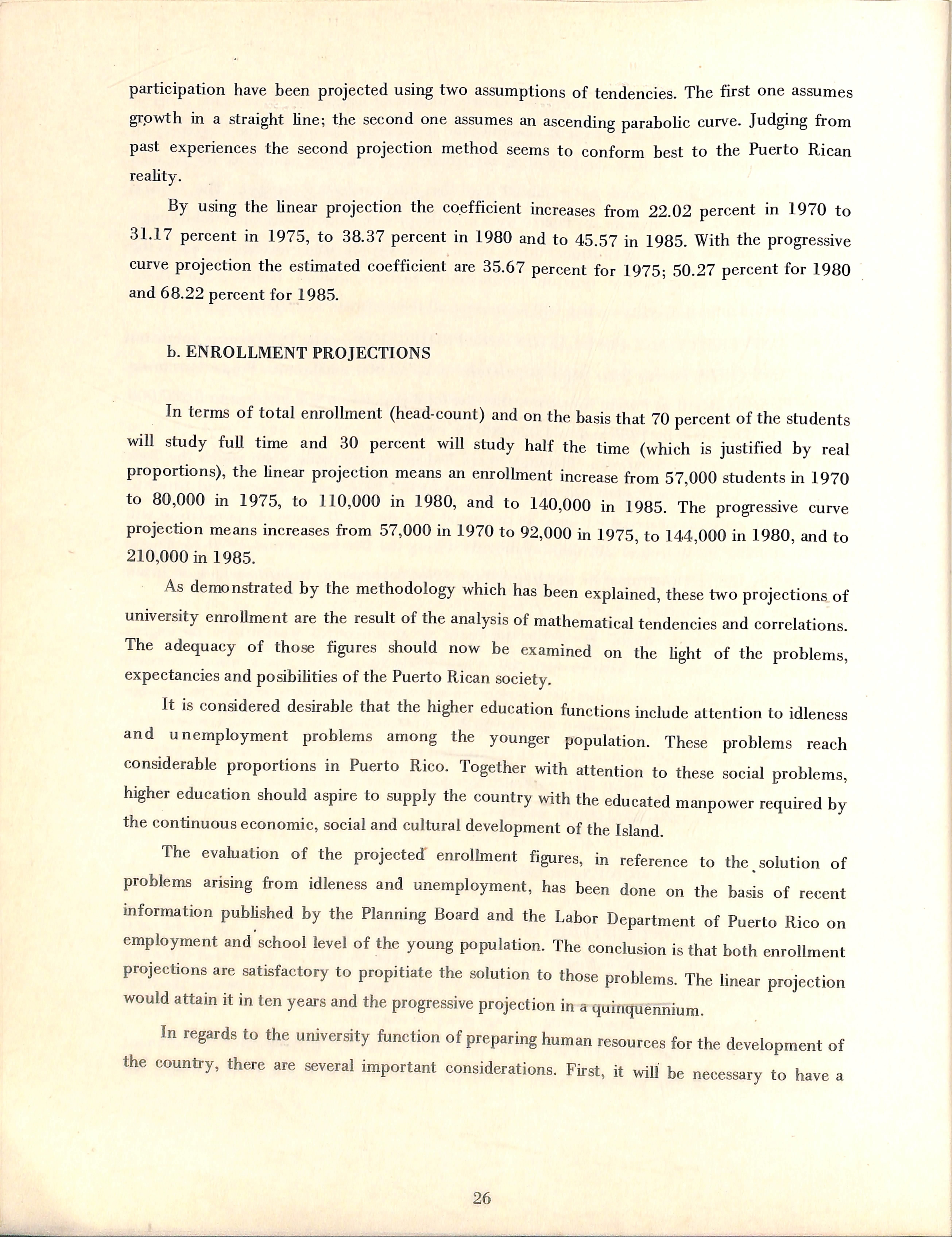 During this three-year period the opening of the Metropolitan Regional College I was planned and it will begin its operations in the city of Bayamón (to the west of the metropolitan arca of San Juan) in August 1971. This college will serve a triple purpose: to take care of the enrollment of students üving in one of the cities with the most rapidly growing populations in Puerto Rico: to satisfy the needs for technical education in that sector and to diminish the pressure of the demand in the Río Piedras campus which has reached the máximum enrollment of 27,000.