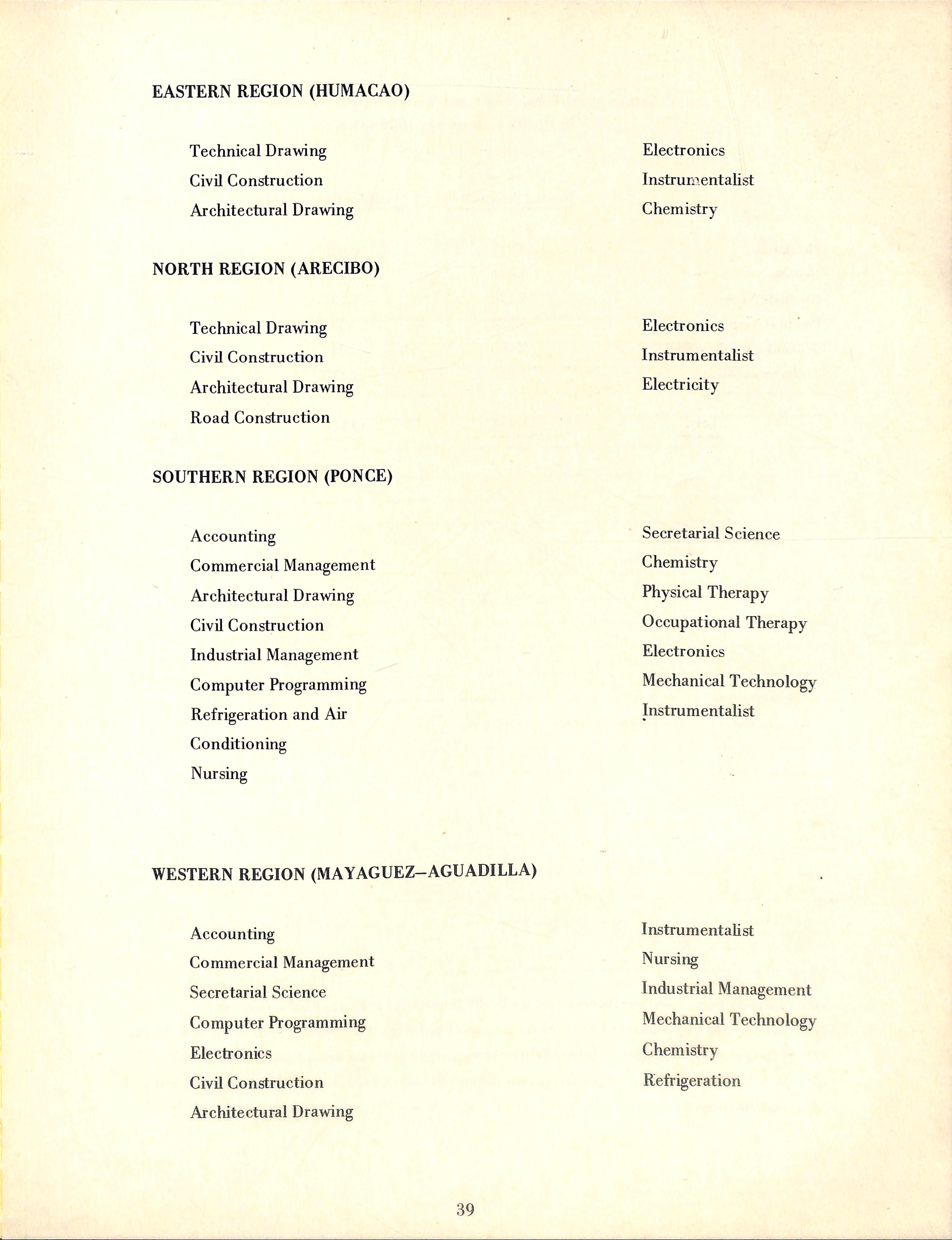 The public university, in harmony with its poUcy of making educatíonal opportunities of a high quahty, at the lowest possible cost, accessible to the residents of the Island, has estabUshed three Tcgional coUeges and has planned the establishment of another one to begin operating in August 1971.
