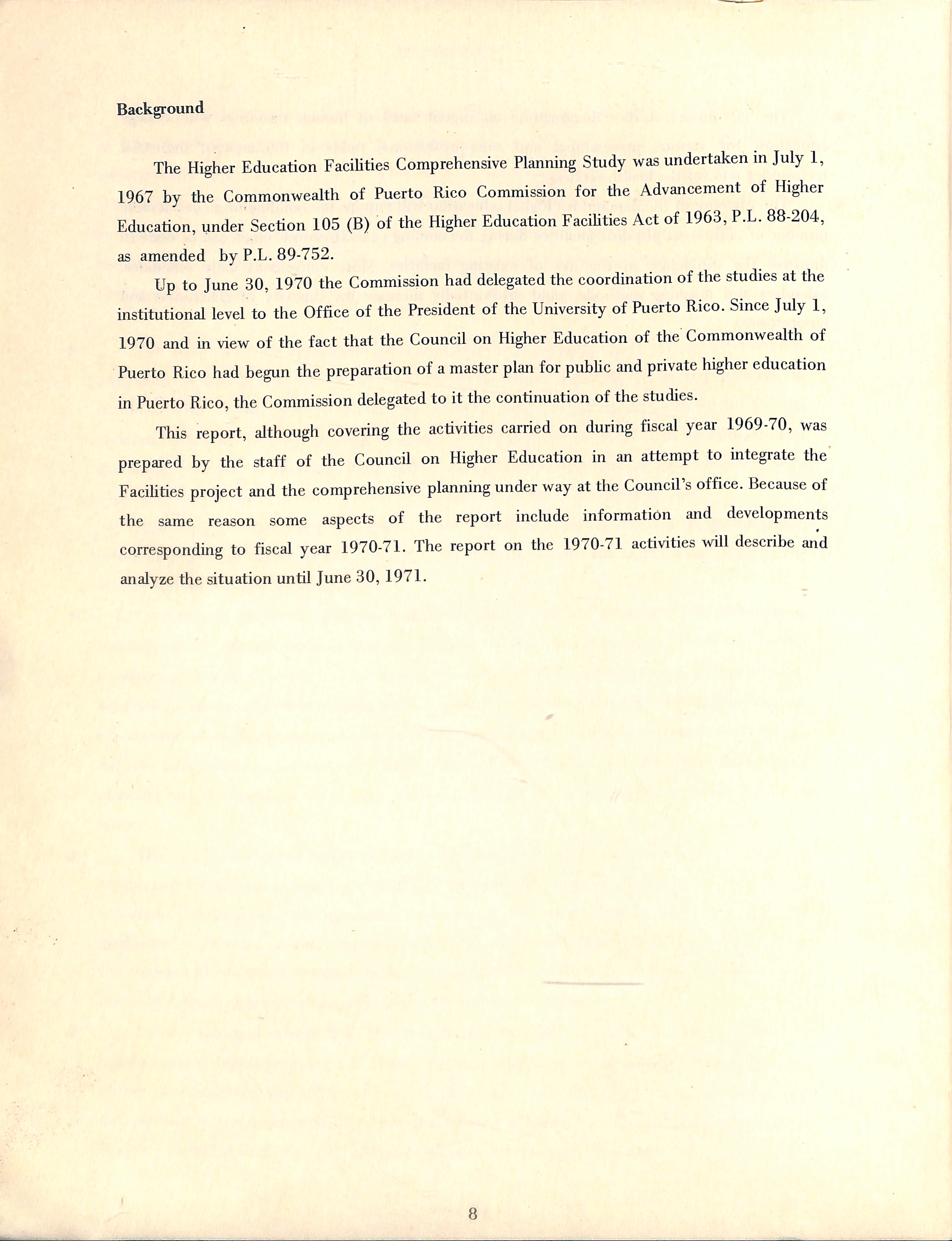 The Higher Education Facilities Comprehensive Planning Study was undertaken in July 1, 1967 by the Commonwealth of Puerto Rico Commission for the Advancement of Higher Education, under Section 105(B) of the Higher Education Facilities Act of 1963,P.L.88-204, as amended hy P.L. 89-752.