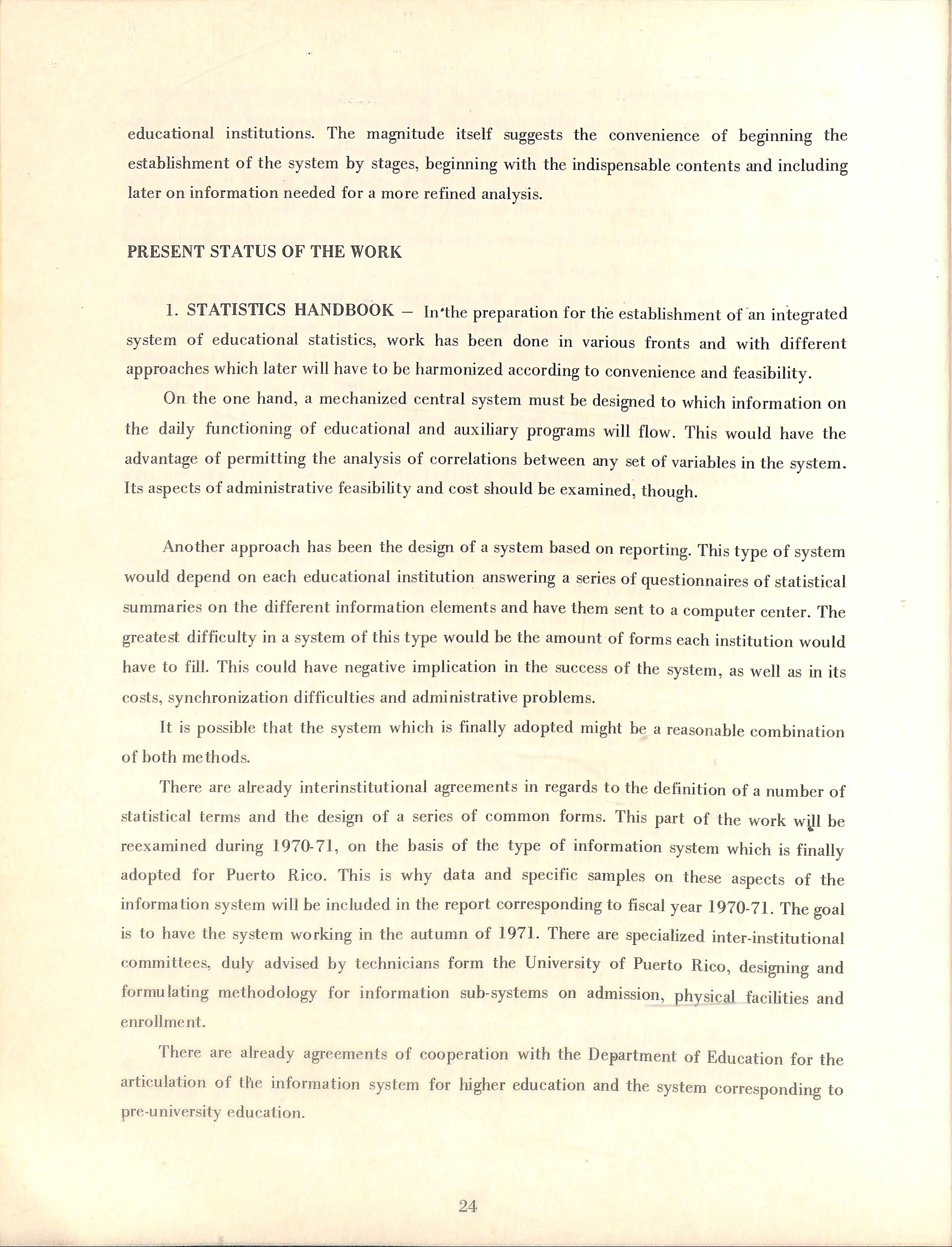 Up to June 30, 1970 the Commission had delegated the coordination of the studies at the institutional level to the Office of the President of the University of Puerto Rico. Smce July 1, 1970 and in view of the fact that the Council on Higher Education of the Commonwealth of Puerto Rico had hegun the preparation of a master plan for puhhc and prívate higher education in Puerto Rico,the Commission delegated to it the continuation of the studies.
