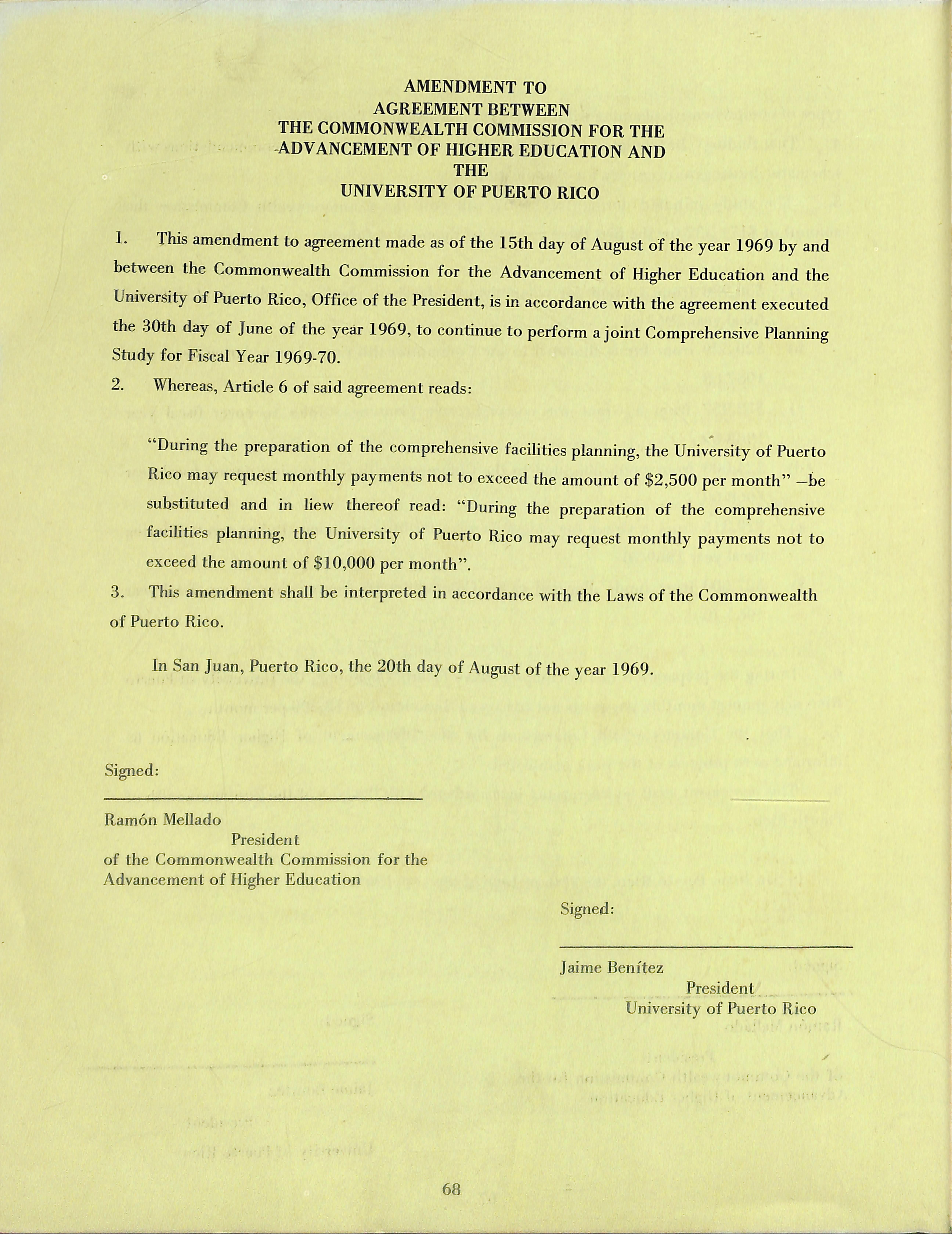 1. This amendment to agreement made as of the I5th day of August of the year 1969 by and between the Commonwealth Commission for the Advancement of Higher Education and the University of Puerto Rico, Office of the President,is in accordance with the agreement executed the 30th day of June of the yeár 1969,to continué to perform a joint Comprehensive Planning Study for Fiscal Year 1969-70.