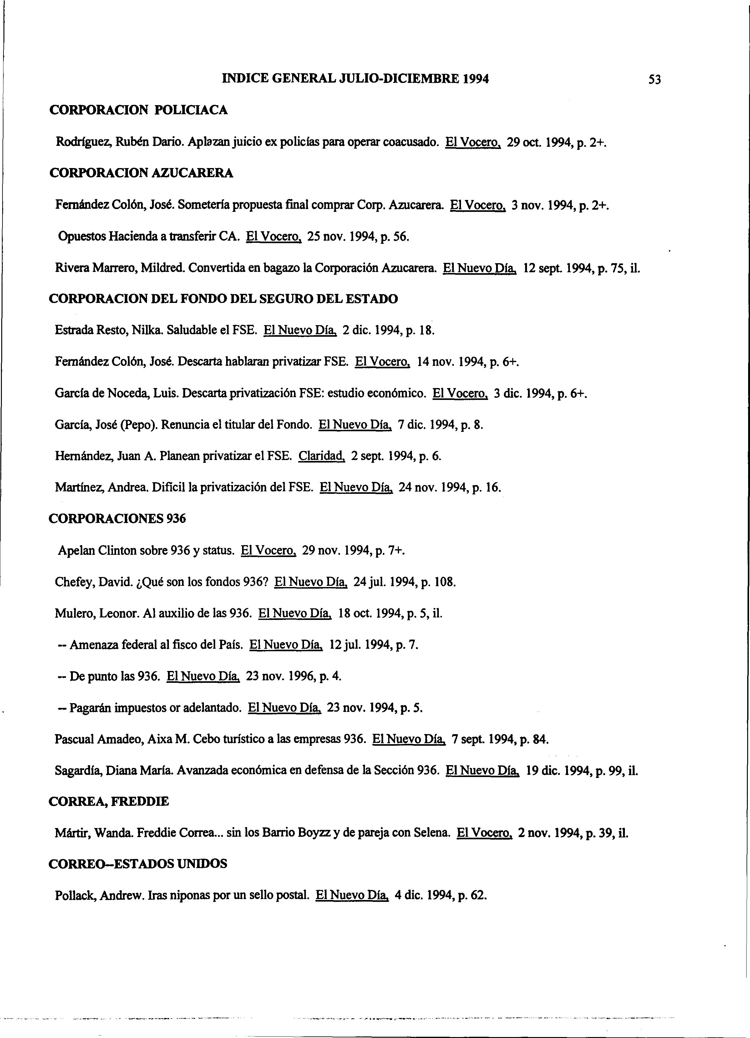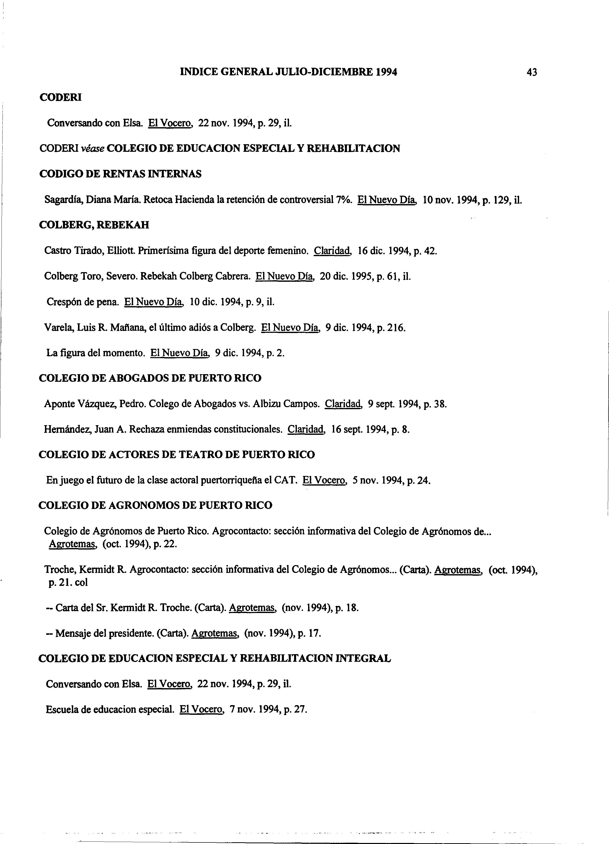 INDICE GENERAL JULIO-DICIEMBRE 1994 INDIZADO POR: GLADYS CRUZ OBDULIO LEBRON CARMEN LOPEZ SANTOS NILDA SANCHEZ ROBLES MARIA VILLAMIL CARLOS GARCIA ELIZABETH PEREZ VIDALINA RODRIGUEZ RAMON FOLCH IRIS MARGARITA TORRES EDITADO POR: CARLOS GARCIA HERNANDEZ