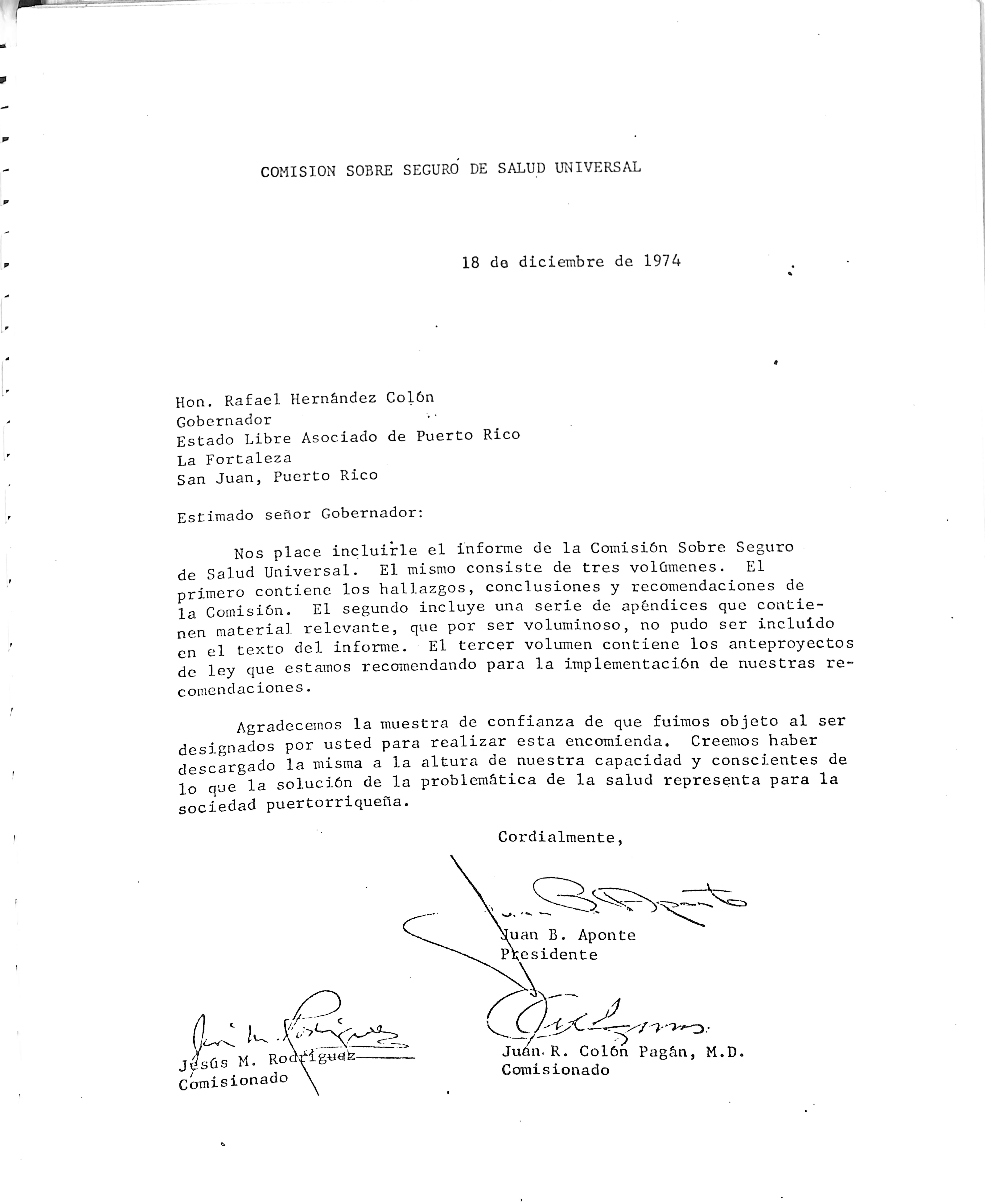 Agradecemos la muestra de confianza de que fuimos objeto al ser designados por usted para realizar esta encomienda. Creemos haber descargado la misma a la altura de nuestra capacidad y conscientes de lo que la solución de la problemática de la salud representa para la sociedad puertorriqueña.