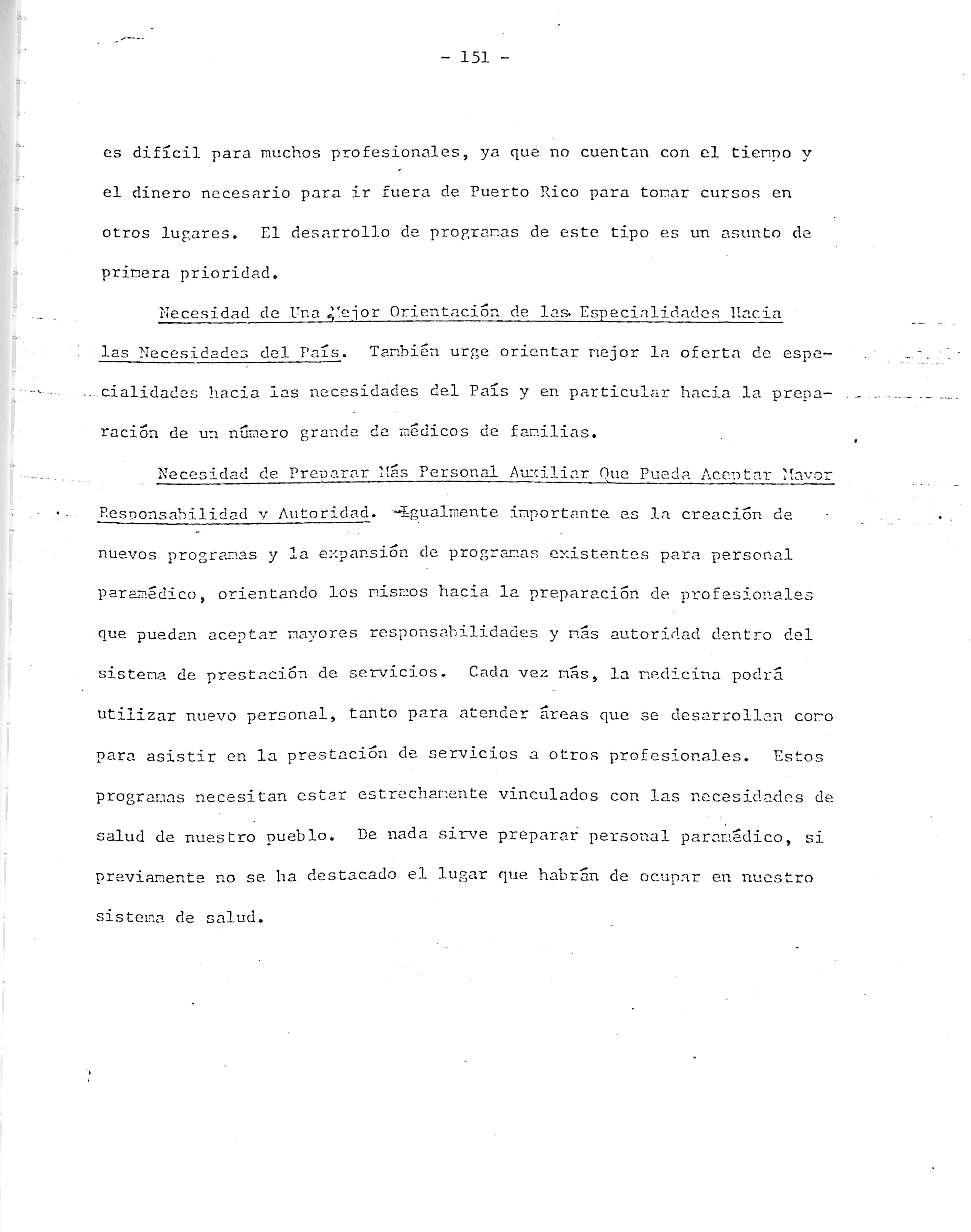 Responsabilidad y Autoridad, -igualmente importante es la creación de nuevos progranas y la expansión de programas existentes para personal paramedico, orientando los mismos hacia la preparación de profesionalas que puedan aceptar mayores responsabilidades y mas autoridad dentro del sistema de prestación de servicios. Cada vez mas, la riedicina podra utilizar nuevo personal, tanto para atenaer areas que se desarrollan como para asistir en la prestación de servicios a otros profesionales. Estos programas necesitan estar estrechamente vinculados con las necesidades de salud de nuestro pueblo. De nada sirve preparar personal paramedico, si previamente no se ha destacado el lugar que habran de ocupar en nuestro sistema de salud.