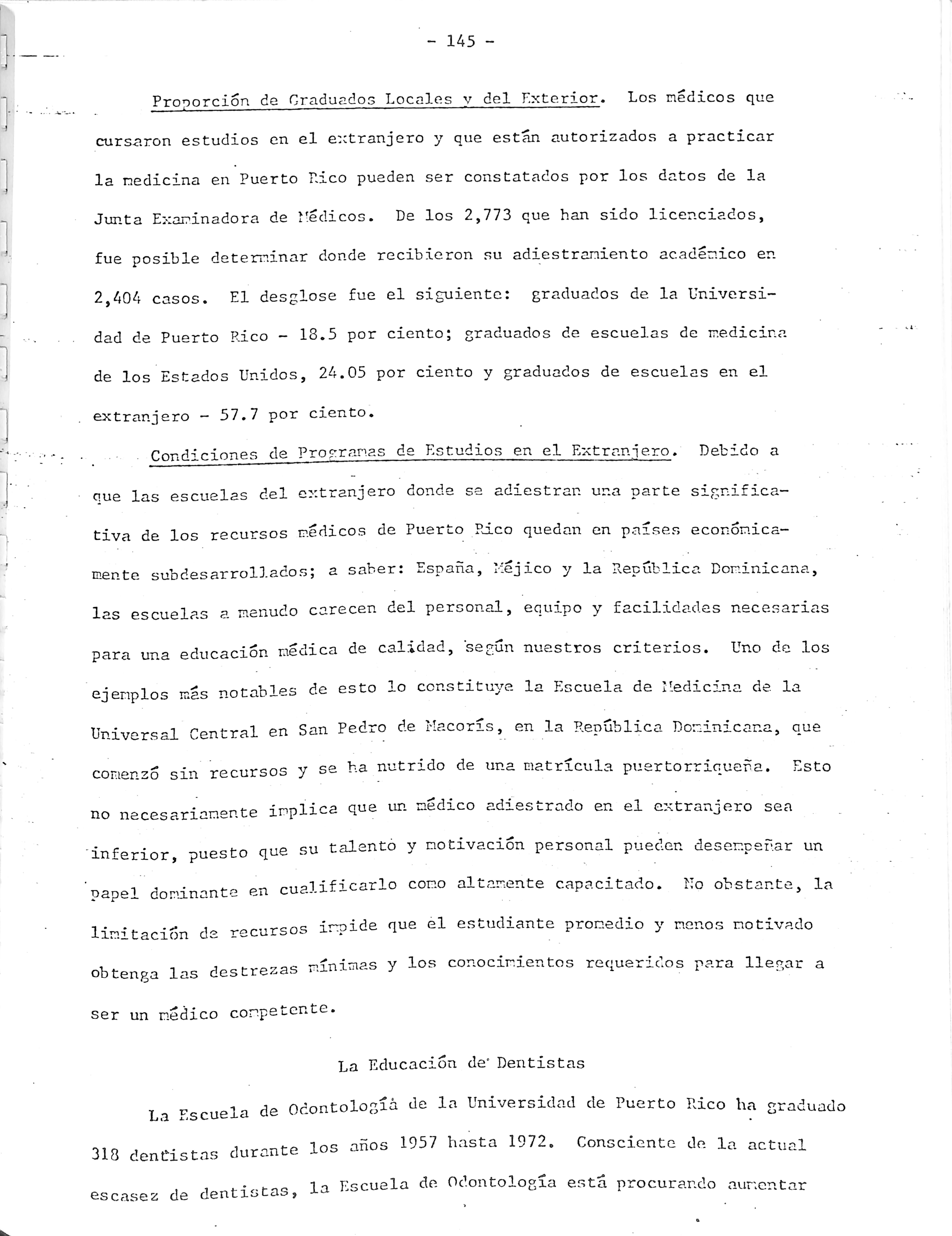 Condiciones de Progranas de Estudios en el Extranjero. Debido a que las escuelas del extranjero donde se adiestran una parte significa tiva de los recursos médicos de Puerto PcLco quedan en países econonicamente subdesarrollados; a saber: España, Méjico y la República Dominicana, las escuelas a menudo carecen del personal, equipo y facilidades necesarias para una educación medica de calidad, según nuestros criterios. Uno de los ejemplos mas notables de esto lo constituye la Escuela de Medicina de la Universal Central en San Pedro de Hacorís, en la República Dominicana, que comenzó sin recursos y se ha nutrido de una matrícula puertorriqueña. Esto no necesariamente implica que un medico adiestrado en el extranjero sea inferior, puesto que su talento y motivación personal pueden desempeñar un 1 j «-n fnal if"i cario como altamente capacitado. No obstante, la papel domanante en cuaj.xj.-'-" r ,