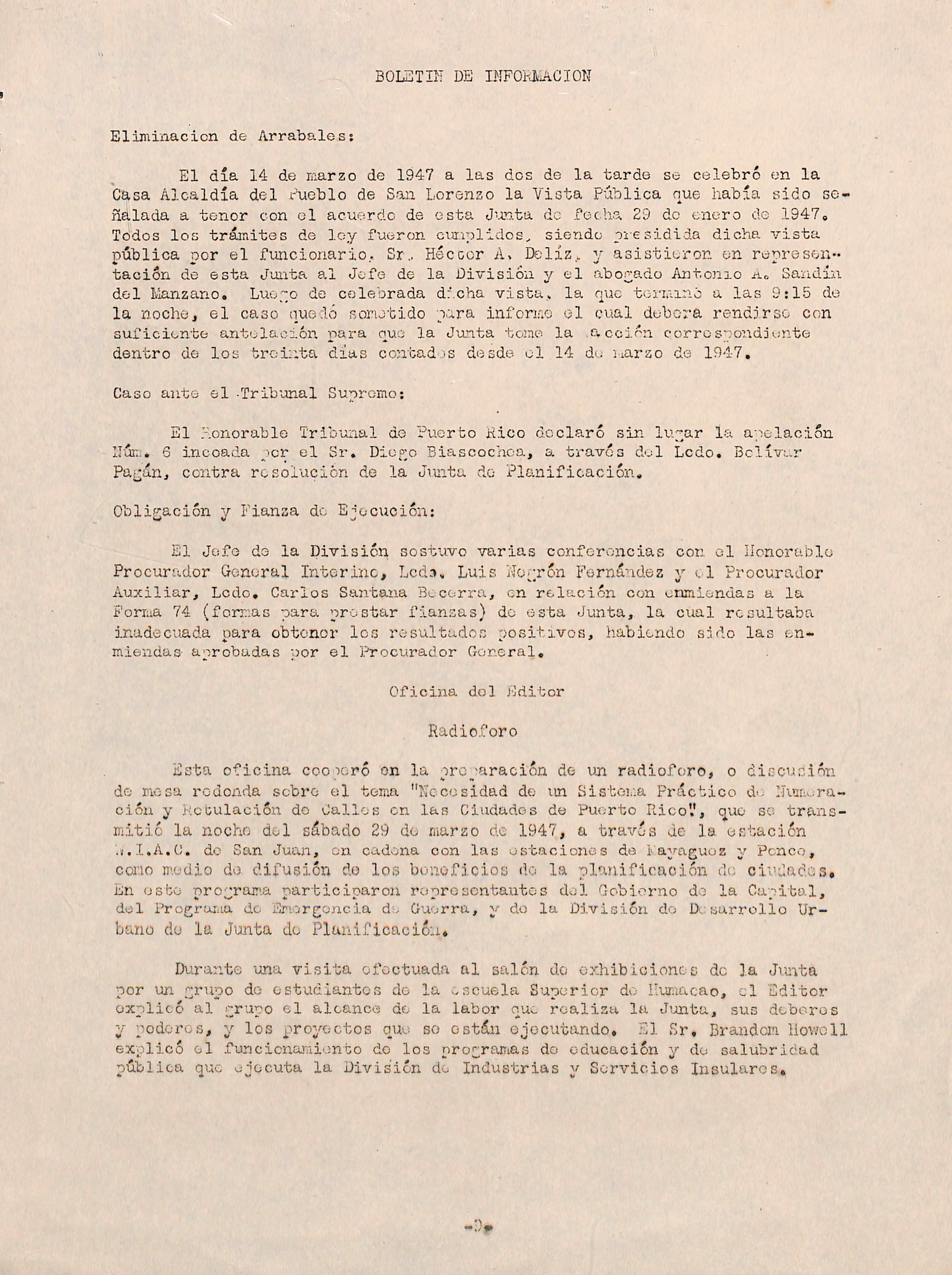 Esta oficina cooperó on la preparación de un radioforo, o discusión de mesa redonda sobro el tema "Kcccsidad do voi Sistema Práctico do Mvnm..ración y Rotulación de Calles on las Ciudades de Puerto RicoV, que so trans mitió la nocho del sábado 29 de marzo do 1947, a travos de la estación '.í.I.A.C, de San Juan, on cadena con las estaciones de Kaynguoz y Penco, como medio do difusión do los bonoficios do la planificaoión de ciudades. En esto nrcram-a narticioarou reore sentantes del Gcbiorno do la Caorbal, del Programa do Smorgoncia de Guerra, y do la División do Desarrollo Ur bano do la Junta do Planificación,