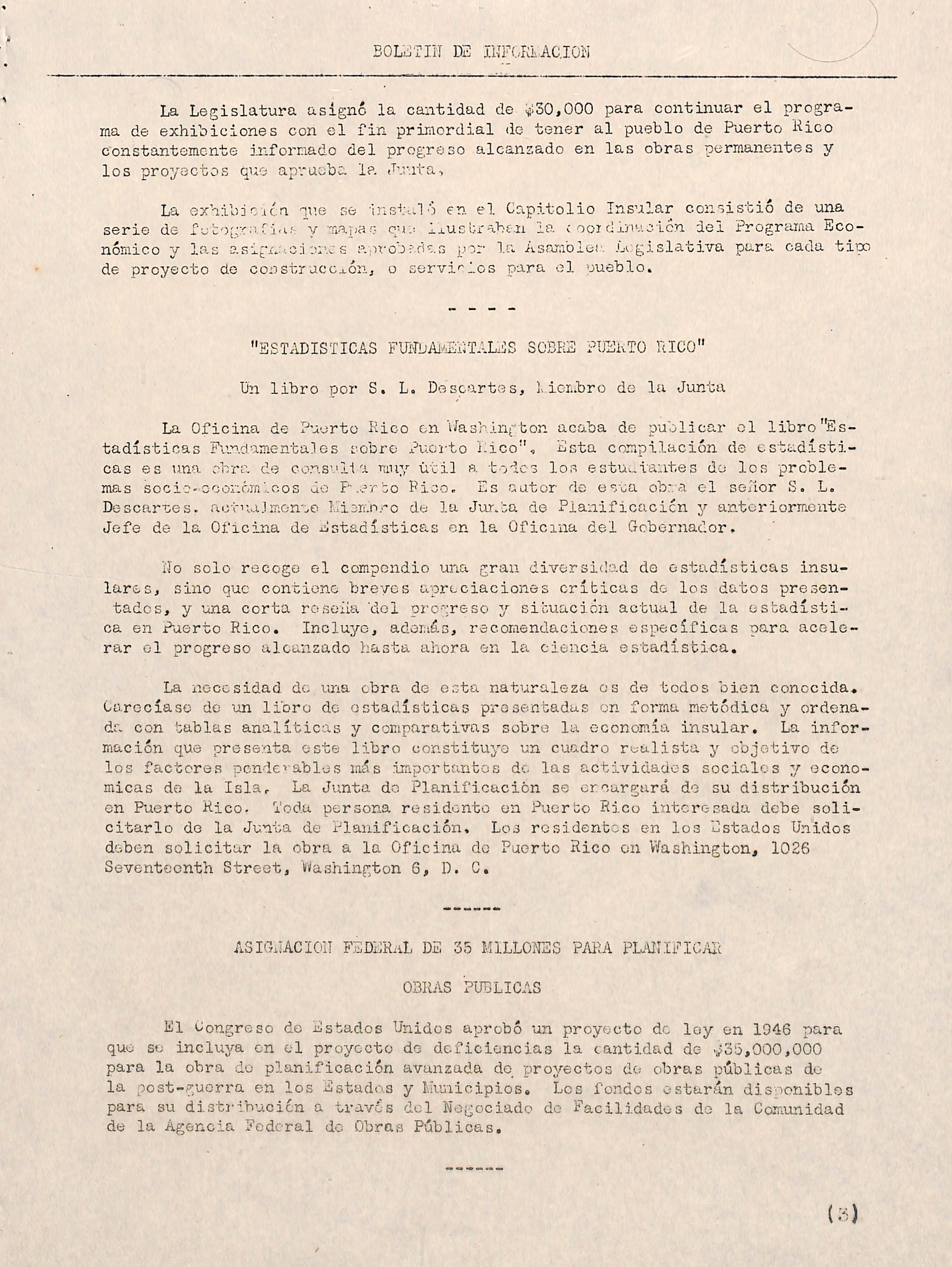 La Oficina de Puerto Rico en V/ashington acaba de publicar el libro"Es tadísticas Fundamentales sobre Puoi-to Rico"., Esta compilación de estadísti cas es una obra de consi'l-ia muy útil a todos lo.s estui-iantes do los proble mas socio-Goonómloos do P.erbo Pico. Es autor de esta ob:;-a el selíor S. L. Descarnes, aotiui.lmonue Itijrí.b.--o de la Junta de Planificación y antcriormnate Jefe de la Oficina de Estadísticas en la Oficina del Gobernador.