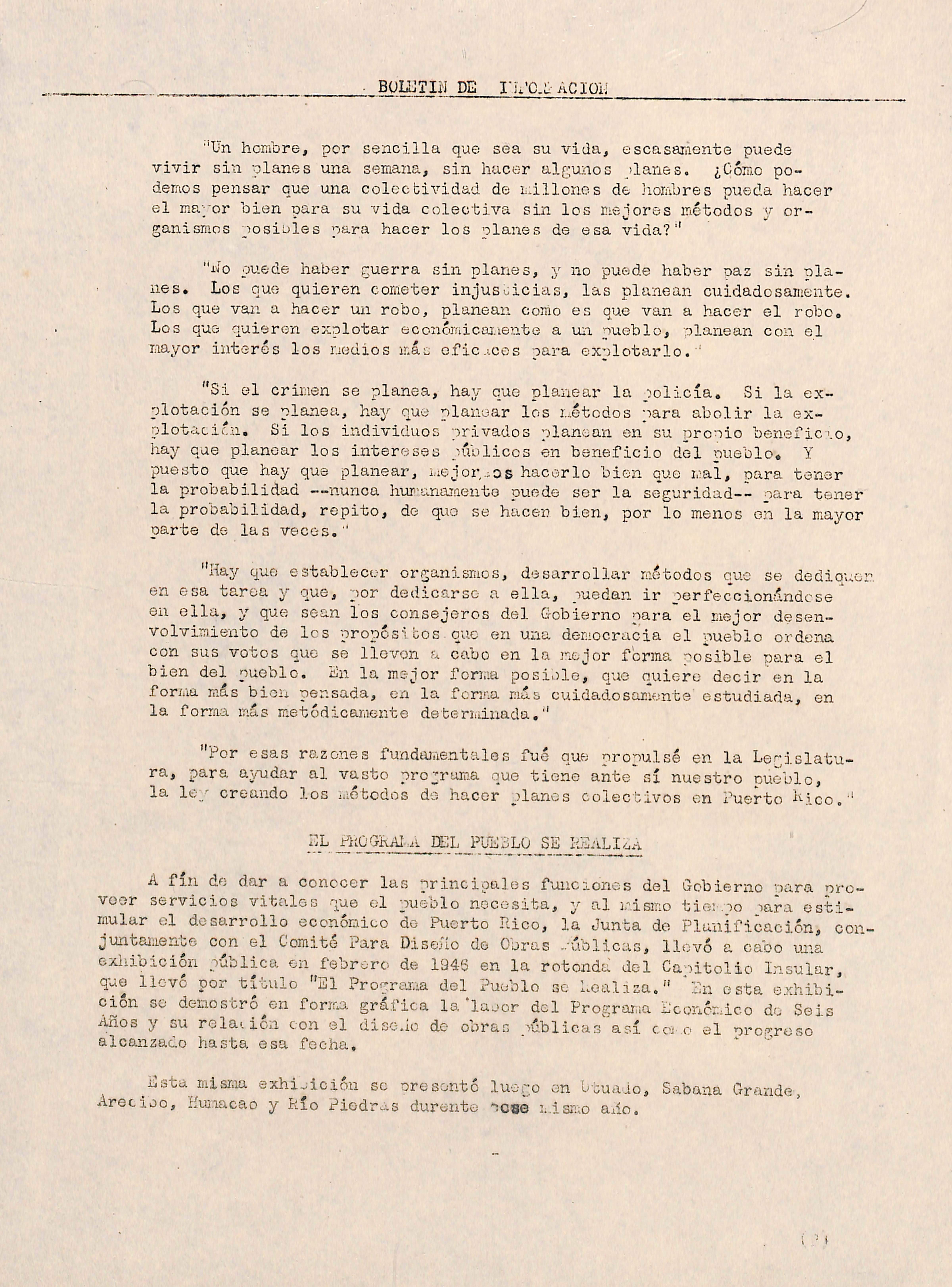 ^ fin de dar a conocer las principales funciones del Gobierno cara orovosr servicios vitales que el pueblo necesita, y al mismo tierno rara esti mular el desarrollo económico do Puerto nico, la Junta de Planificación, con juntamente con el Comité Para Diseño de Guras -'úblicas, llovó a cabo una exliibicion pública en febrero de 1946 en la rotonda del Capitolio Insular, que llovó por título "El Progroma del Pueblo se hoalaza." 'pn esta exhibi ción se denostró^en forrea gráfica la "lauor del Prograraa Económico de Seis Años y su relai ion con el diso.io de obras rúblicas así ccj o el nrogreso alcanzado hasta esa fecha.