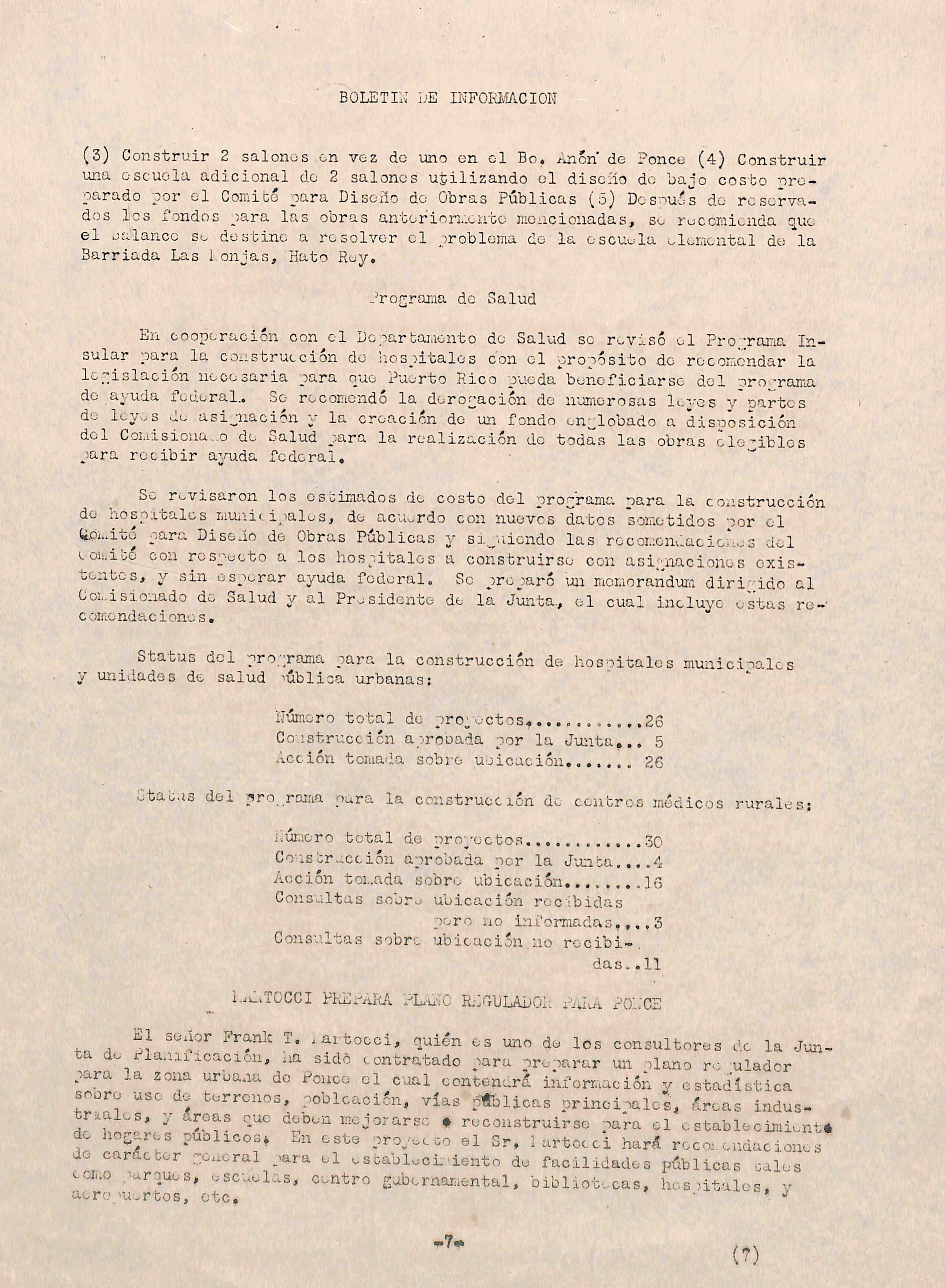 4. .4 Frank T. xartocci, quien es uno de los consultores de la Jun ta de rlaniiicacion, ha sido contratado para preparar un ulano ro ulador para la zona urbaxia de Ponco el cual centonará inforruación y estadística soore use do terrenos, poblcación, vías ofblicas principales, áreas indusria es, y áreas ouc deben mejorarse * reconstruirse para el estableciraientÉ' de horares públicos» En este proyecoo el Sr, 1 artccci hará rccocenduciones" carácter .qexxral para el escauleci.-iento de facilidades públicas cales cori;o .^arques, escuelas, centro subernomental, bibliotecas, hos^itale^. v aero.iuertos, etc. '