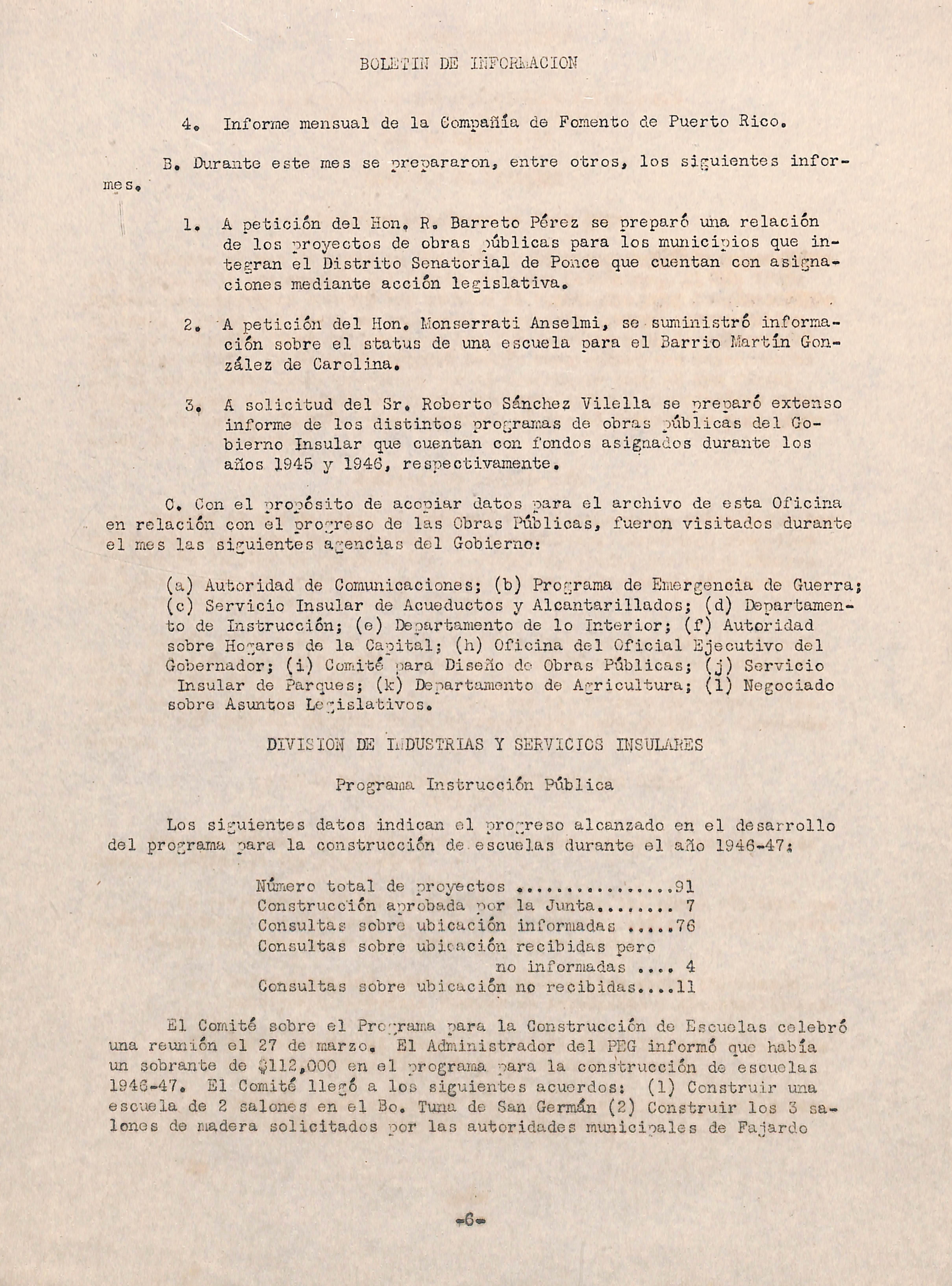 Esta Oficina suministra toda clase de información a los le-^isladcres funcionarios municipales, la Oficina del Gobornacor, y las aeoncias delG^ sobre el progreso alcanzado por las obras públicas (4)