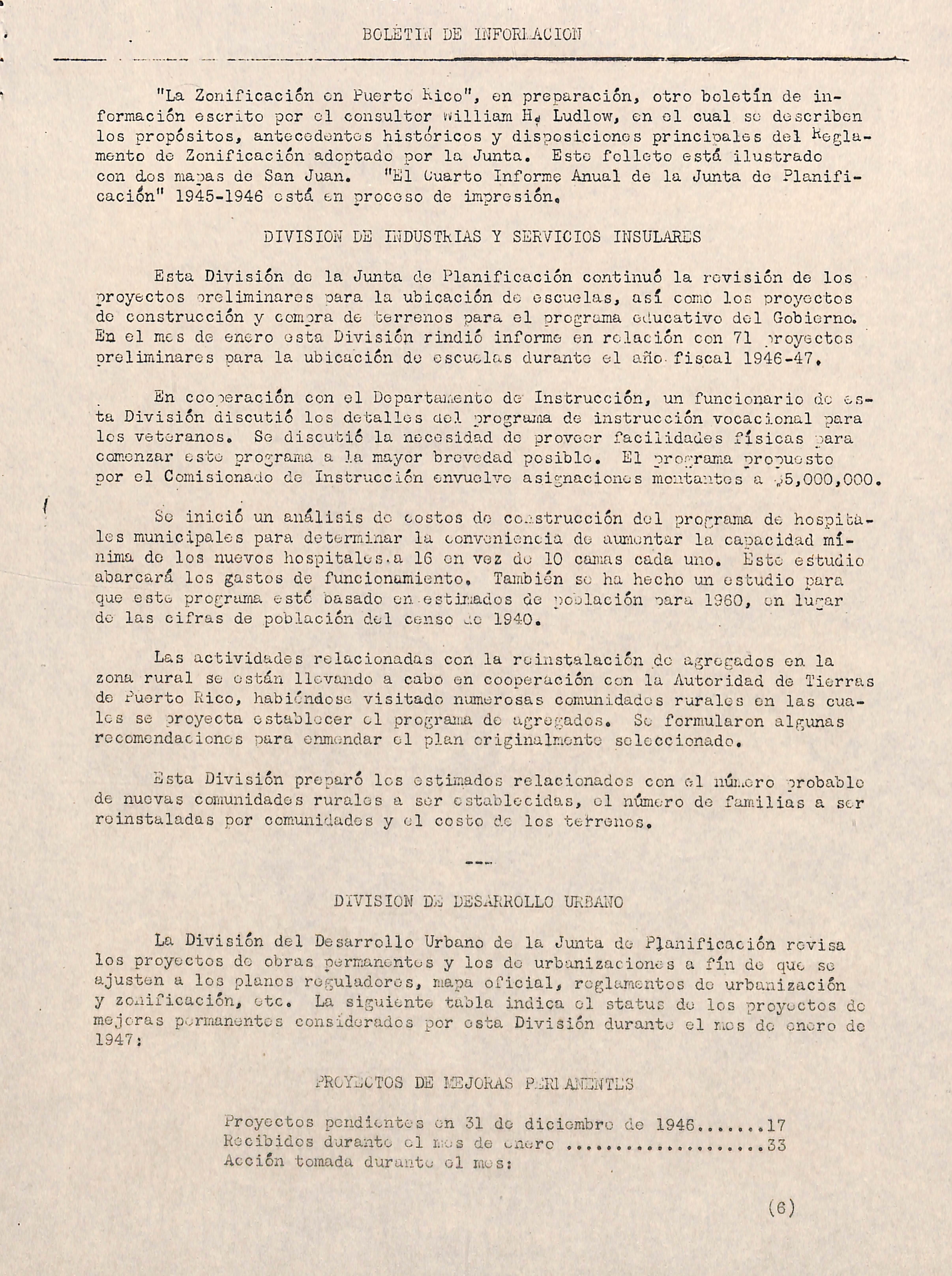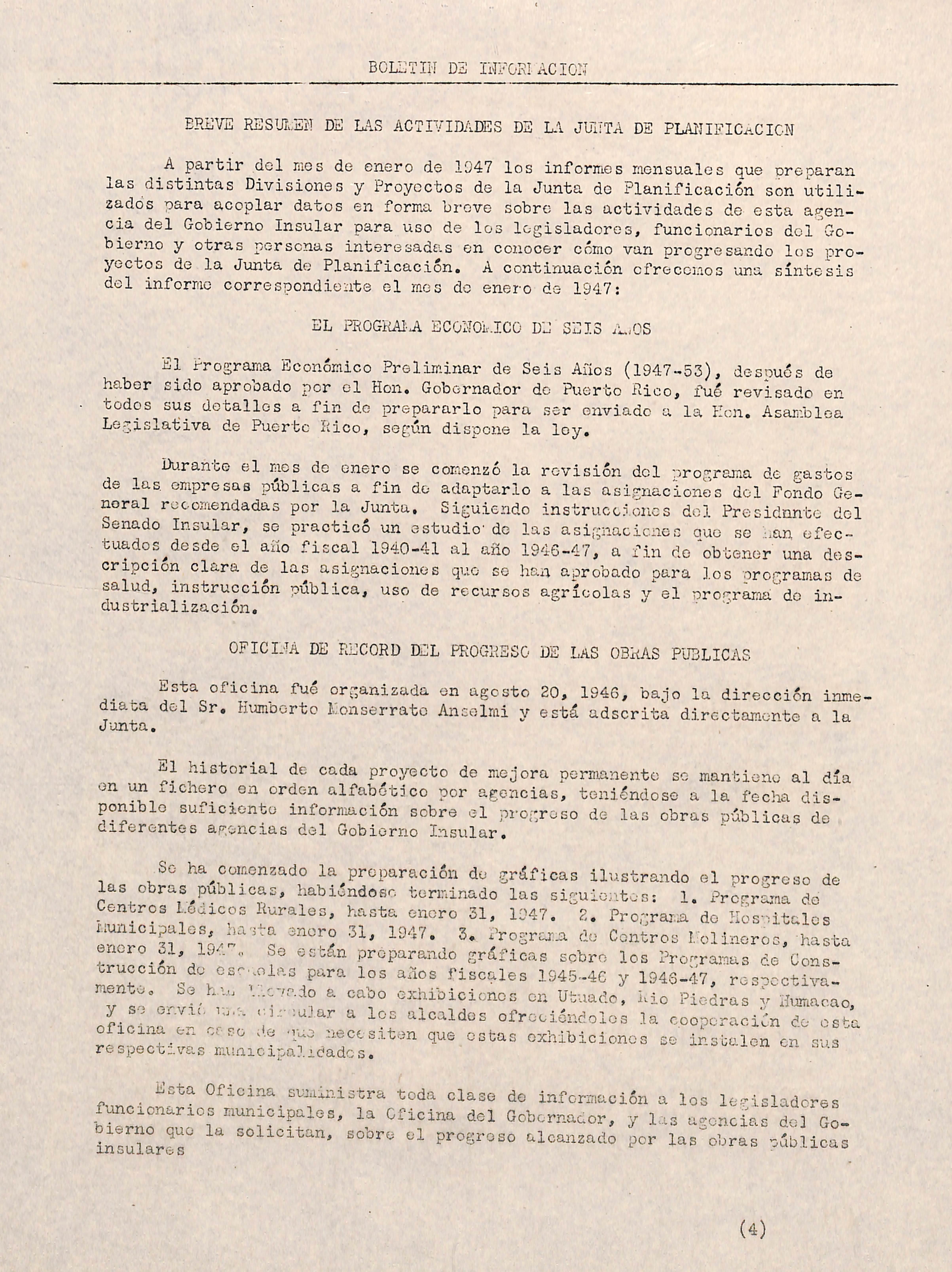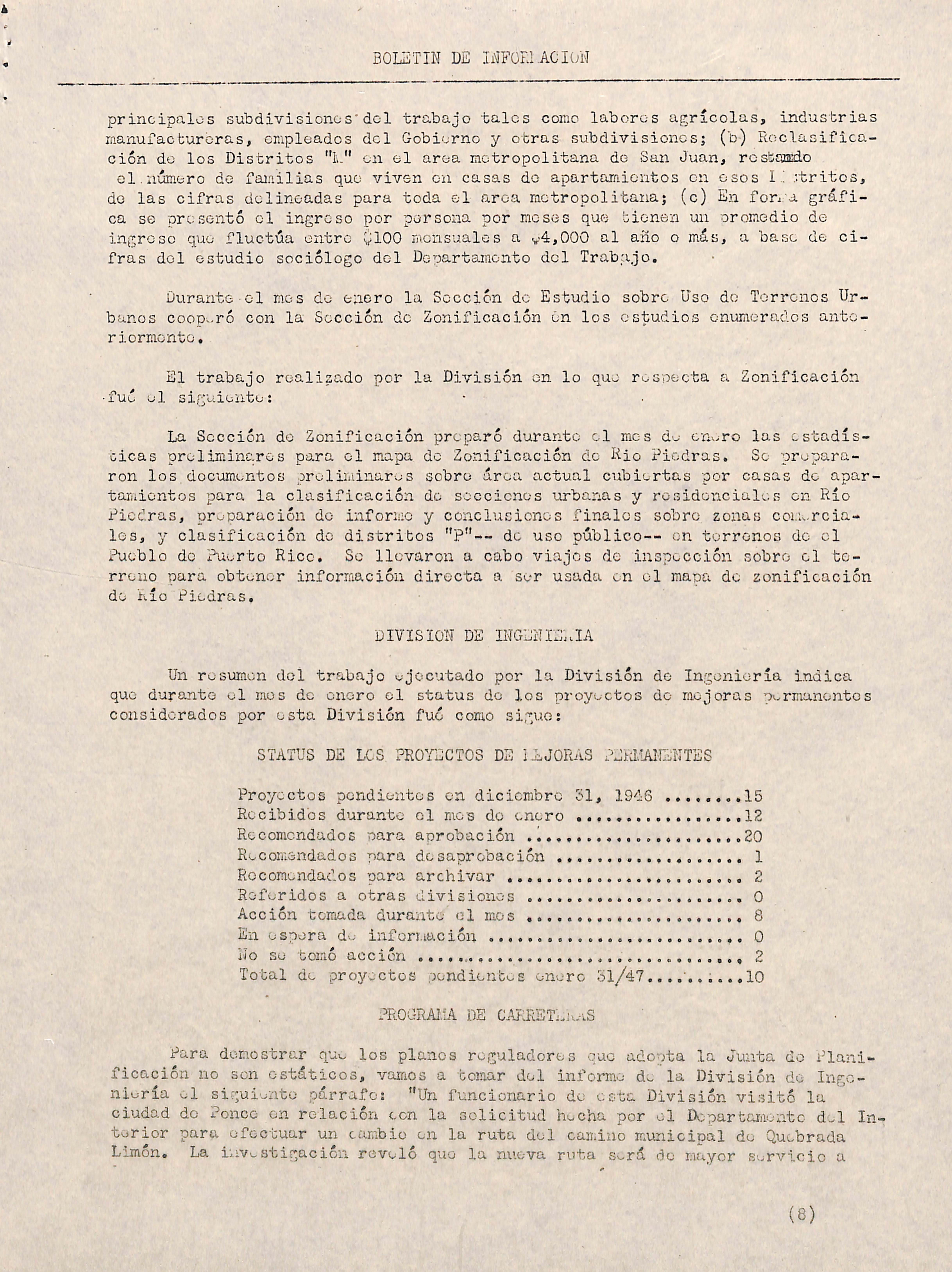 A partir del raes de enero de 1047 los informes mensuales que preparan las distintas Divisiones y Proyectos de la Junta de Planificación son utili zados para acoplar datos en forma breve sobre las actividades de esta agen cia del Gooierno Insular para uso de los legisladores, funcionarios del Go bierno y otras personas interesadas en conocer cómo van progresando los pro yectos de la Junta de Planificación. A continuación ofrecemos una síntesis del informe correspondiente el mes de enero de 1947;