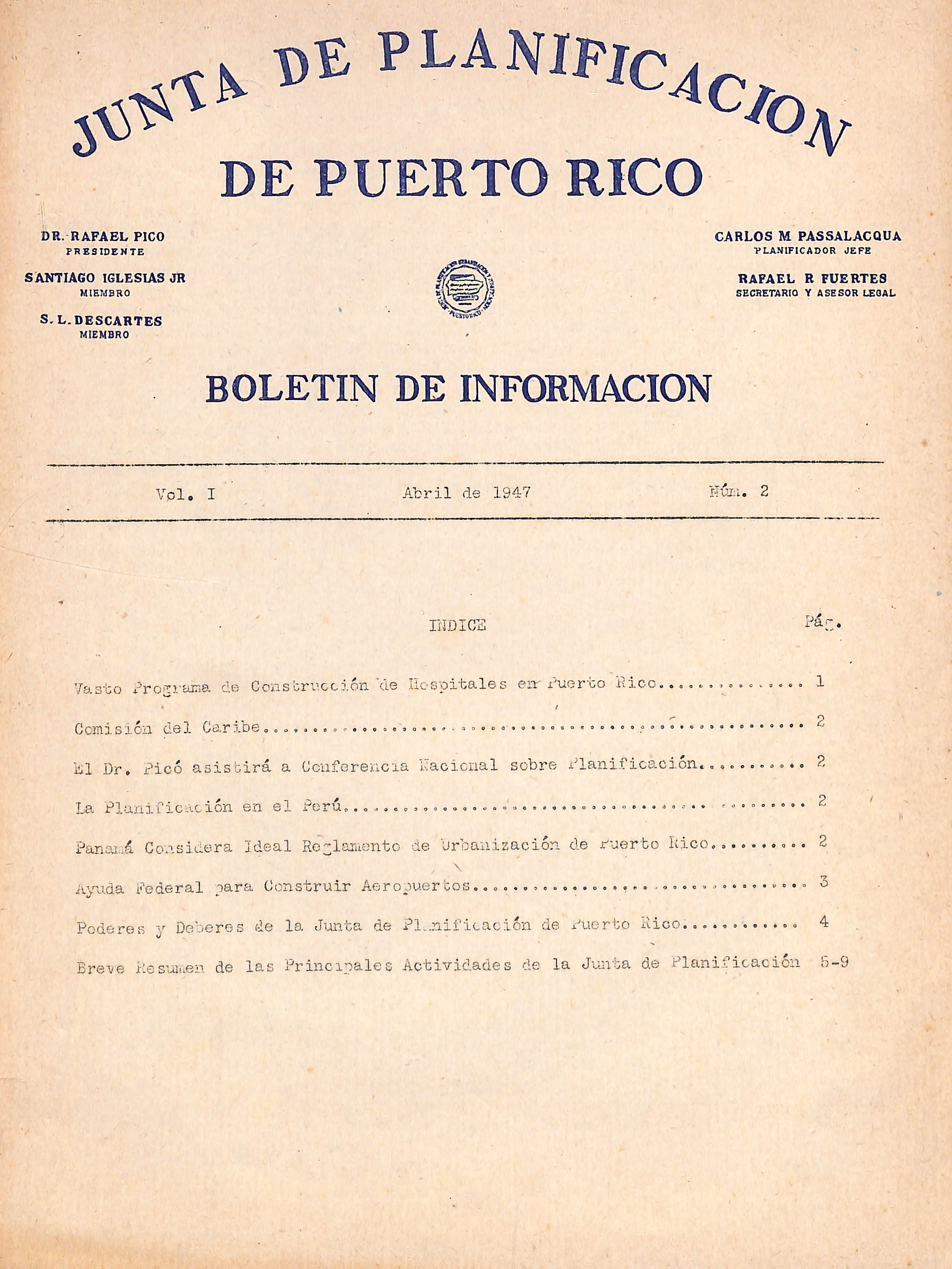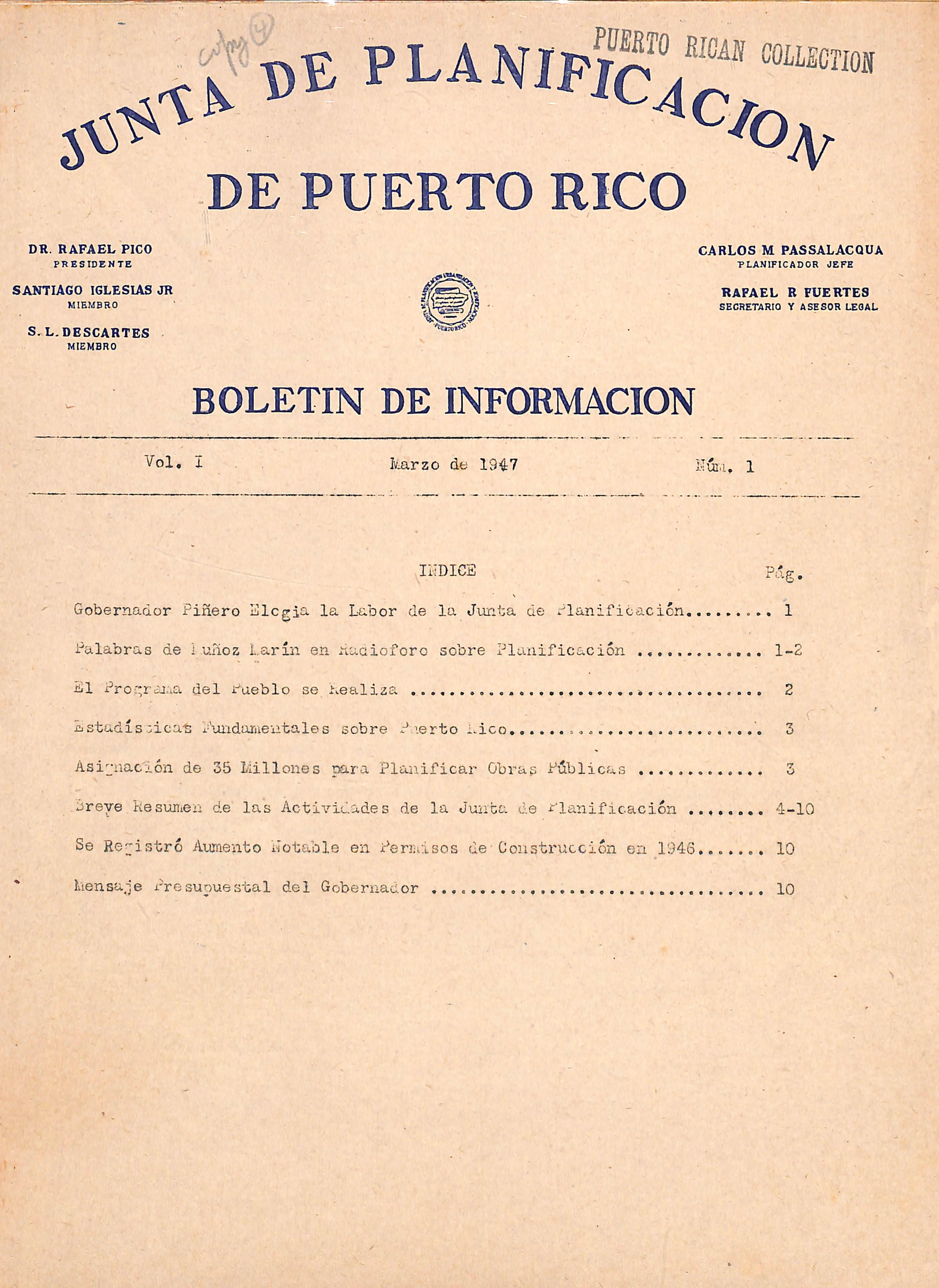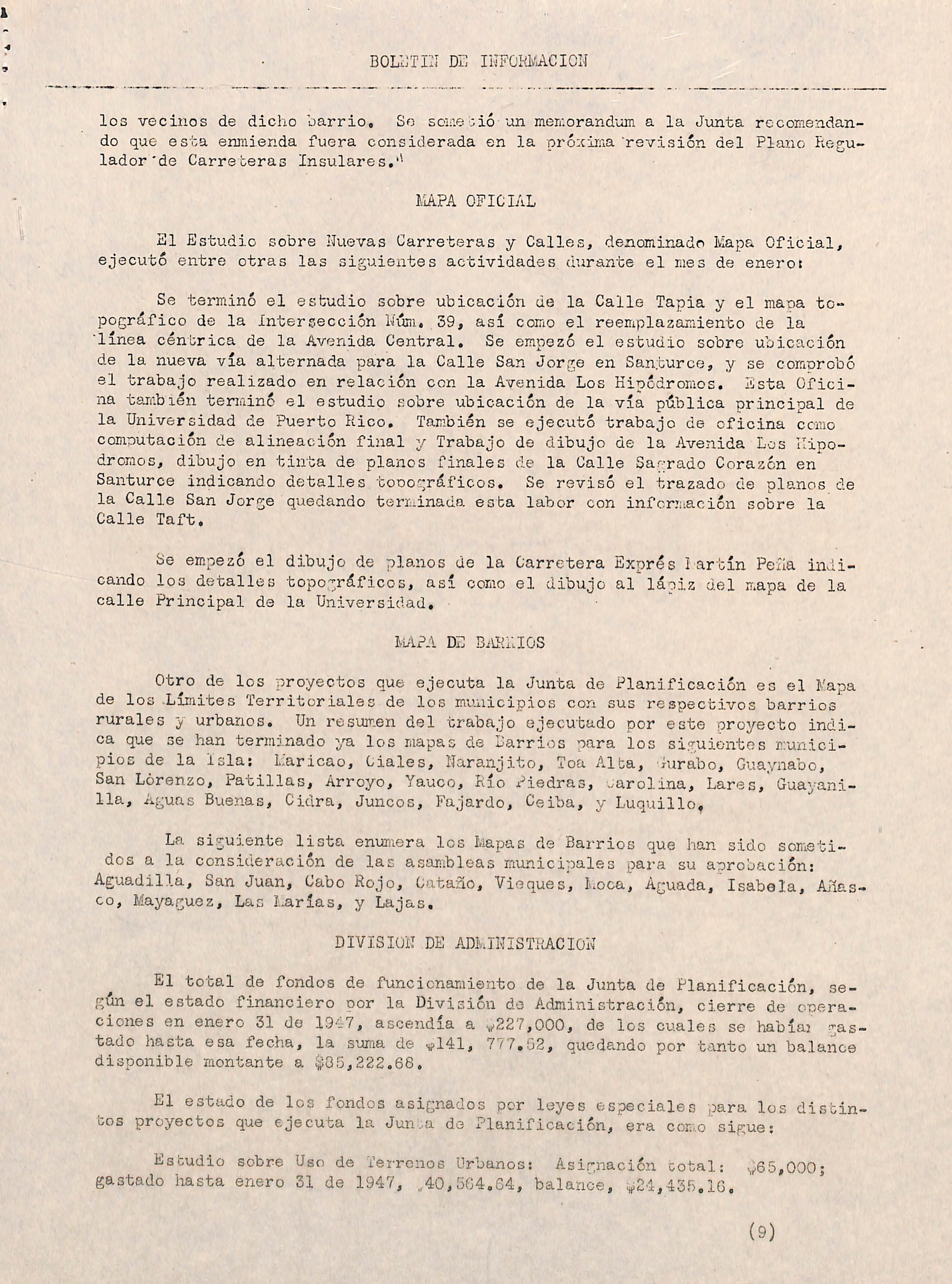 A partir del raes de enero de 1047 los informes mensuales que preparan las distintas Divisiones y Proyectos de la Junta de Planificación son utili zados para acoplar datos en forma breve sobre las actividades de esta agen cia del Gooierno Insular para uso de los legisladores, funcionarios del Go bierno y otras personas interesadas en conocer cómo van progresando los pro yectos de la Junta de Planificación. A continuación ofrecemos una síntesis del informe correspondiente el mes de enero de 1947;