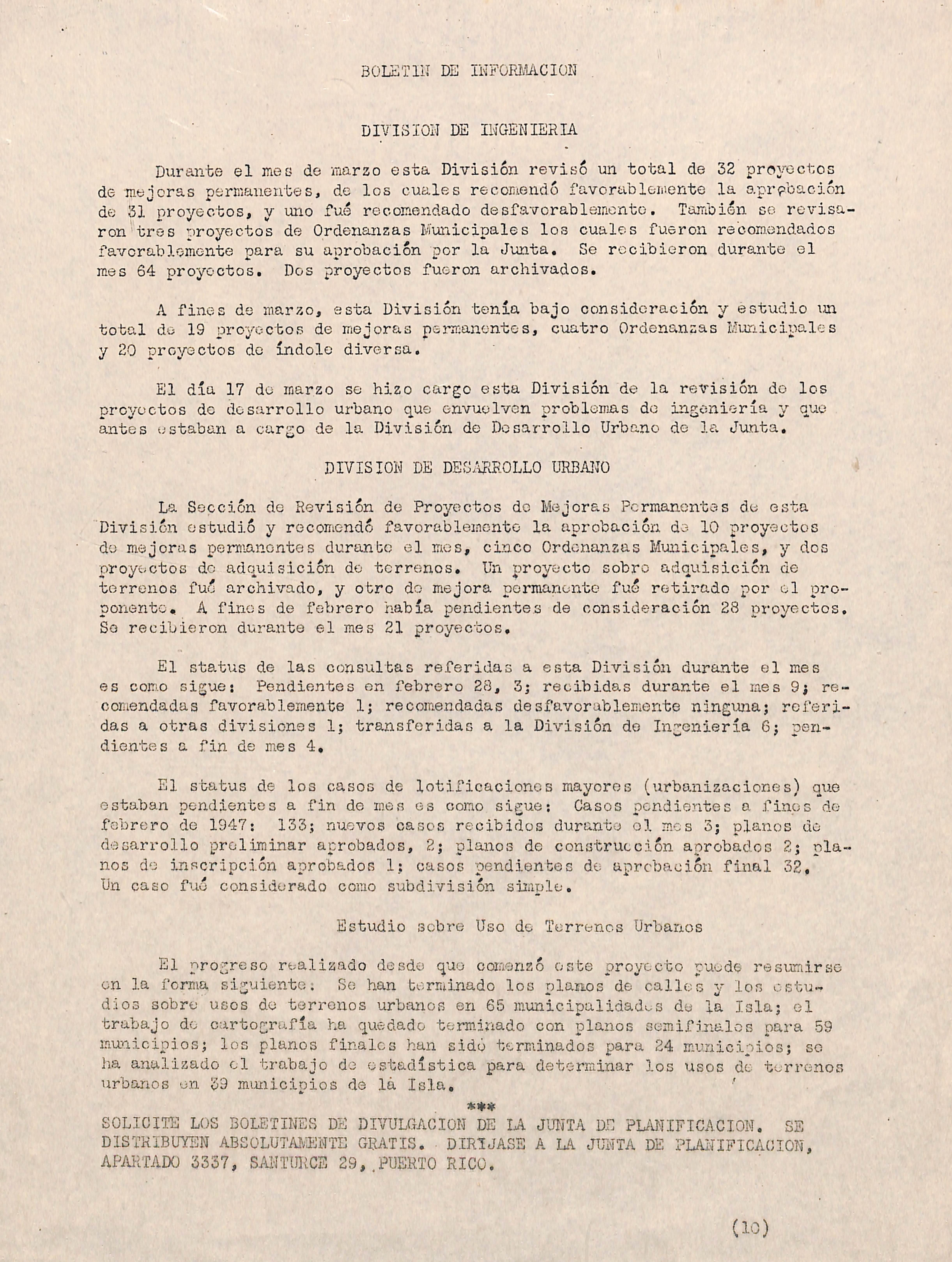 SOLICITE LOS BOLETINES DE DIVULGACION DE LA JUNTA DE PLANIFICACION. SE DISTRIBUYEN ABSÜLUTMENTE GIbiTIS. DIRIJASE A LA JUNTA DE PLANIFICACION, APAíTADÜ 3357, SAHTURCE 29, PUERTO RICO. (10)