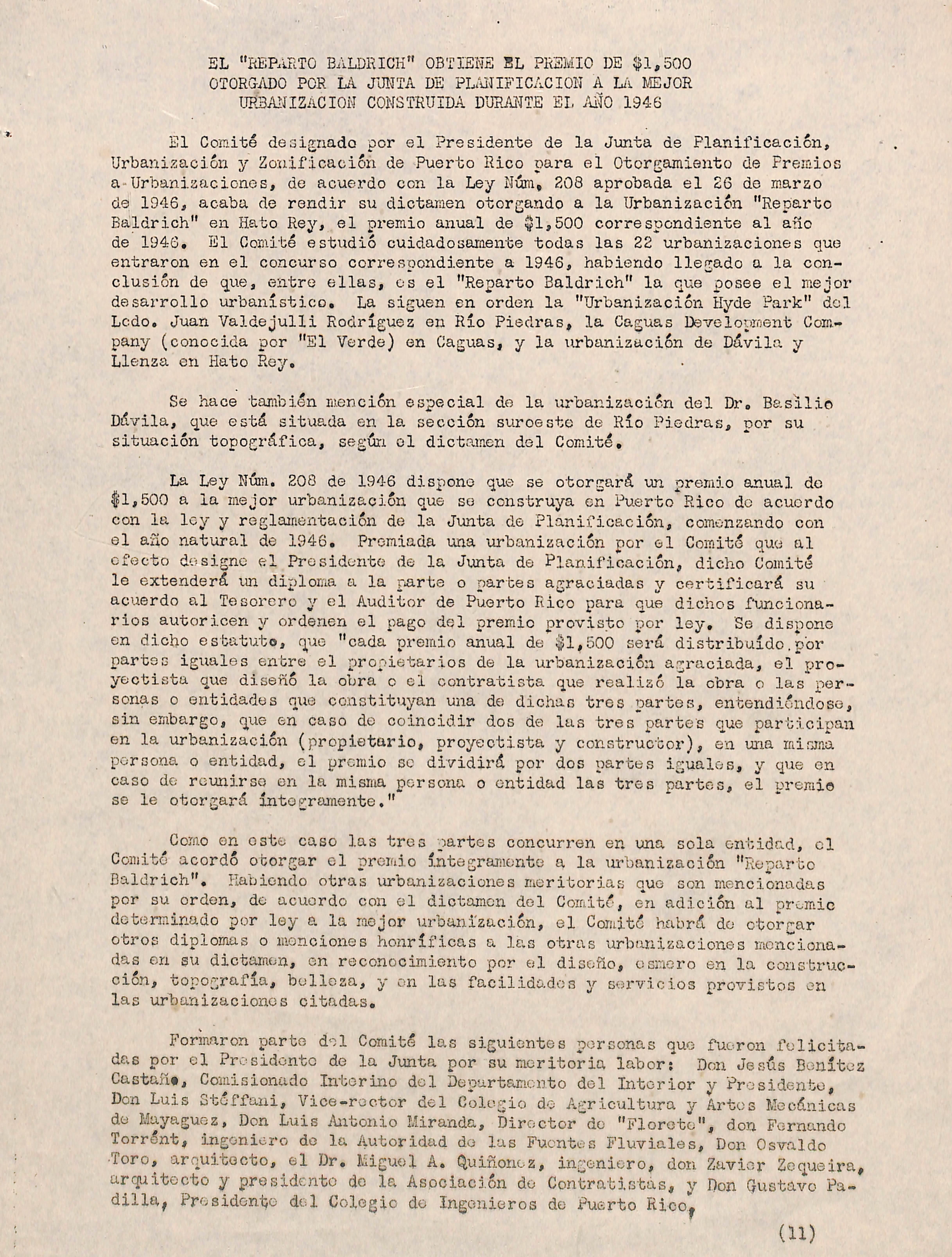 El Comité desimadQ oor el Presidente de la Junta de Planificación, Urbanización y Zonificación de Puerto Rico para el Otor^ainieuto de Premios a-Urbanizaciones, de acuerdo con la Ley Núm, 208 aprobada el 26 de marzo de 1946, acaba de rendir su dictamen otorgando a la Urbanización "Reparto Baldrich" en Hato Rey, el px-emio anual de $1,500 correspondiente al año de 1946. El Comité estudió cuidadosamente todas las 22 urbanizaciones que entraron en el concurso correspondiente a 1946, habiendo llegado a la con clusión de que, entro ellas, os el "Repai-to Baldrich" la que posee el mejor desarrollo urbanístico. La siguen en orden la "Urbanización Hyde Pai'k" del Ledo, Juan Valdejulli Rodríguez en Río Piedi'as, la Caguas Development Company (conocida por "El Verde) en Caguas, y la urbanización de Dávila y Lienza en Hato Rey,