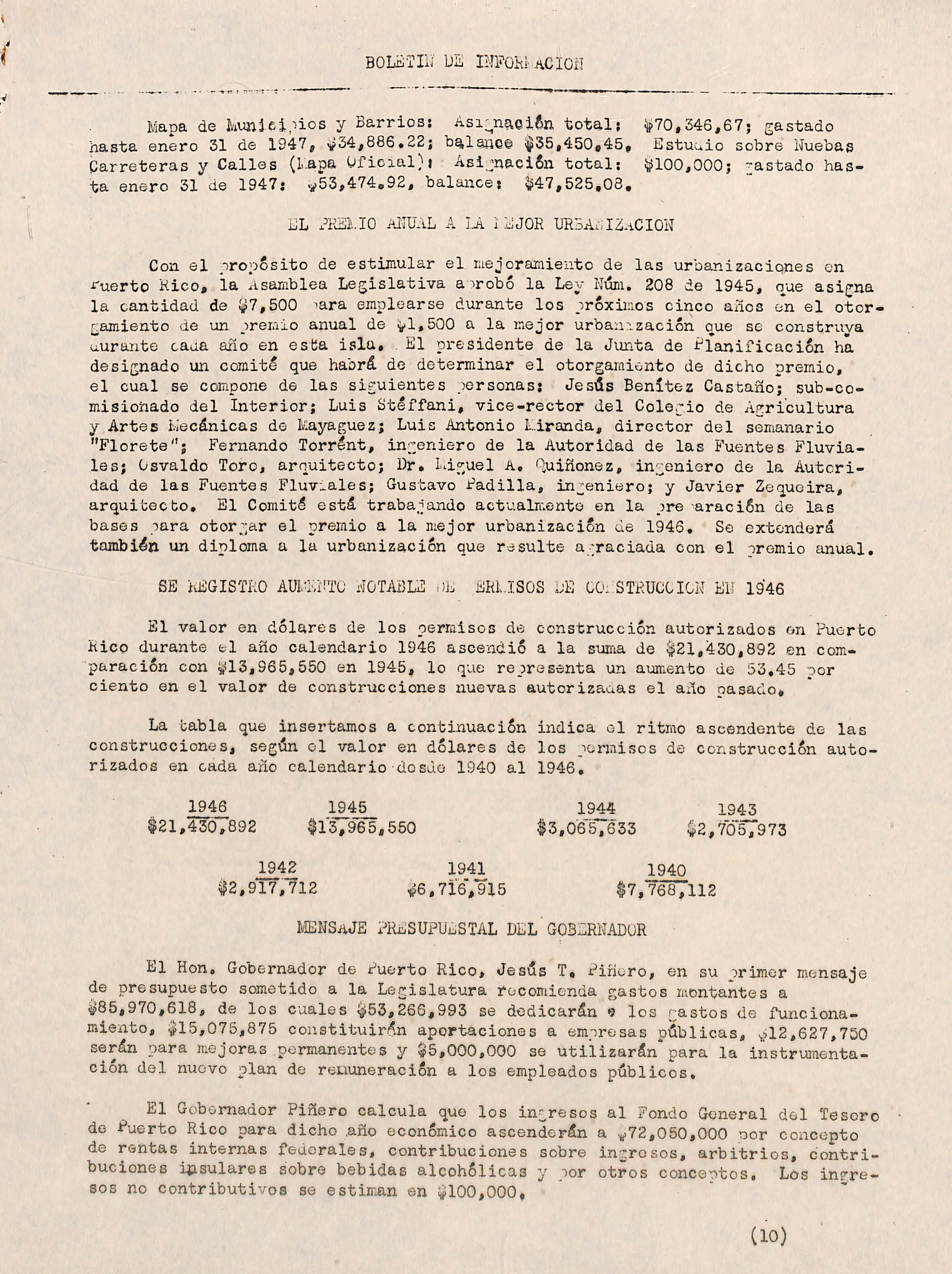 El Gobernador de Puerto Rico, Honorable Jesús T. Pinero, en su primer mensaje leído ante los miembros de la Asamblea Legislativa re\anidos en se sión conjunta, el ruartes 11 de febrero de 1947, pronunció las siguientes palabras al referirse a la labor de la Junta de Planificación, Urbaniza ción y Zonificaciónj