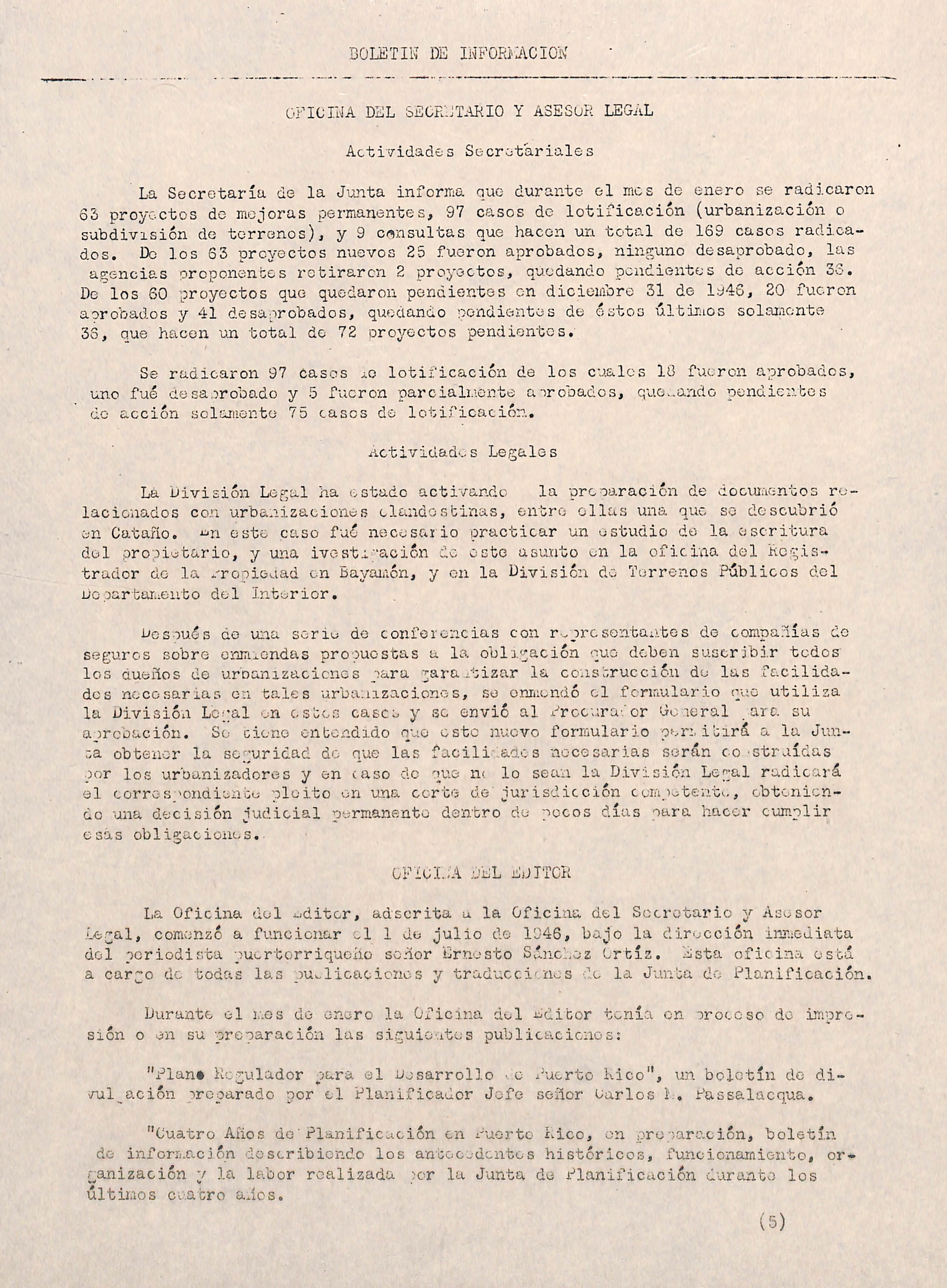 La Oficina del i^ditcr, adscrita u la Oficina del Secretario y Asesor Legal, comenzó a funcionar el 1 de julio de 1946, bajo la dirección inmediata del periodista puertorriqueño señor Ernesto Sánchez Ortíz. Esta oficina está a cargo de todas las publicaciones y traducci'.nes de la Junta de Planificación.