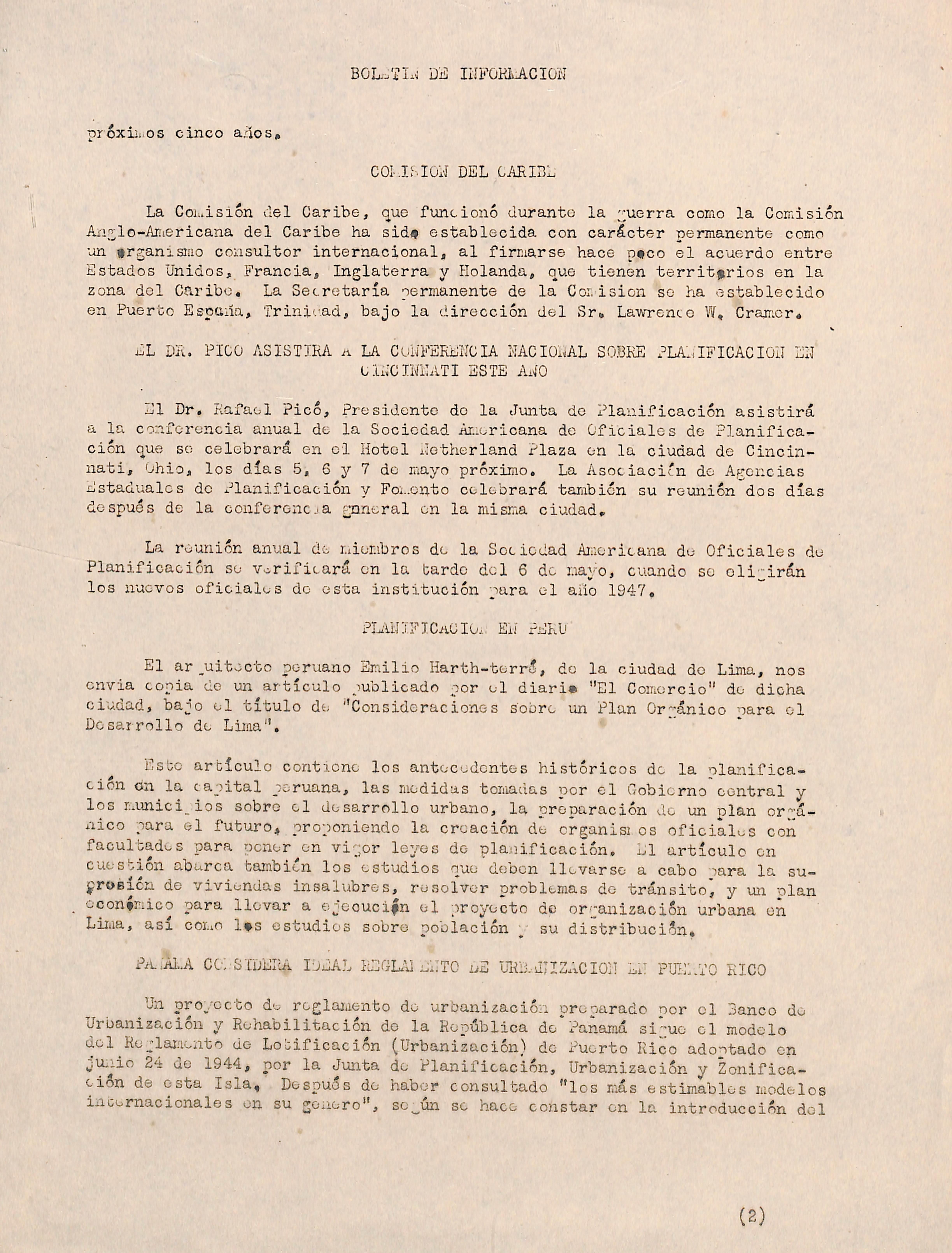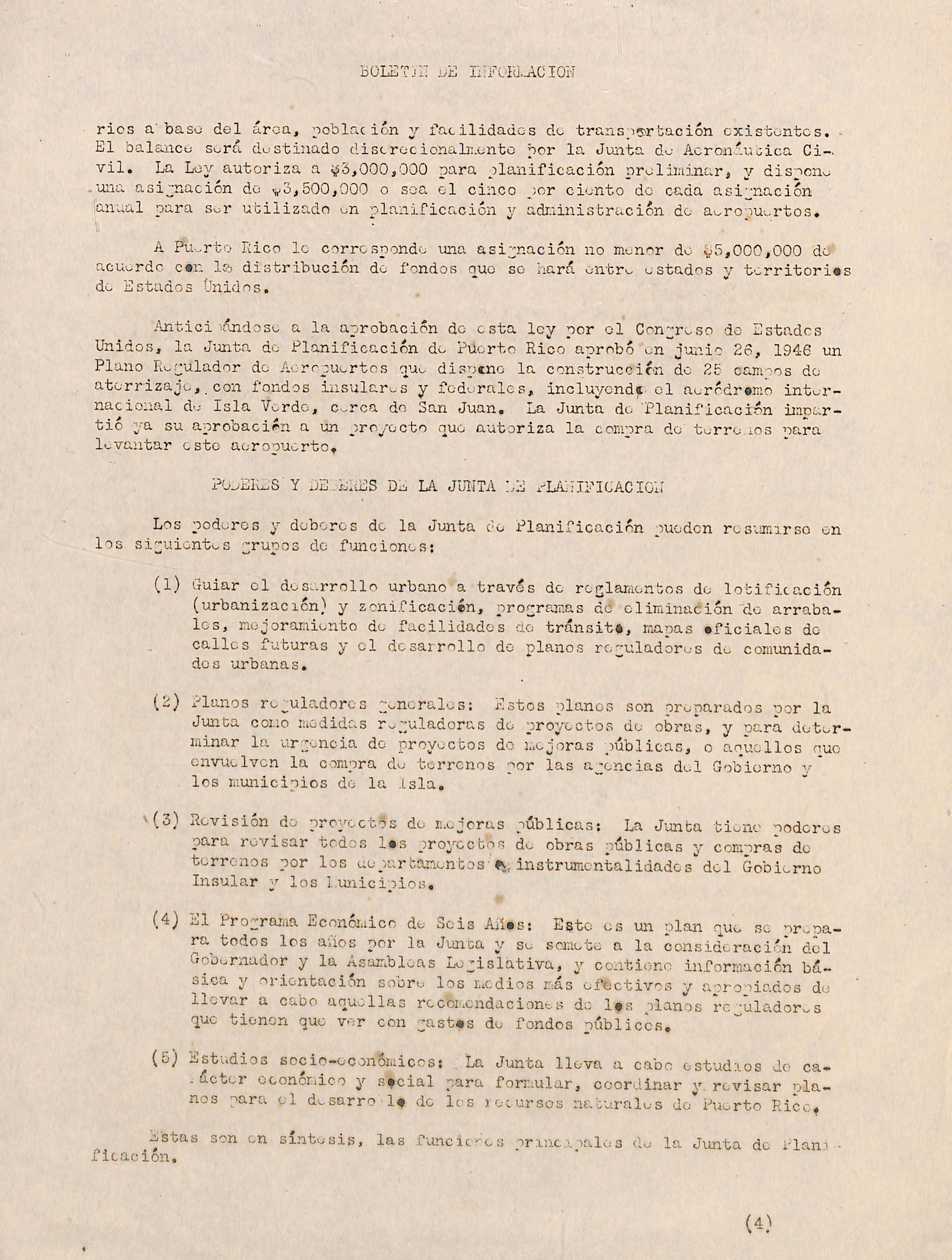 "La Zonificación en Puerto Pico", en preparación, otro boletín de in formación escrito por el consultor i'íilliara Ludlow, en ol cual so describen los propósitos, antecedentes históricos y disposiciones principales del Peglamento de Zonificación adoptado por la Junta, Esto folleto está ilustrado con dos mapas do San Juan. "El Cuarto Informe Anual de la Junta do Planifi cación" 1945-1946 está en procoso de impresión,
