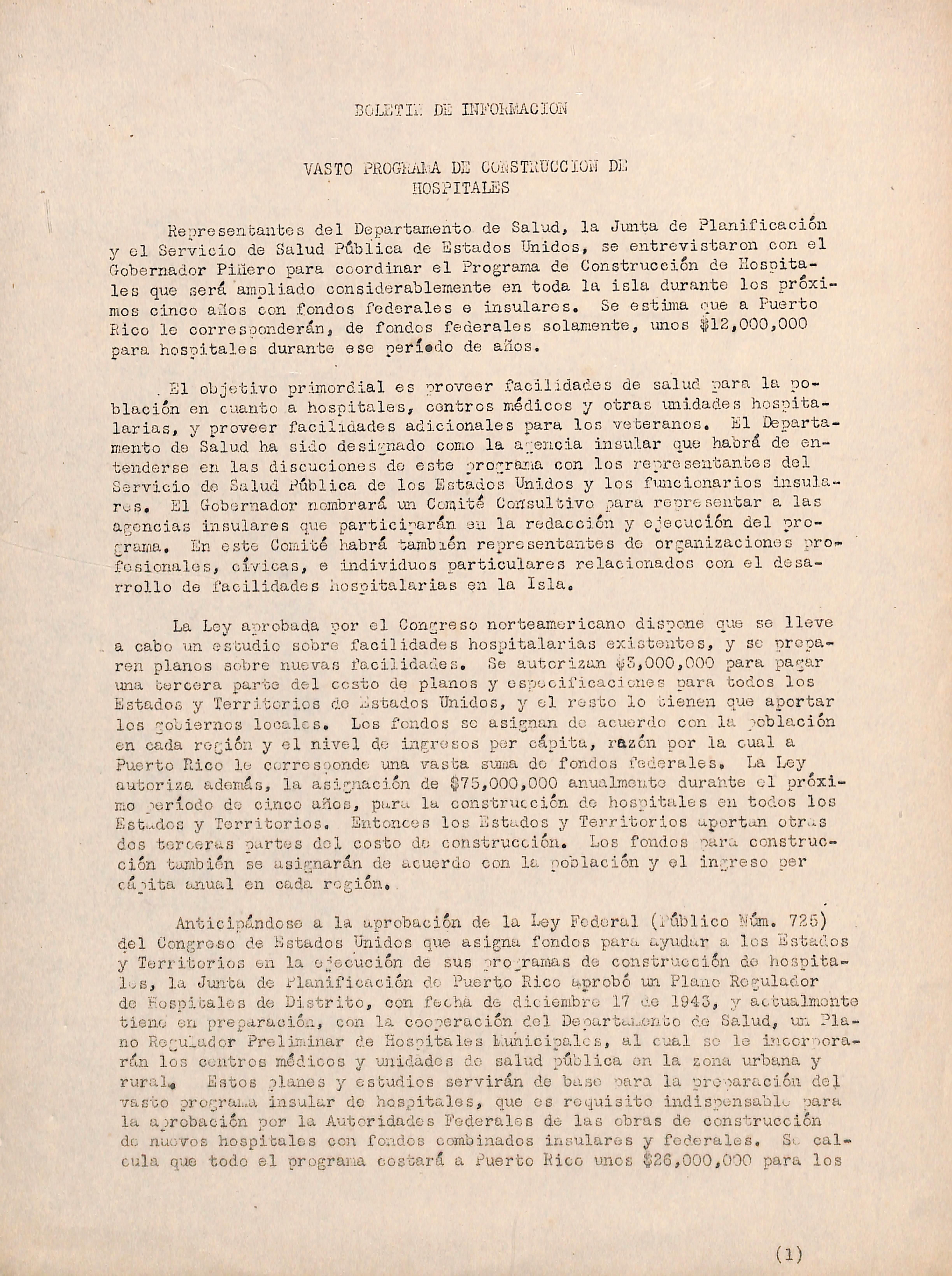 So inició un análisis do costos do construcción del programa de hospibáles municipales para dotorrainar la convoniencia de auiiiontar la capacidad mí nima do los nuevos hospitales.a 16 en vez de 10 camas cada uno. Esto estudio abarcará los gastos de funcionamiento. También se ha hecho un estudio para que este programa esté basado en-estimados de población cara 1960, en lugar do las cifras de población del censo no 1940,