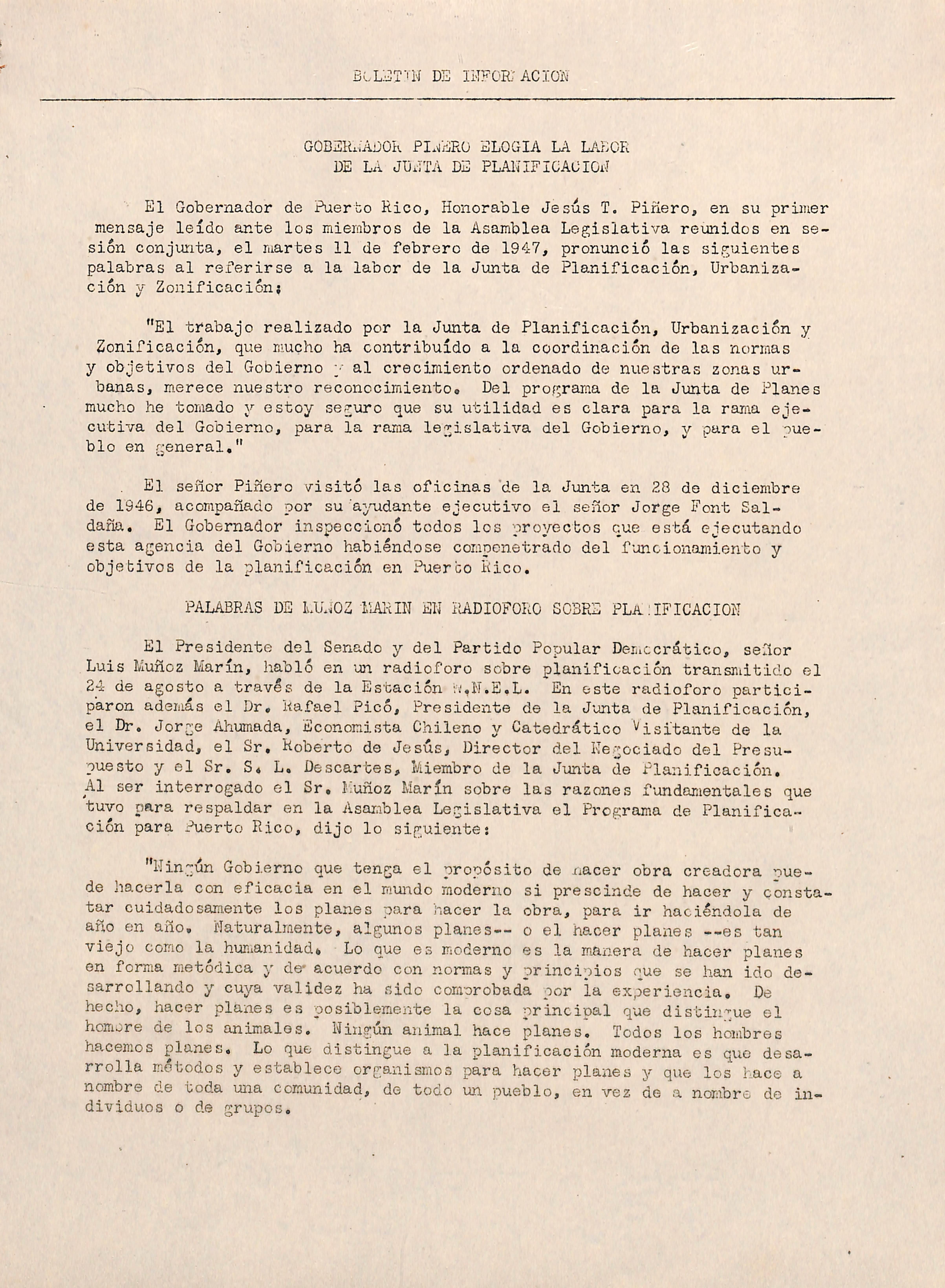El Presidente del Senado y del Partido Popular Deruccrático, señor Luis Muñoz Marín, habló en un radioforo sobre planificación transmitido el 2_4 de agosto a través de la Estación ií.lT.E.L. En este radioforo partici paron además el Dr. Rafael Picó, Presidente de la Junta de Planificación, el Dr. Jorge Ahumada, Economista Chileno y Catedrático Visitante de la Universidad, el Sr. Roberto de Jesús, Director del Kegociado del Presu puesto y el Sr. S« L. Descartes, Miembro de la Junta de Planificación. Al ser interrogado el Sr, Muñoz Marín sobre las razones fundamentales que tuvo para respaldar en la Asaiablea Legislativa el Programa de Planifica ción para Puerto Rico, dijo lo siguientes