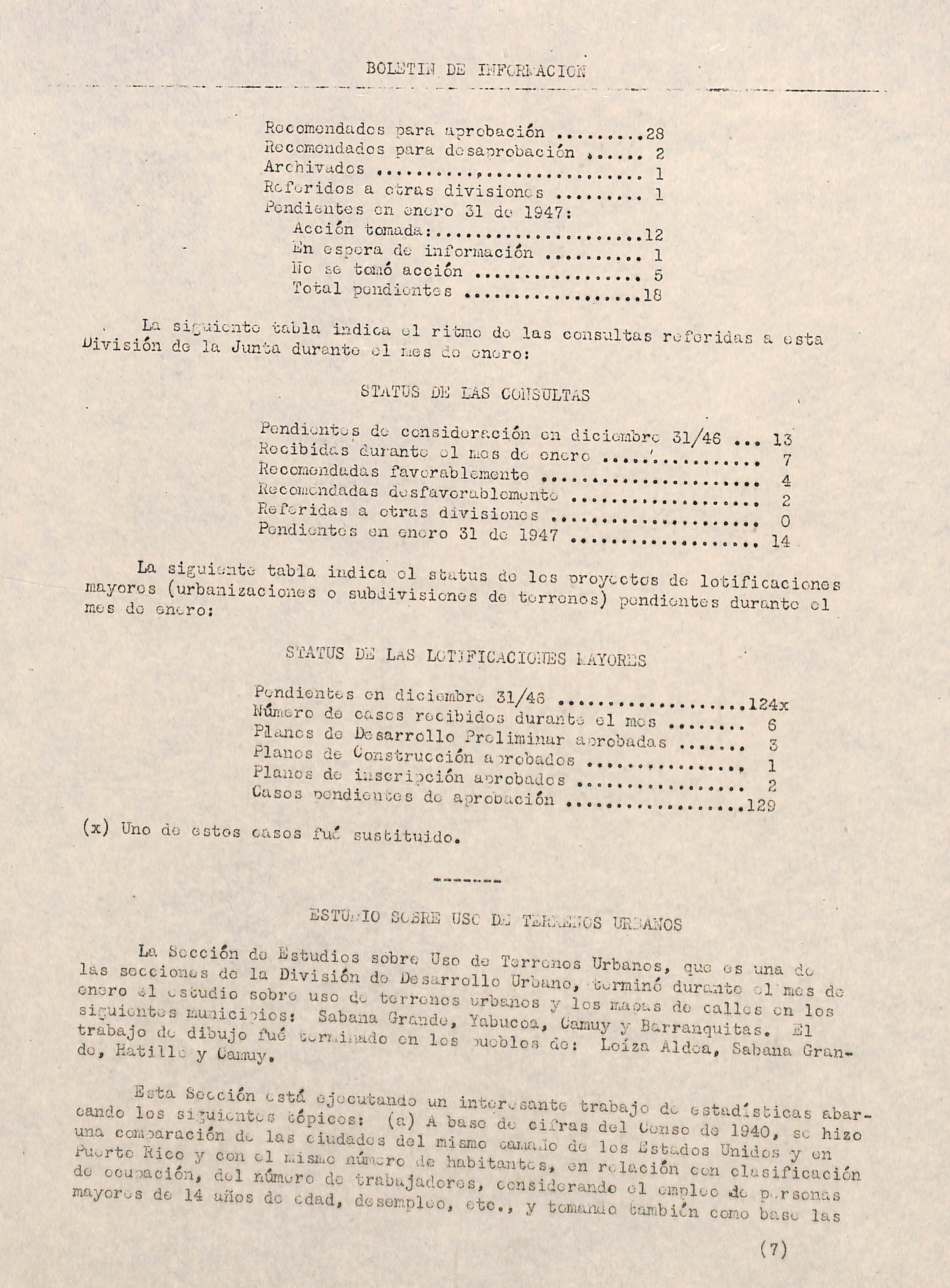 Durante el mes do enero la Sección do Estudio sobre Uso do Terrenos Ur banos coop-ró con la Sección do Zonificación en los estudios enumerados ante riormente,