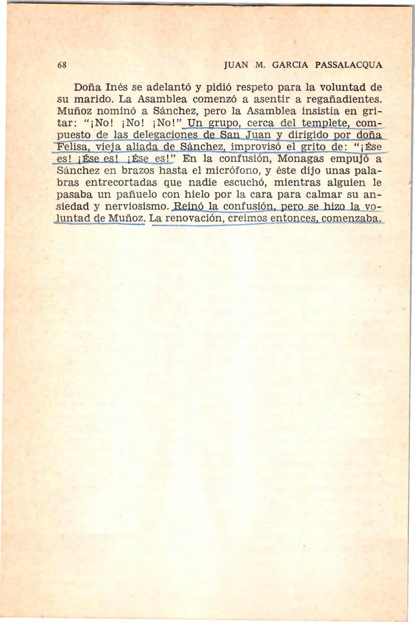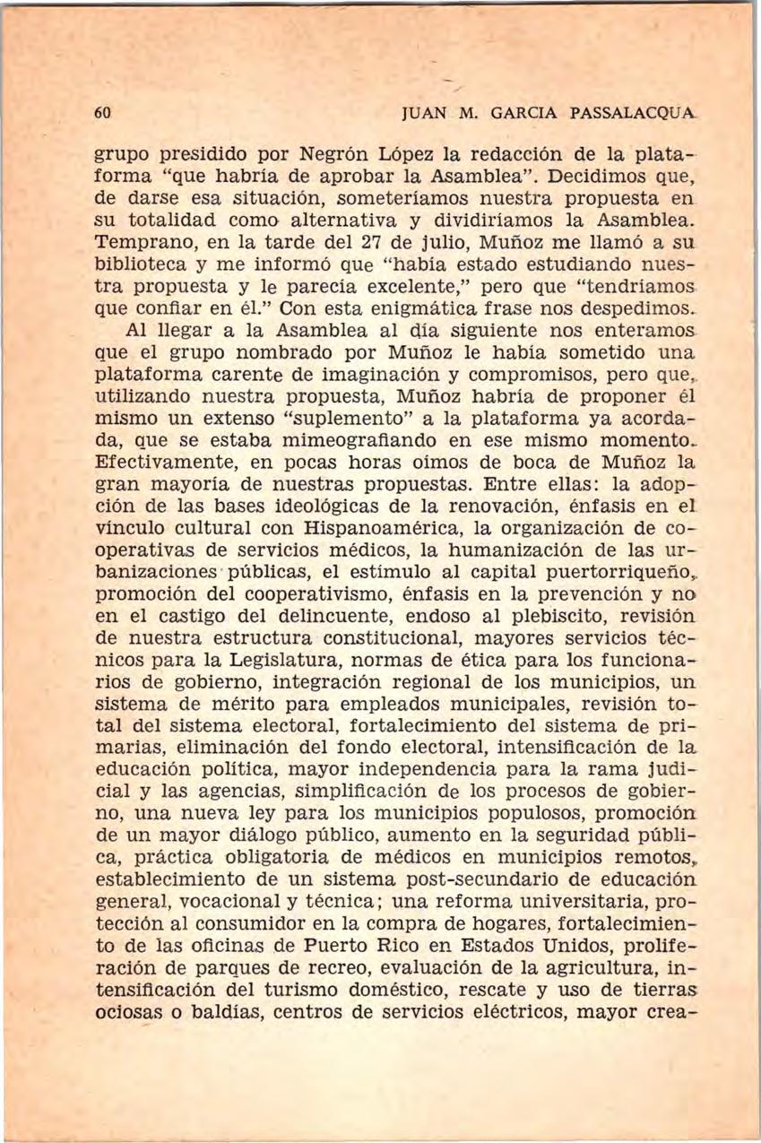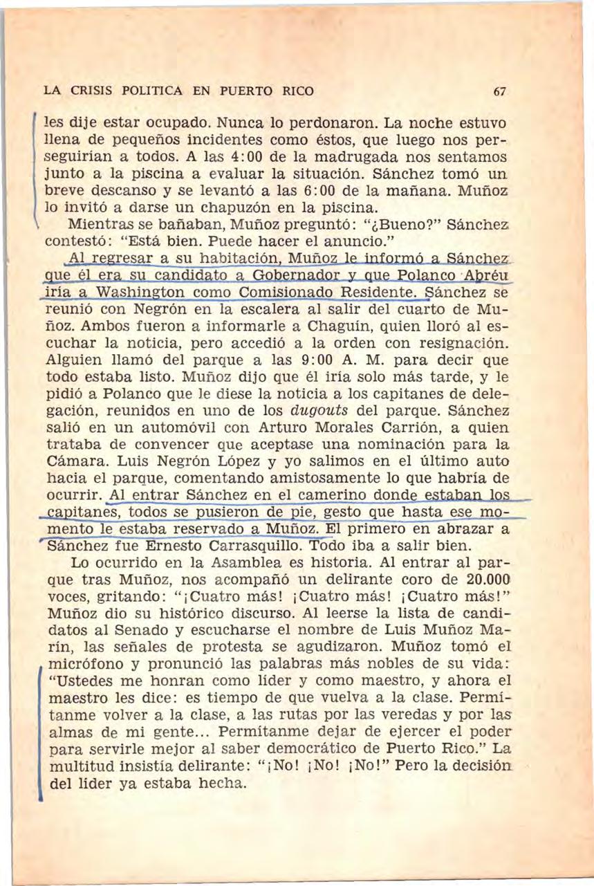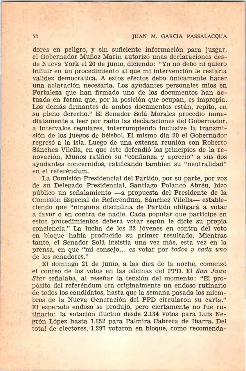 por la nominacion. Le entregue por escrito una propuesta de como debia organizarse la estructura para iniciar nuestra campafi.a de nominaciones. Insisti en ofrecerle una alternativa ideologica radical al pueblo de Puerto Rico. El Gobernado r dij o no. Por el cont r ario, dicto las siguientes declaraciones: " E l Sena dor Negron Lopez es un hombre de grandes meritos, a quie n me unen l a zos d e afec t o personal y estrechas relacio nes gubernamen t ale s y politicas. Somos compafi. eros de luch a d es de hace ve inticinco afi.os y ambos nos enorgullecemos d e nuest ra mutua amist a d. Es precisamente por razon de esa a. m is ta d qu e es t oy se guro que, si en algun momento el Senador Ne g ron Lope z creyese conveniente que el Partido Popular Democratico postulase para Gobernador en 1968 a otra persona qu e el actual incumbente, yo seria el primero en saberlo de sus propios labios , El Senador Negron Lopez no me ha comunicado que tenga ese convencimiento". Y dirigiendose a quienes ha bian comenzado a promover al Senador Negron Lopez para l a gobernacion, les dijo: "Esas personas tendran amplia opor t unidad, en su dia, de participa.r en el proceso democratico d e nominacion de candidatos del Partido Popular Democratico. En su dia los organismos pertinentes del Partido Popular Democratico pasaran juicio y haran su decision. Esa der.ision estara basada, estoy seguro, en la obra que cada uno de los candidatos a cada uno de cargos electivos haya realizado en pro de Puerto Rico. El momenta actual es para hacer esa obra, para llevar a cabo el programa para el cual recibimos el mandato del pueblo hace poco mas de un afi.o".