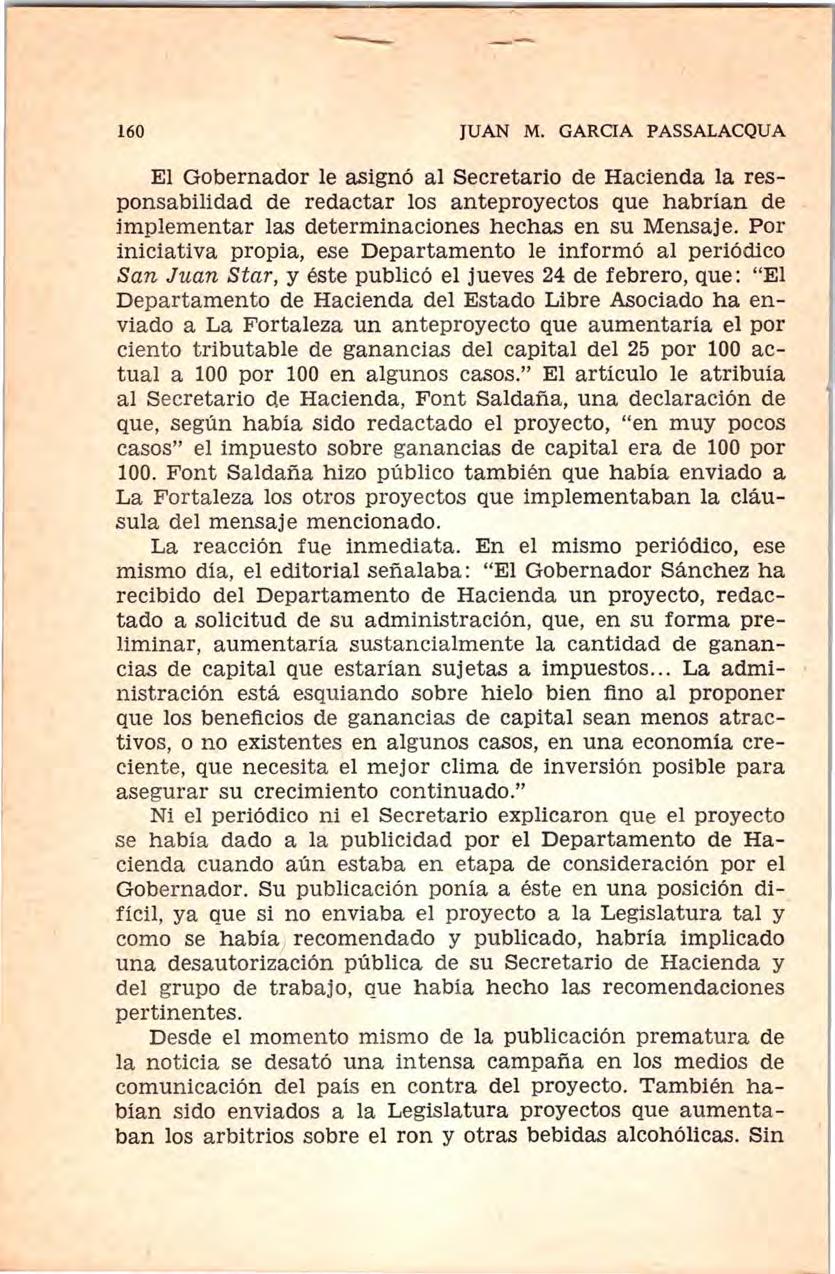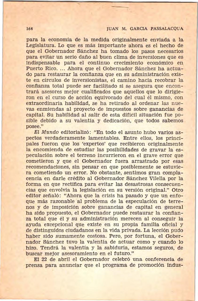 para la economia de la medida originalmente enviada a la Legislatura. Lo que es mas importante ahora es el hecho de que el Gobernador Sanchez ha tornado los pasos necesarios. para evitar un serio dafio al buen clima de inversiones que es. indispensable para el continua crecimiento econ6mico en Puerto Rico . . .. Ahora que el Gobernador Sanchez ha ac t uado para restaurar la conflanza que en su administraci6n existe en circulos de inversionistas, el camino hacia recobrar la conflanza total pu e de ser facilitado si se asegura que enco ntrara asesores mejor cualiflcados que aquellos que lo dirigieron en el curso de acci6n equivocado del cual el mismo , con extraordinaria habilidad, se ha retirado al ordenar l as nu evas enmiendas al proyecto de impuestos sabre ganancias de capital. Su habilidad al salir de esta dificil situaci6n fue p osible debido a su valentia y dedicaci6n, que todos sabemos posee."