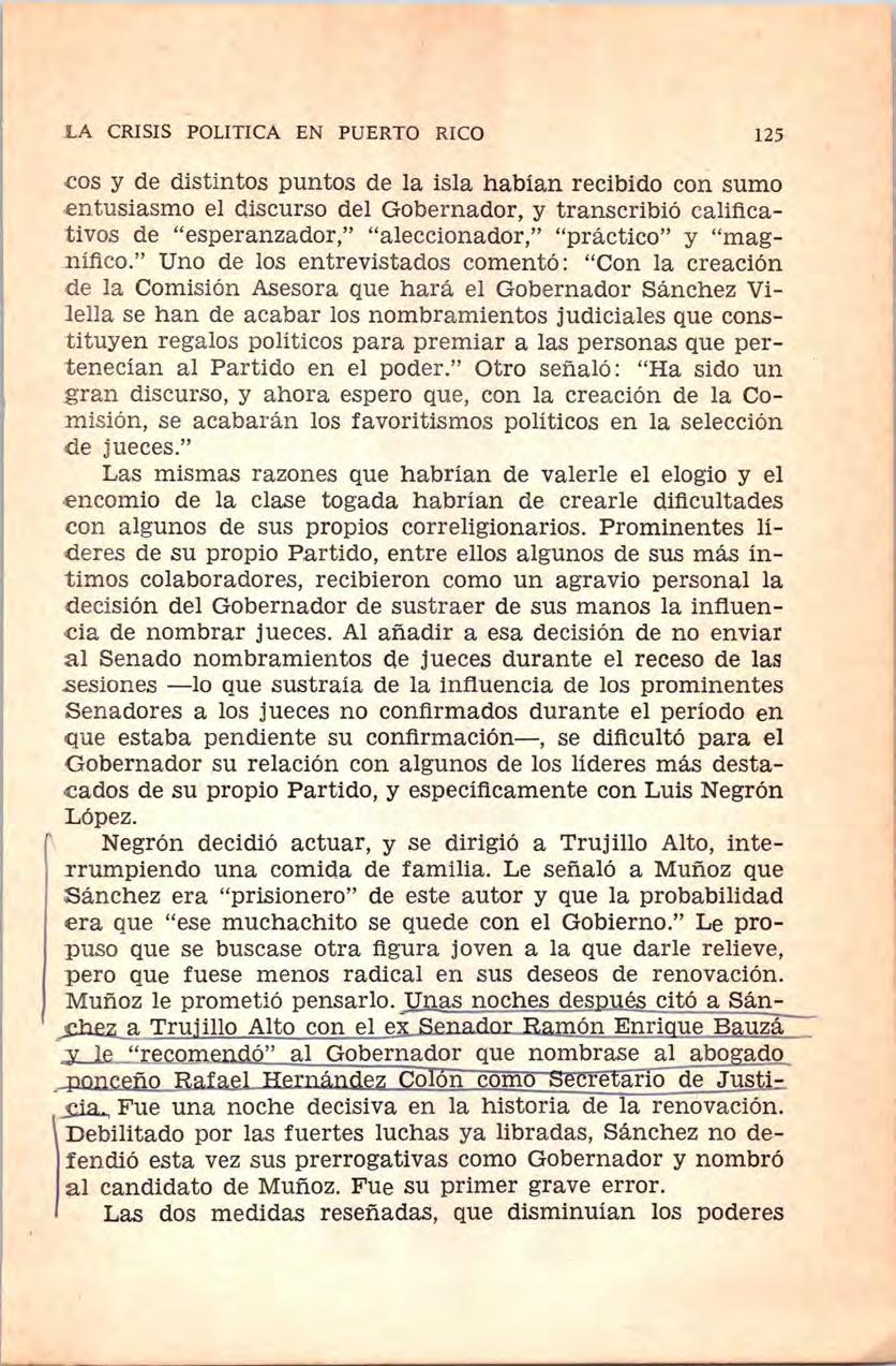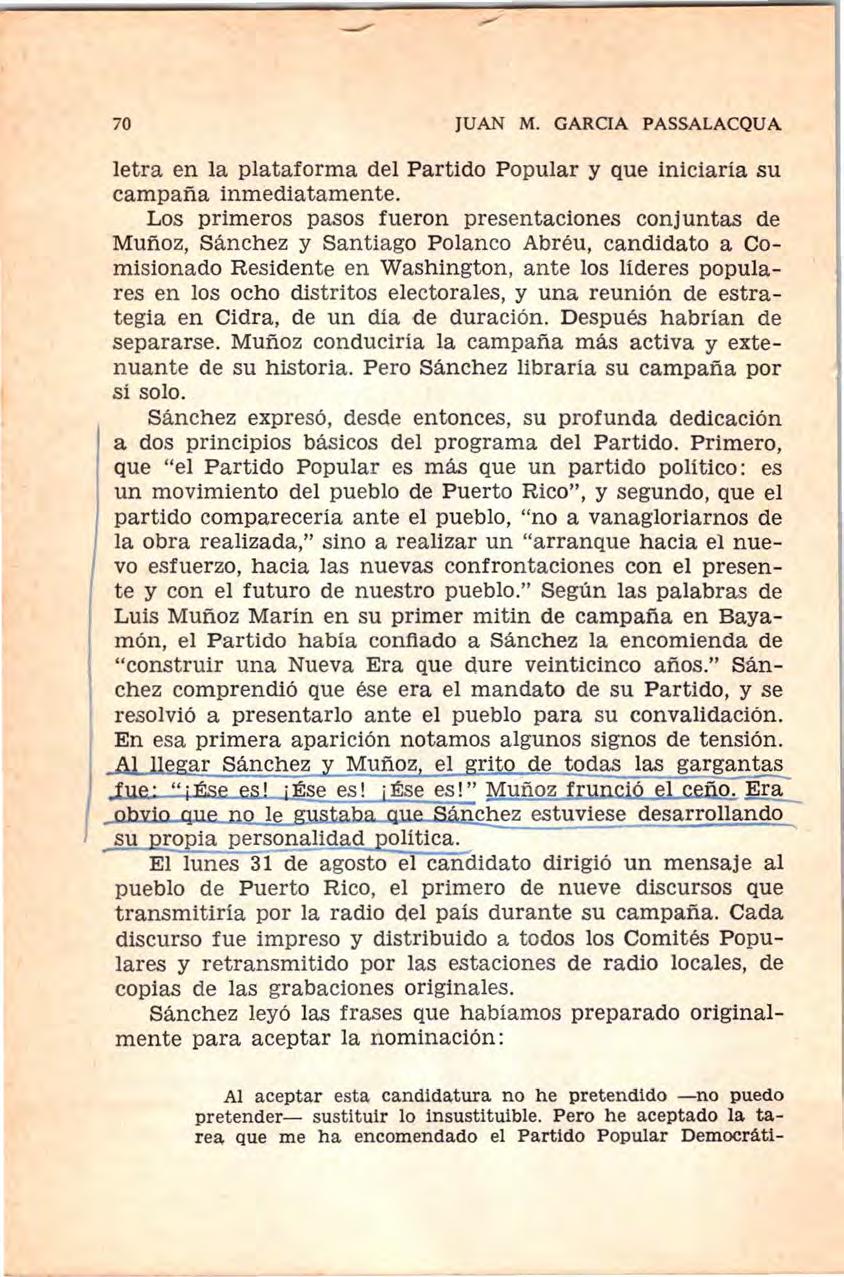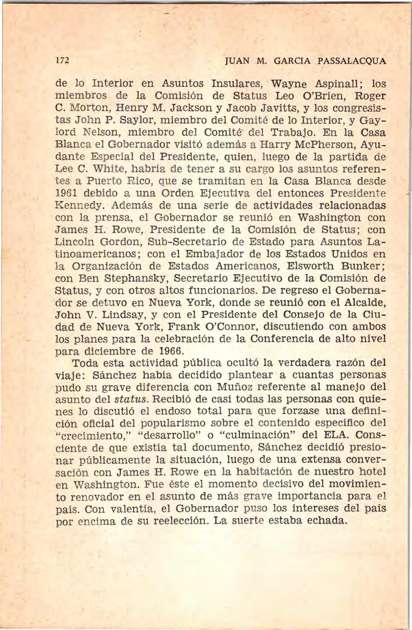 Toda esta actividad publica ocult6 la verdadera raz6n del viaje: Sanchez habia decidido plan tear a cuantas personas pudo su grave diferencia con Mufi.oz referente al manejo del asunto del status Recibi6 de casi todas las personas con quienes lo discuti6 el endoso total para que forzase una deflnici6n oflcial del popularismo sobre el contenido especiflco del "crecimiento," "desarrollo" o "culminaci6n" del ELA. Consciente de que existia tal documento, Sanchez decidi6 presionar publicamente la situaci6n, luego de una extensa conversaci6n con James H. Rowe en la habi taci6n de nuestro hotel en Washington. Fue este el momento decisiv o del movimien to ren ovado r en el asunto de mas grave importancia para el pais. Con valentia , el Gobernador puso los intereses del pais por encima de su reelecci6n. La suerte estaba echada.