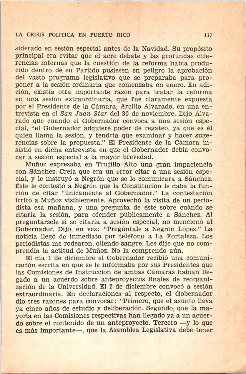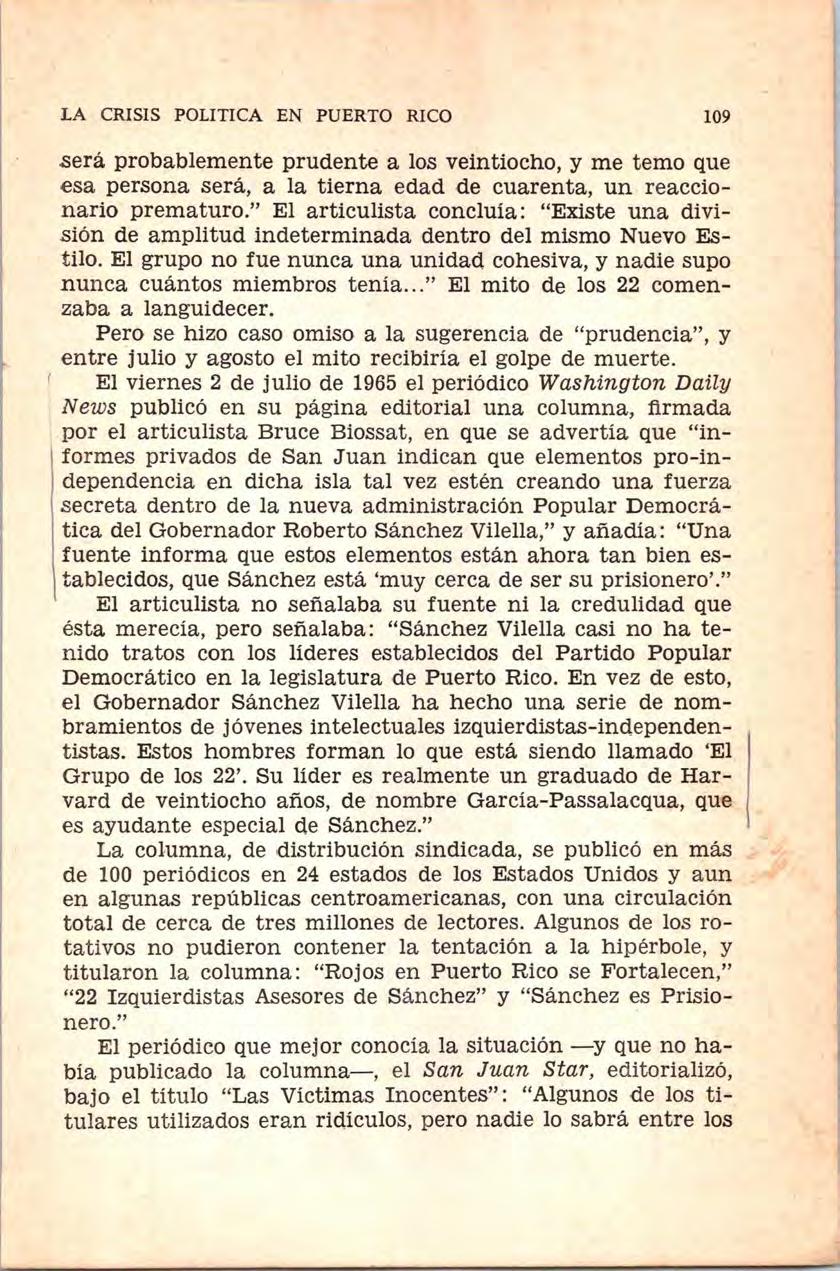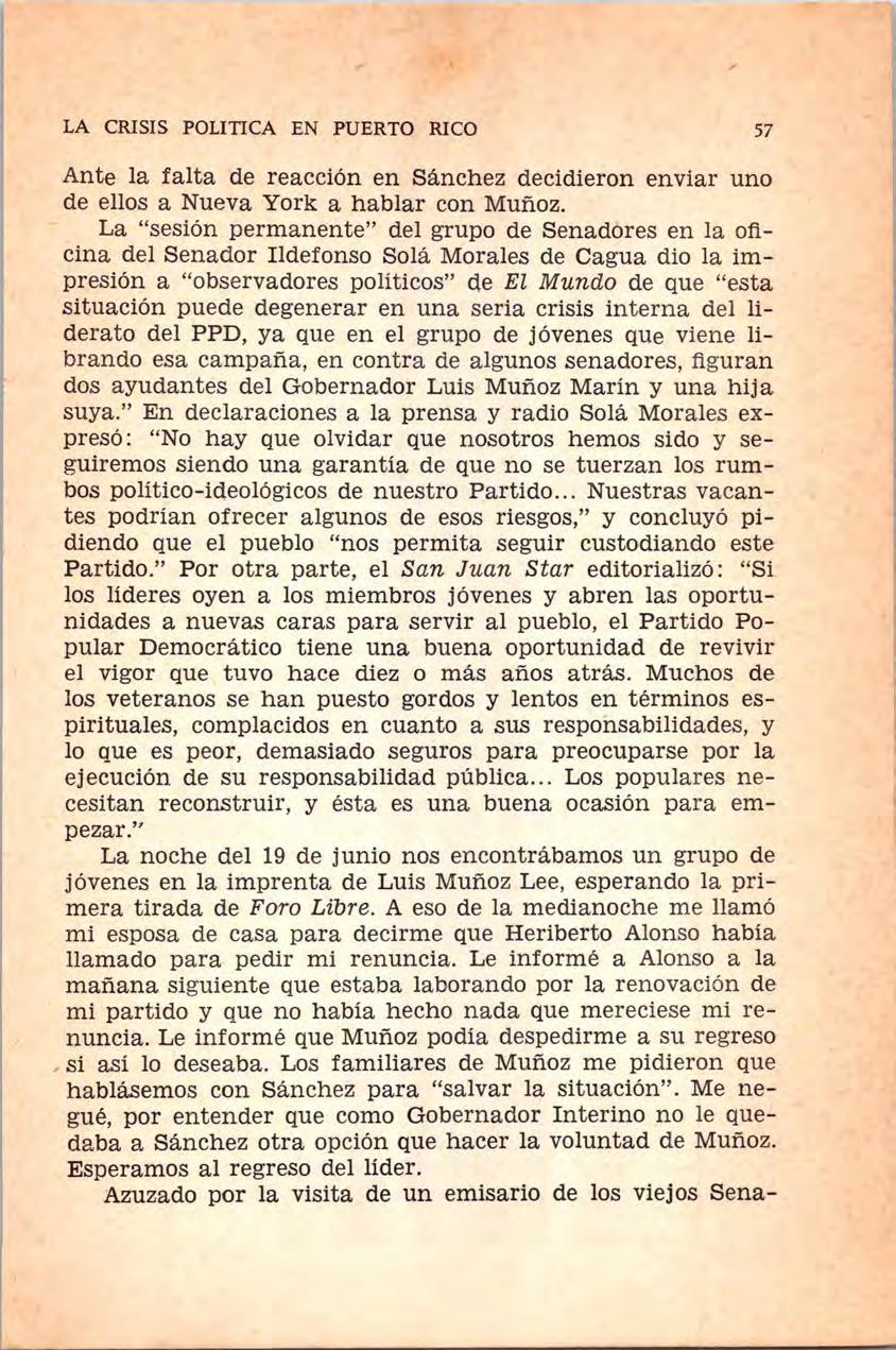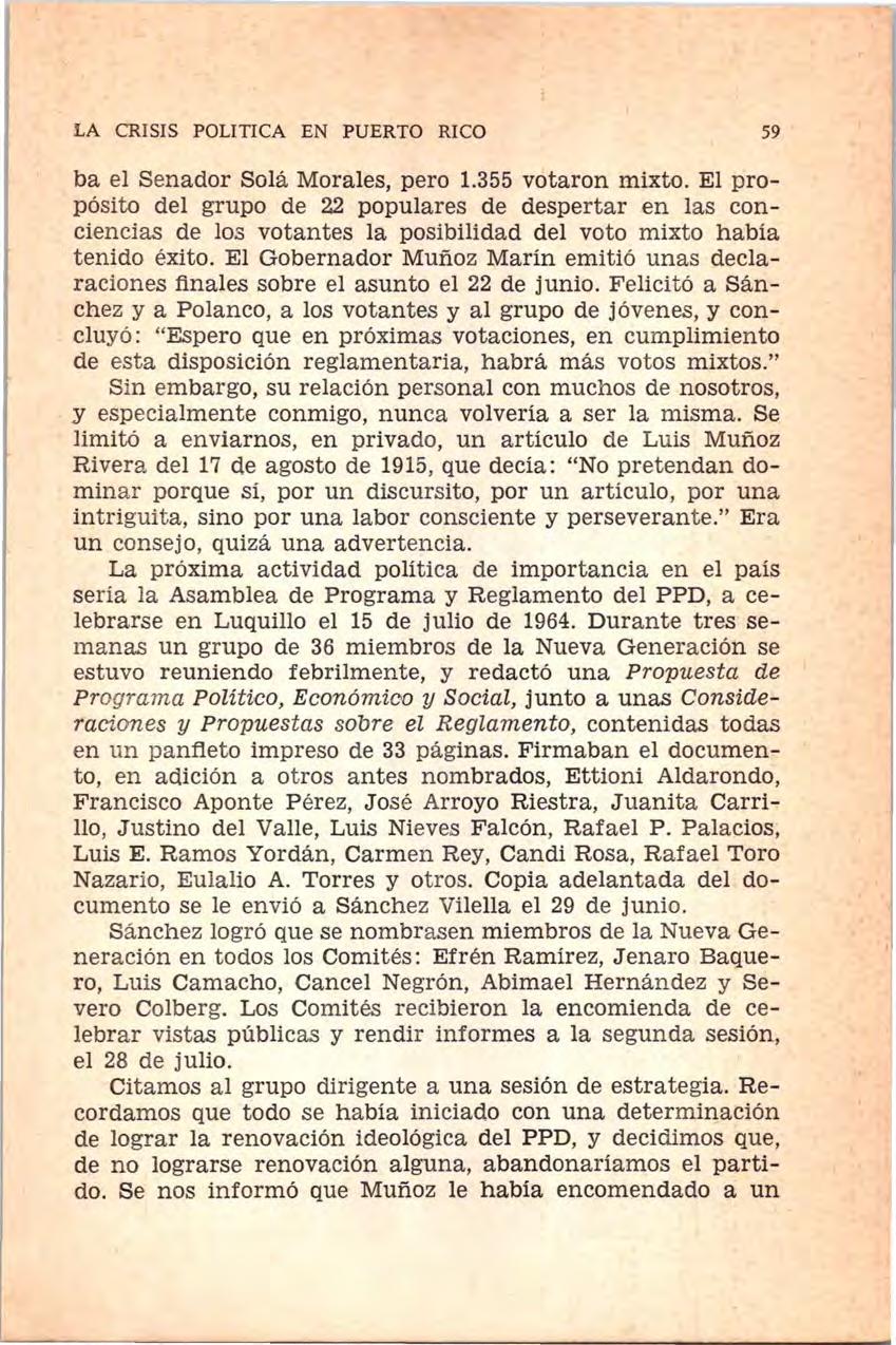 Toda esta actividad publica ocult6 la verdadera raz6n del viaje: Sanchez habia decidido plan tear a cuantas personas pudo su grave diferencia con Mufi.oz referente al manejo del asunto del status Recibi6 de casi todas las personas con quienes lo discuti6 el endoso total para que forzase una deflnici6n oflcial del popularismo sobre el contenido especiflco del "crecimiento," "desarrollo" o "culminaci6n" del ELA. Consciente de que existia tal documento, Sanchez decidi6 presionar publicamente la situaci6n, luego de una extensa conversaci6n con James H. Rowe en la habi taci6n de nuestro hotel en Washington. Fue este el momento decisiv o del movimien to ren ovado r en el asunto de mas grave importancia para el pais. Con valentia , el Gobernador puso los intereses del pais por encima de su reelecci6n. La suerte estaba echada.