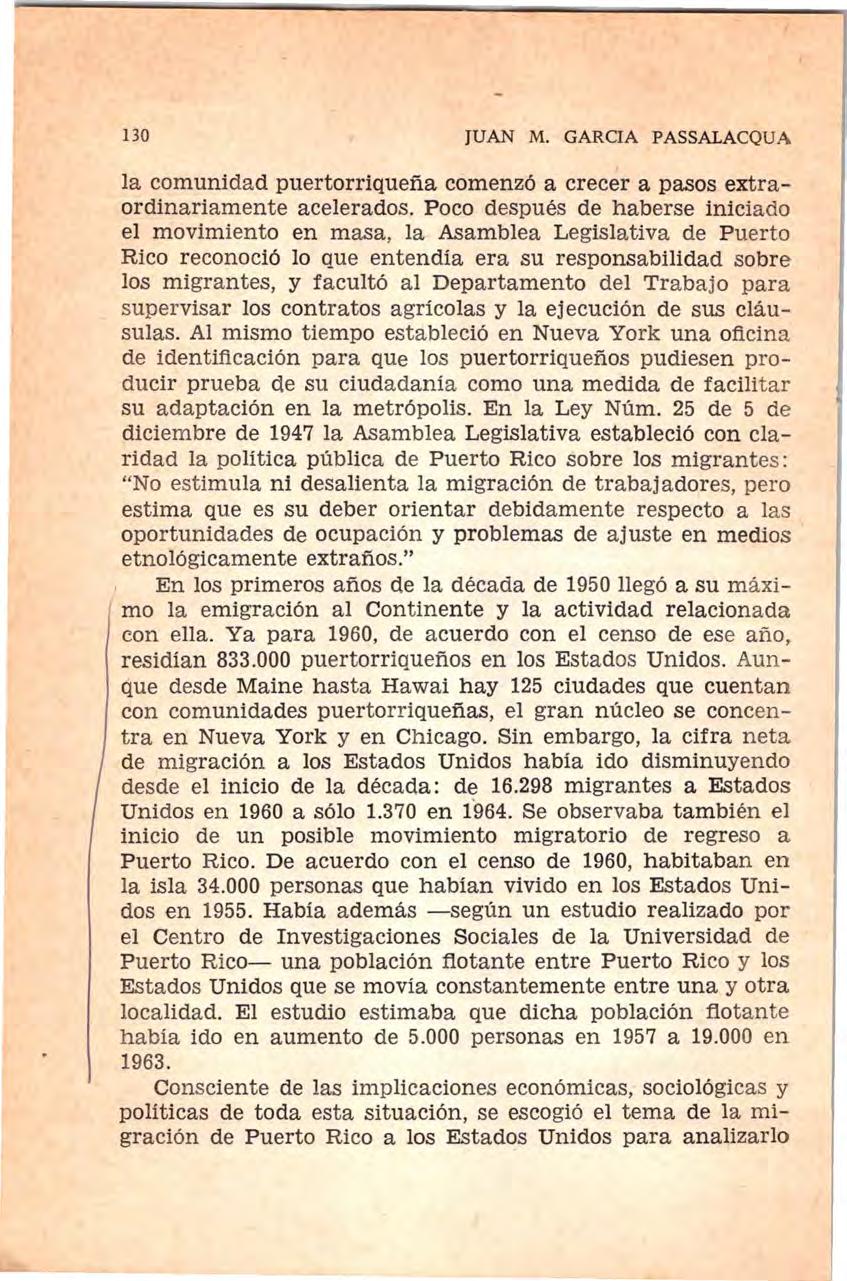 Juan Manuel Garcfa Passalacqua es, a los treinta y tres afios, uno de los principales pensadores puertorriquefios. Estudiante de la s esc u elas publicas d e Pu er to Rico, lo gr6 en 1962 un Doctorado en Jurisprud encia de la Universidad de Harvard, e n los Estados Unidos. Sirvi 6 luego como A y udante de los Gob erna dores Lui s Mufioz Marin y Roberto Sa nchez Vile ll a, y en el Comite de Transici 6 n a la go bernaci 6 n de Luis A F e rre Es actualmente Vice-Presidente y A sesor Le ga l d e una fundaci 6 n educativa e n la isla, a d e mas d e Pre s idente de una corporaci6n s in fines lucrativo s que produce program as d e television: Ancilisis, In c . Entre s u s escritos figuran una columna semanal en el idioma ingles, en el San ]u ain Star, y un libro publicado en 1963, Apuntes para la Historia de America Latina. Esta casado con Ivonne A costa Lespier y tiene tres hijos.