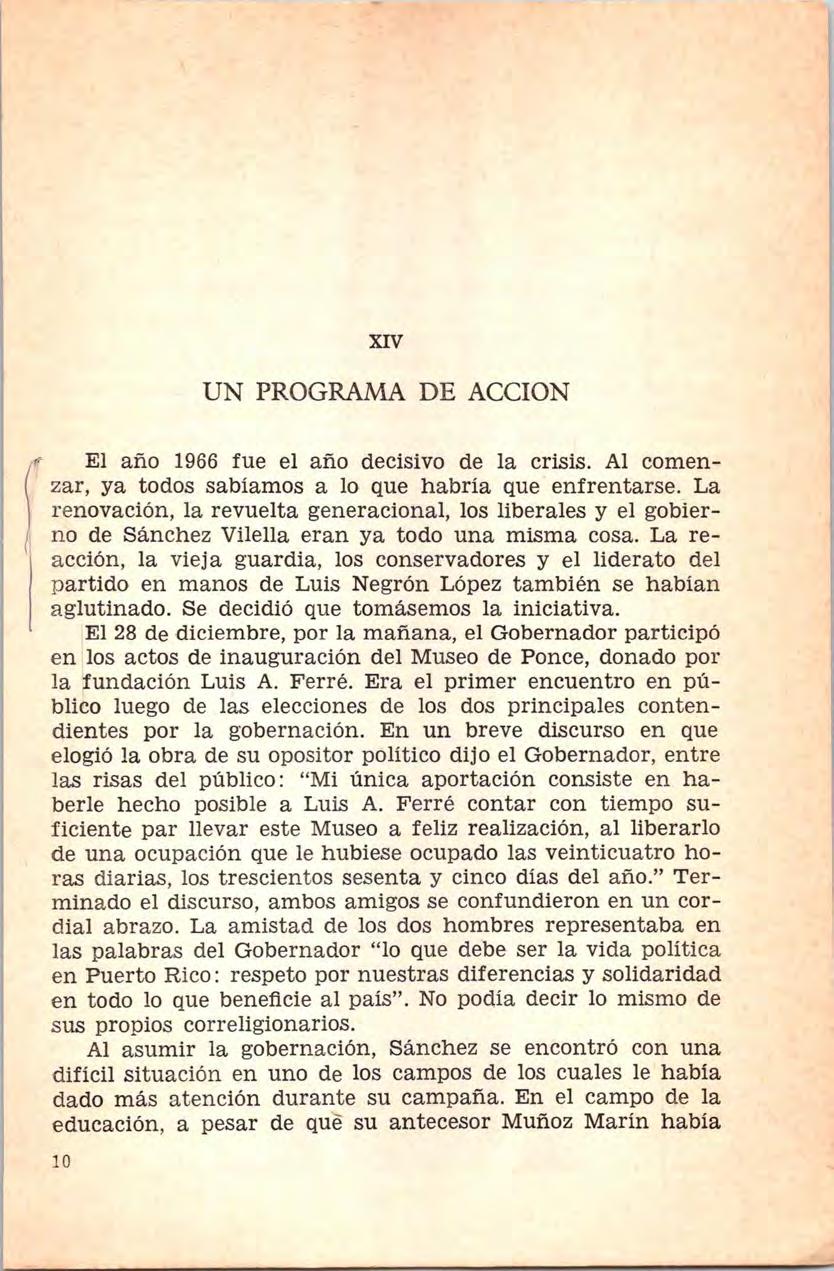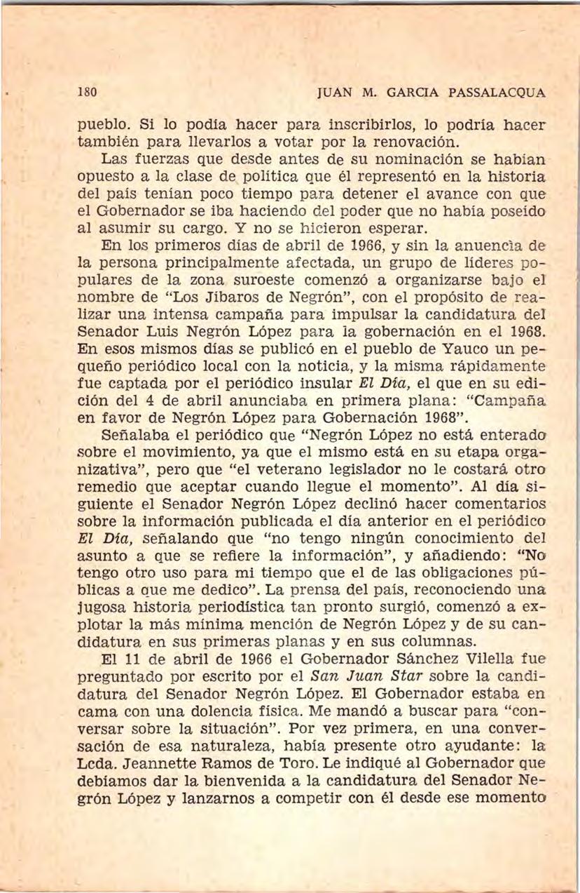 El 11 de abril de 1966 el Gobernador Sanchez Vilella fue preguntado par escrito por el San Juan Star sobre la candidatura del Senador Negron Lopez. El Gobernador estaba en cama con una dolencia fisica. Me mando a buscar para "conversar sabre la situacion". Par vez primera, en una conversacion de esa naturaleza, habia presente otro ayudante: la Leda. Jeannette Ramos de Toro. Le inclique al Gobernador que debiamos dar la bienvenida a la canclidatura del Senador Negron Lopez y lanzarnos a competir con el desde ese momento