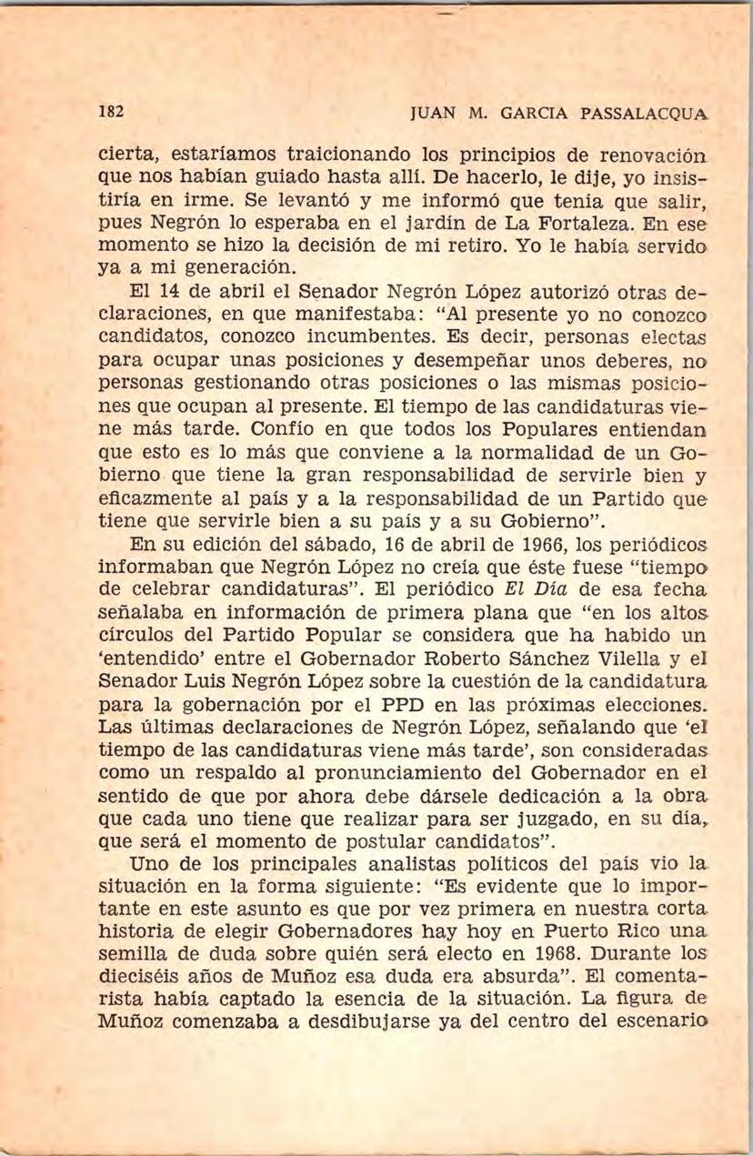 cierta, estariamos traicionando los principios de renovac i on que nos habian guiado hasta alli. De hacerlo, le dije, yo insistiria en irme. Se levanto y me informo que tenia que salir, pues Negron lo esperaba en el jardin de La Fortaleza. En ese momento se hizo la decision de mi retiro. Yo le habi a servido ya a mi generacion.