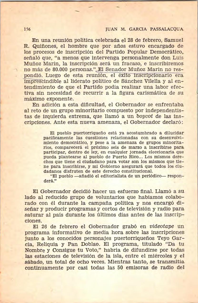Remos resefiado en paginas anteriores c6mo el Gobernador se dedic6 al arduo proceso de granjearse el liderato politico en el pais, despues de haber sido electo para la primera magistratura, siempre frente a la pesada e inevitable comparaci6n con la figura carismatica de su predecesor y a la competencia presentada desde el primer momenta por la vieja guardia del partido. Ese proceso tendria su maxima expresi6n de exito en la campafia de inscripciones en marzo de 1966. En ausencia de Mufi.oz, el nuevo Gobernador -por su esfuerzo propio y unicamente con la ayuda de los j6venes renovadores-- logr6 la mas grande inscripci6n de electores en la historia del pais. Roberto Sanchez Vilella habia movilizado a su