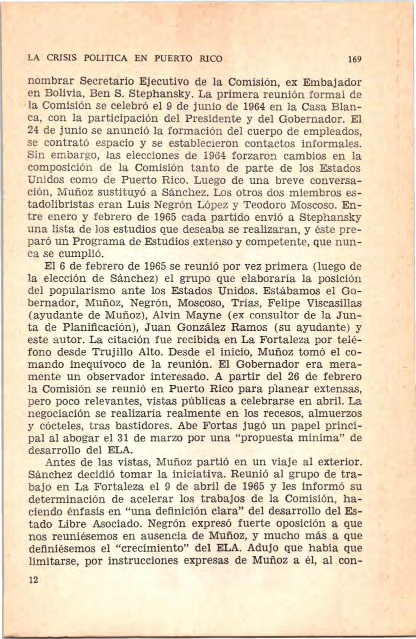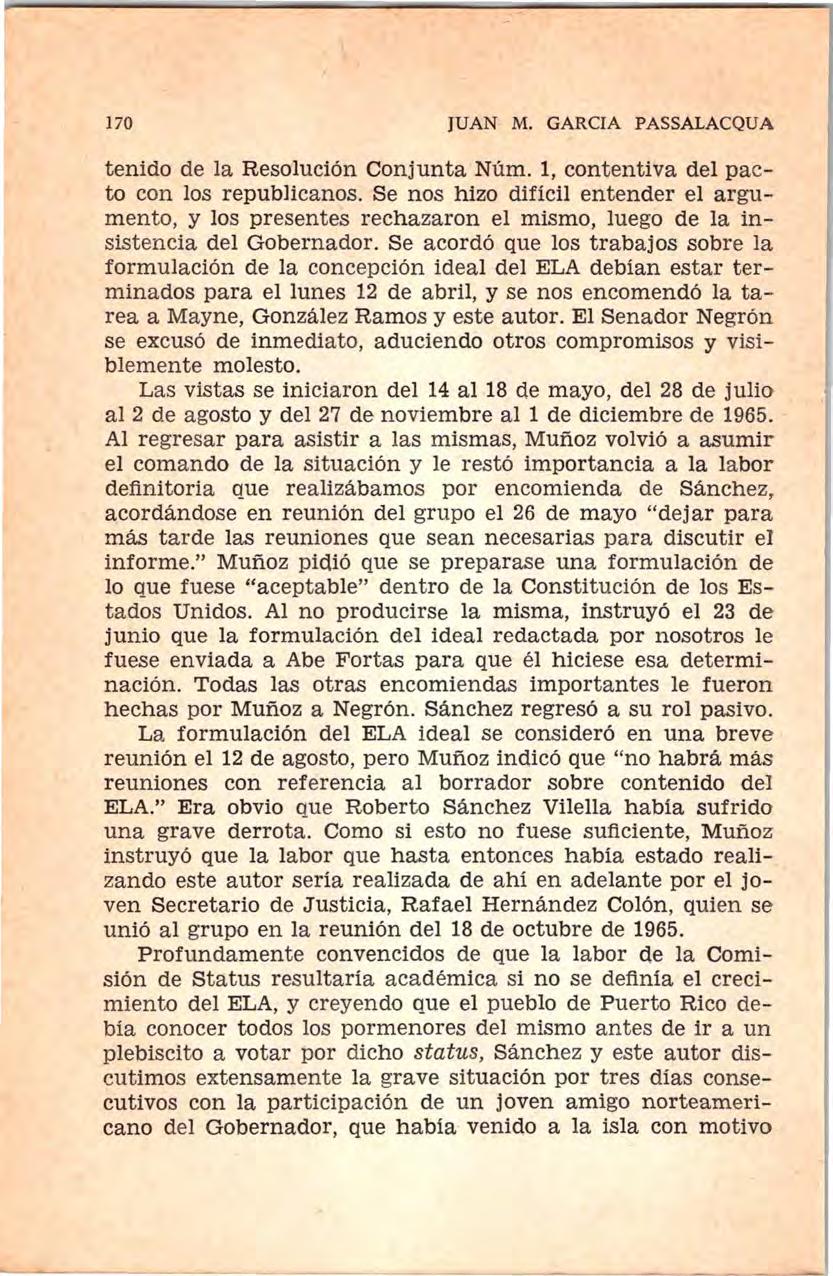 El 6 de febrero de 1965 se reunio por vez primera (luego d e la eleccion d e Sanchez ) el grupo qu e elaboraria la posicion del popularismo ante Ios Estados Unidos. Estabamos el Gober nador, Mufi.oz, Negron, Moscoso, Trias , Felipe Viscasillas (ayudante de Mufi.oz) , Alvin Mayne (ex consultor de la Junta de Planificacion), Juan Gonzalez Ramos (su ayudante ) y este au tor. La citacion fue recibida en La Fortaleza por telefono desde Trujillo Alto. Desde el inicio, Mufi.oz tomo el comando inequivoco de la reunion. El Gobernador era meramente un observador interesado. A partir del 26 de febrero Ia Comision se reunio en Puerto Rico para planear extensas, per o poco relevantes, vistas publicas a celebrarse en abril. La negociacion se realizaria realmente en Ios recesos , almuerzos y cocteles, tras bastidor es . Abe Fortas jugo un papel principal al abogar el 31 de marzo por una "propuesta minima " de desarrollo del ELA.