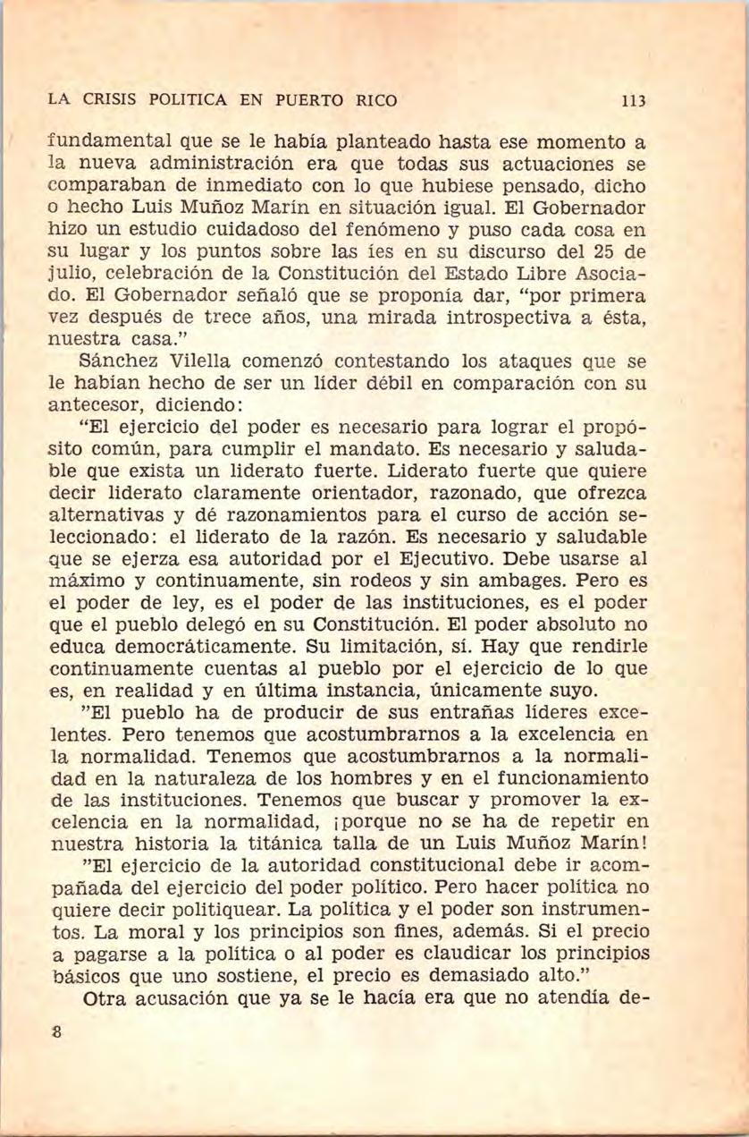 El 2 de enero, Mufi.oz le habia transferido a Sanchez Vilella los poderes constitucionales del Gobernador. Pero en los meses siguientes se hizo evidente que era imposible ejercer esos poderes con efectividad para la tan necesaria renovaci6n total sin adquirir y ejercer al mismo tiempo el poder politico.