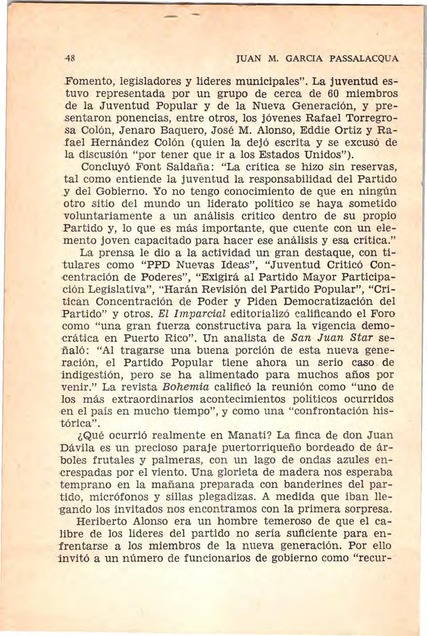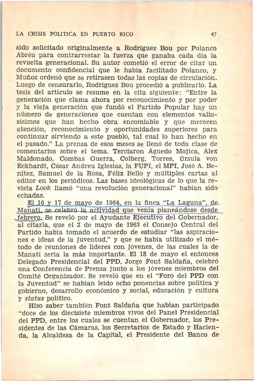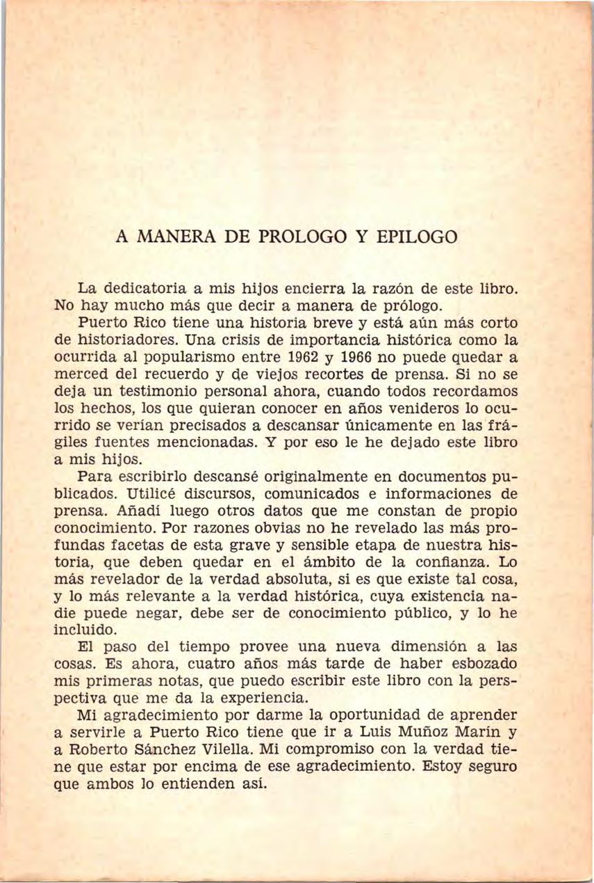 Puerto Rico tiene una historia breve y esta a un mas corto de historiadores. Una crisis de importancia hist6rica coma la ocurrida al popularismo entre 1962 y 1966 no puede quedar a merced del recuerdo y de viejos recortes de prensa. Si no se deja un testimonio personal ahora, cuando todos recordamos los hechos , los que quieran conocer en afios venideros lo ocurrido se verian precisados a descansar unicamente en las fragiles fuentes mencionadas. Y por eso le he dejado este libro a mis hijos.