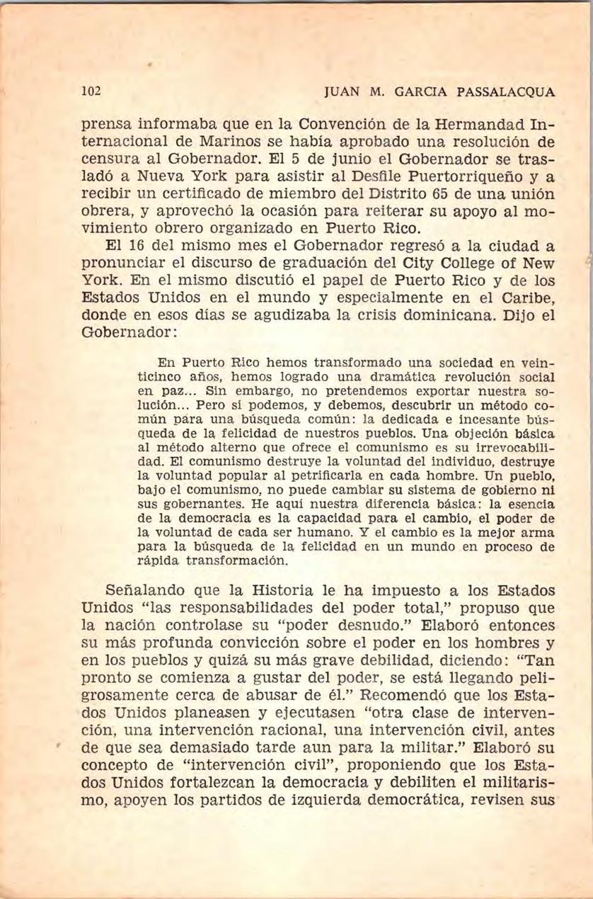 El Gobernador habia explicado coma lograrlo en un discurso anterior en honor a Jesus T. Pinero, primer Gobernador puer t or riquefio, diciendo: "Servirle a su pueblo fue su unica causa , su profunda y sencilla ideologia .. . ; representa para nues t ro pueblo, no la precipitacion, s ino l a reflexion; no la superficialidad, sino la profundidad; no la histeria, • sino la calma; no la estridencia, sino la cla rida d; no la laxitud, sino la iniciativa ... En el dialogo, al igua l que en la accion, nuestro pueblo espera de sus lideres la va lentia prudente , la prudencia constructiva y creadora."